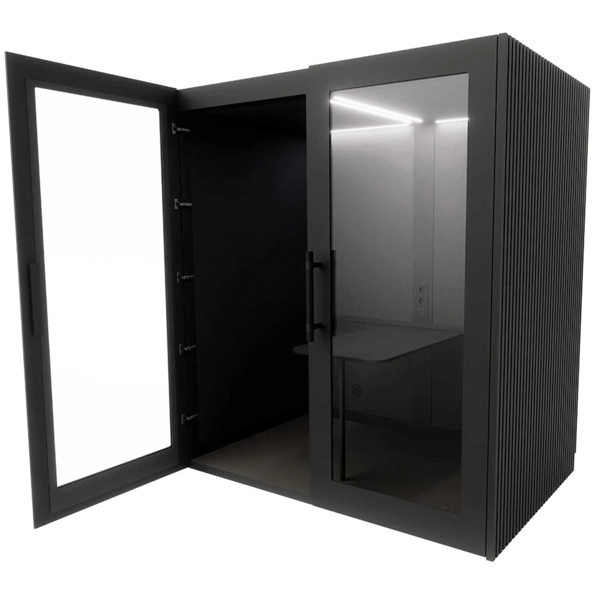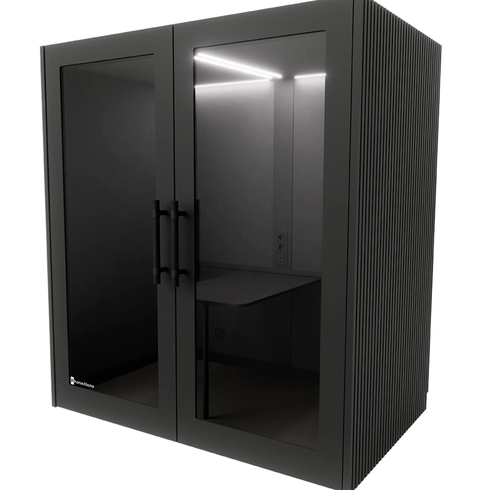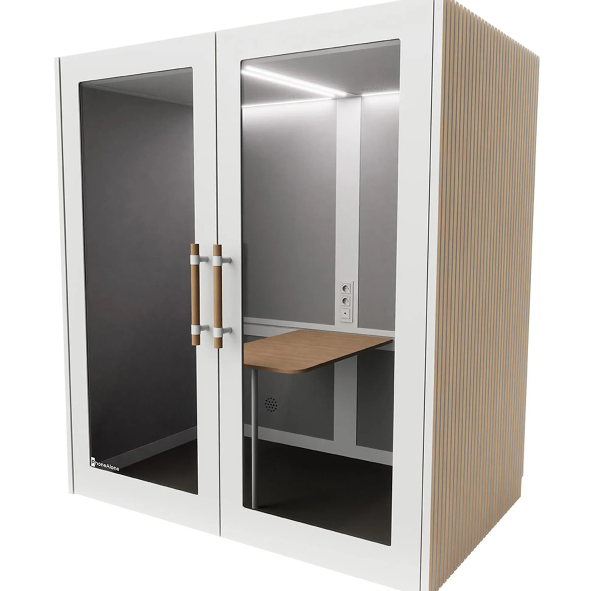 Mødeboks, der fungerer som stillerum er ideelt til storrumskontorer. PhoneAlone’s mødeboks er til 4 personer og er udstyret med seks ventilatorer for et bedre indeklima, som aktiveres af en bevægelsescensor, som samtidigt også aktiverer lys og strøm i mødeboksen. Bordet i PhoneAlone mødeboksen er monteret på en let metalskinne, således at bordet kan flyttes. Denne funktion gør det muligt at ”transformere” mødeboksen om til et kontor.