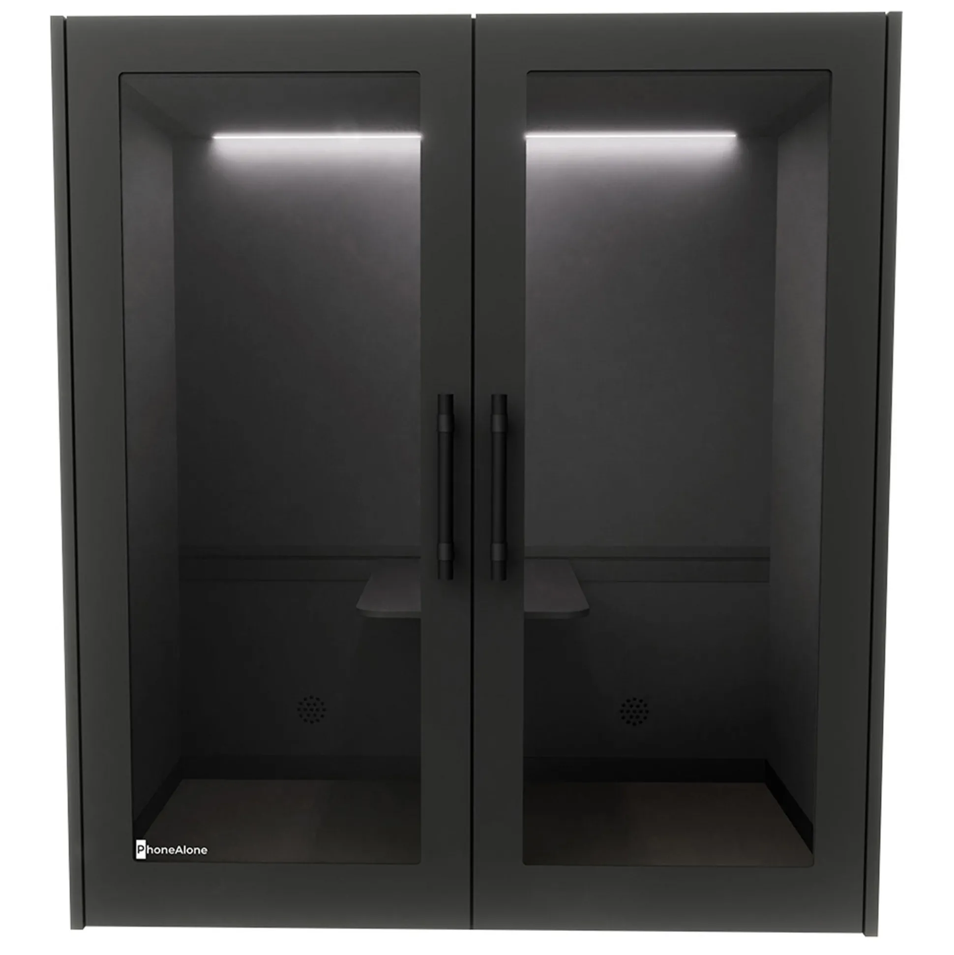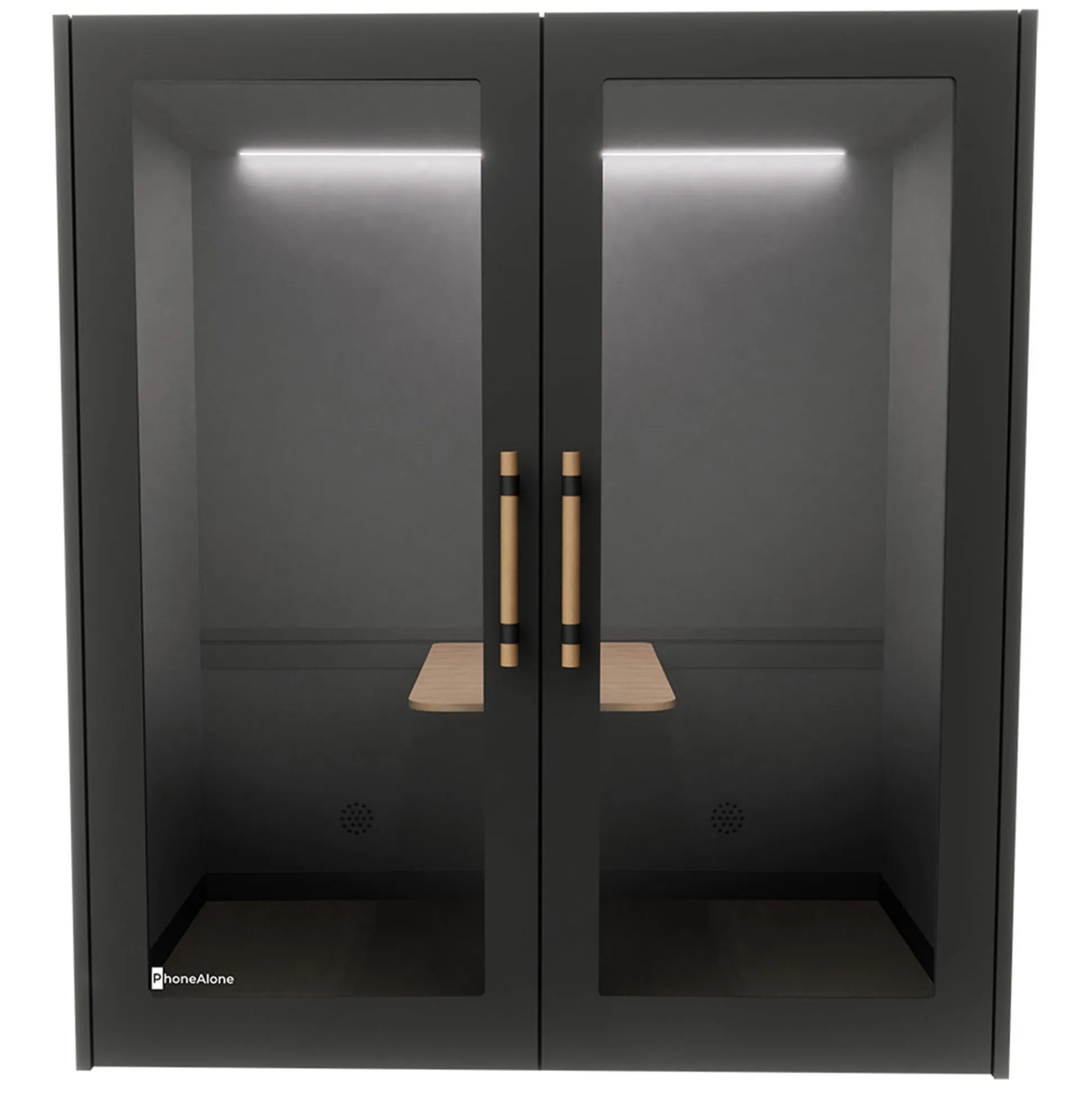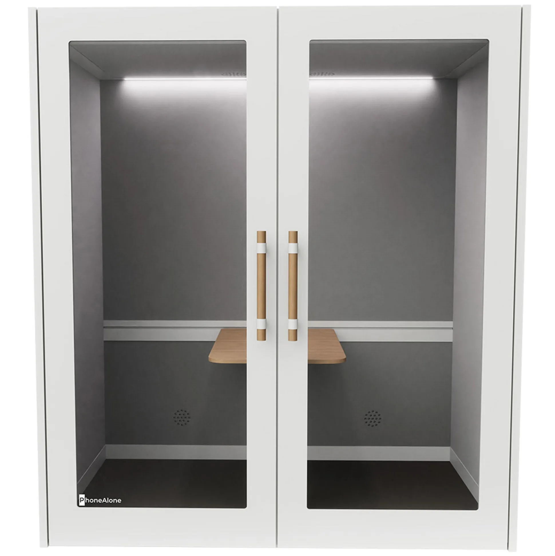 Mødeboks, der fungerer som stillerum er ideelt til storrumskontorer. PhoneAlone’s mødeboks er til 4 personer og er udstyret med seks ventilatorer for et bedre indeklima, som aktiveres af en bevægelsescensor, som samtidigt også aktiverer lys og strøm i mødeboksen. Bordet i PhoneAlone mødeboksen er monteret på en let metalskinne, således at bordet kan flyttes. Denne funktion gør det muligt at ”transformere” mødeboksen om til et kontor.