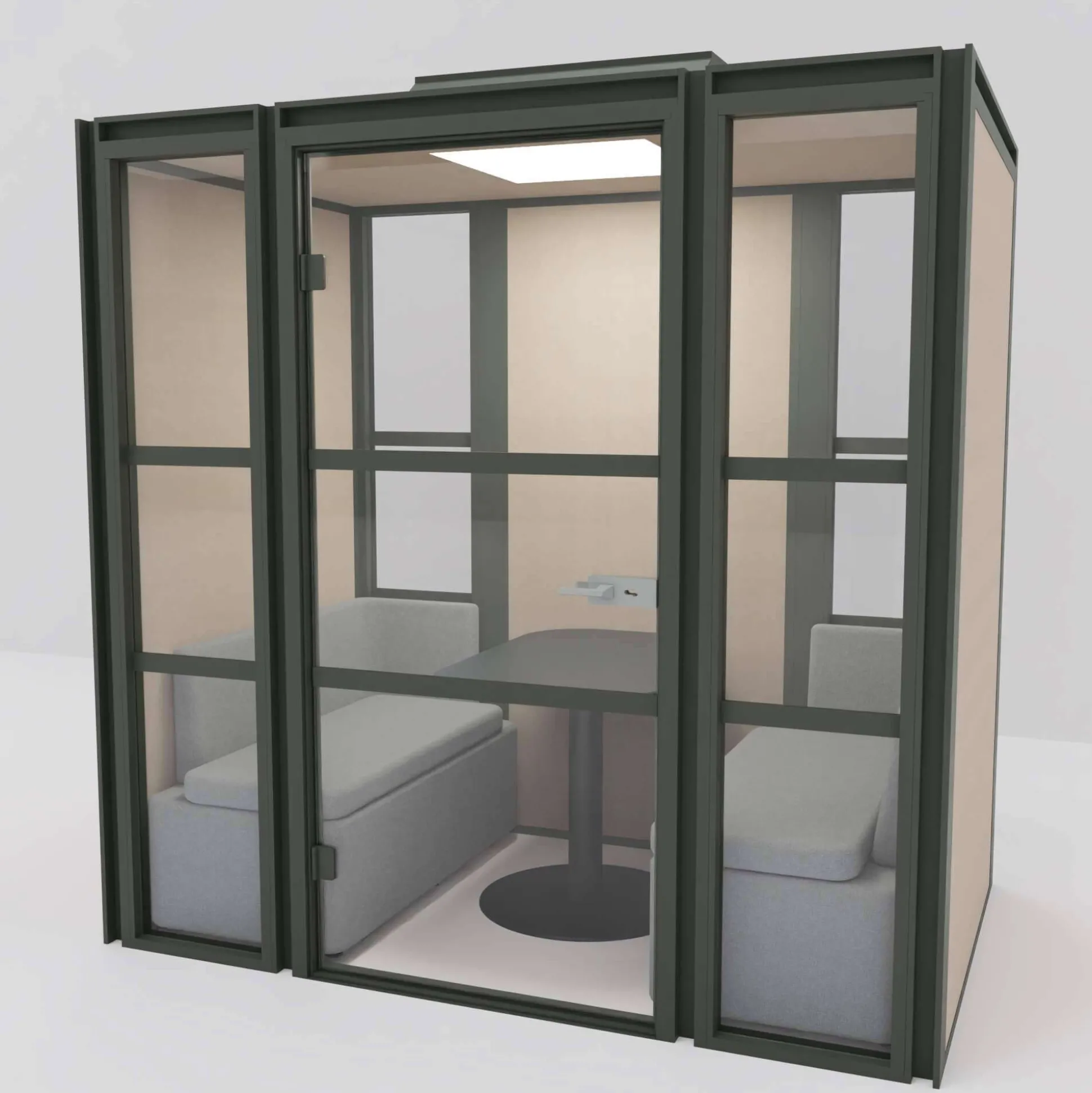 Stillerummet er konstrueret i alu rammer. I nogle af rammerne er der fyldt lydabsorberende materiale i og beklædt med Medley stof (100% polyester), i de resterende alu rammer er der isat special lydisolerende glas. Da rummet er halvt i glas, sørger det for et naturligt lysindfald, hvilket gavner det generelle arbejdsmiljø. I dette stillerum følger der et bord og sofaer med, ønskes dette ikke kan det fravælges. I stillerummet er der autolys samt ventilationssystem, dette skaber et super godt arbejdsklima i rummet.