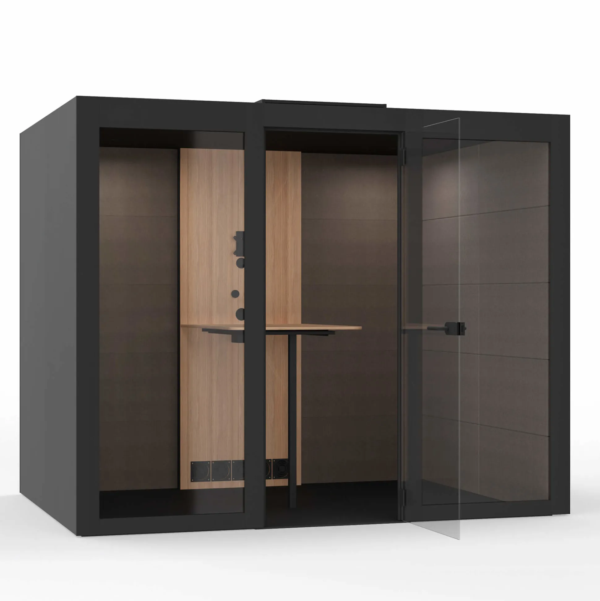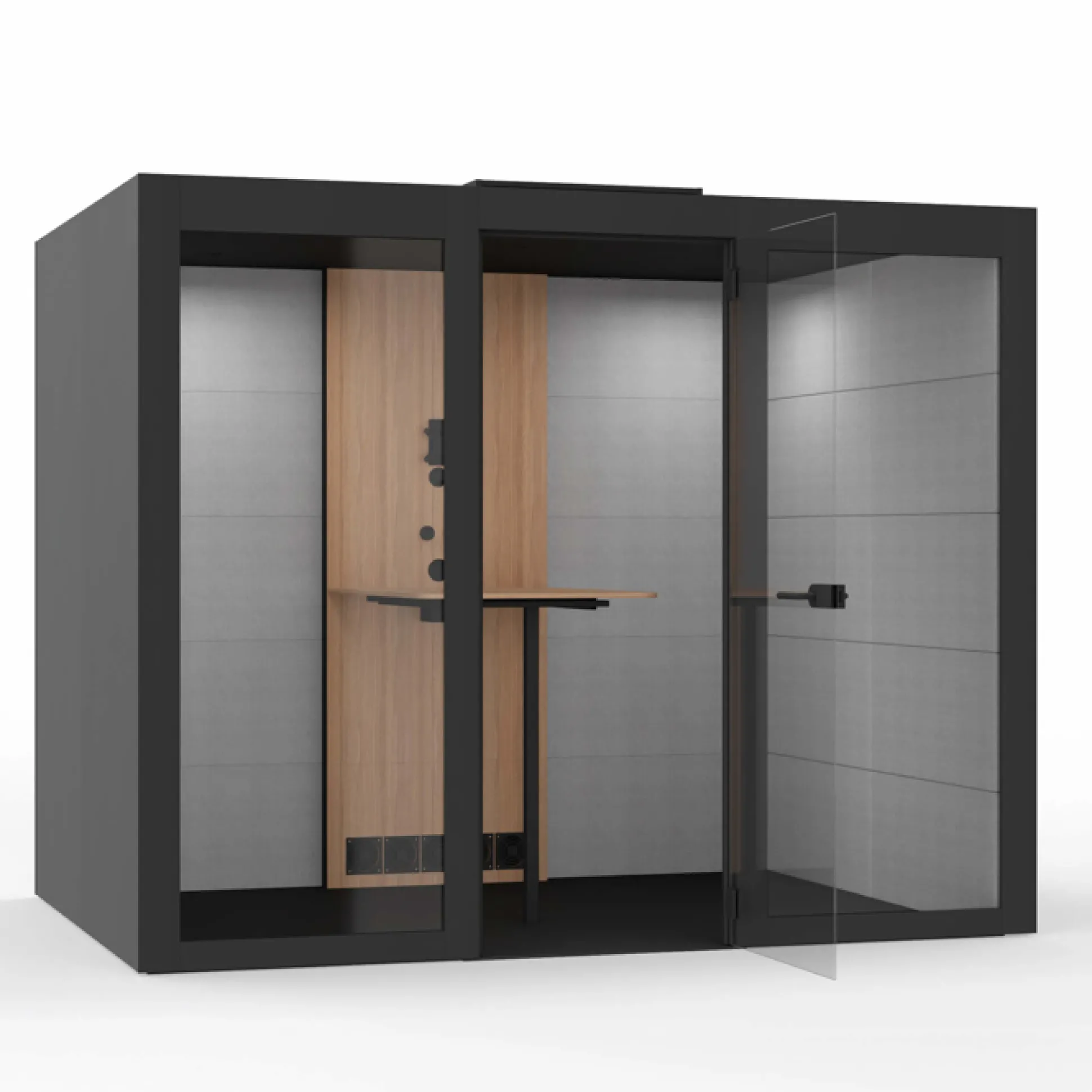 Denne mødeboks har flere forskellige lysindstillinger, ventilationsanlæg, et højbord, og en dør i tempereret glas. Døren leveres som standard højrevendt, men kan også fås venstrevendt. Bordet fås også i højde 72 cm.