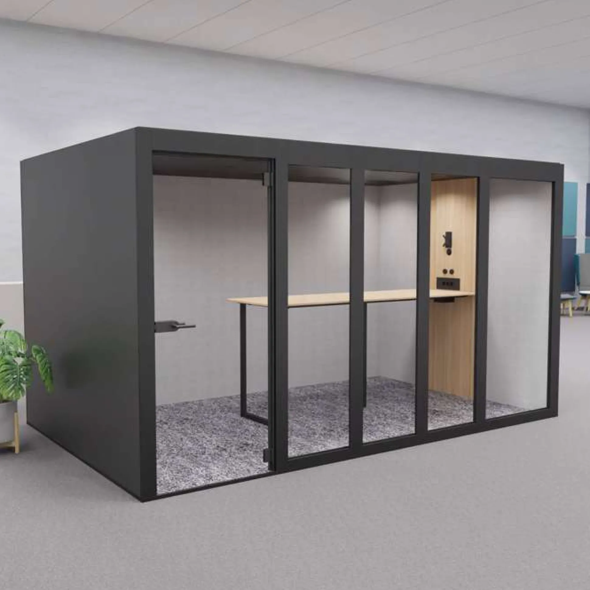 Denne mødeboks har flere forskellige lysindstillinger, ventilationsanlæg, højt bord og en dør i tempereret glas. Døren leveres som standard højrevendt med håndtaget i venstre side, men kan også fås venstrevendt.