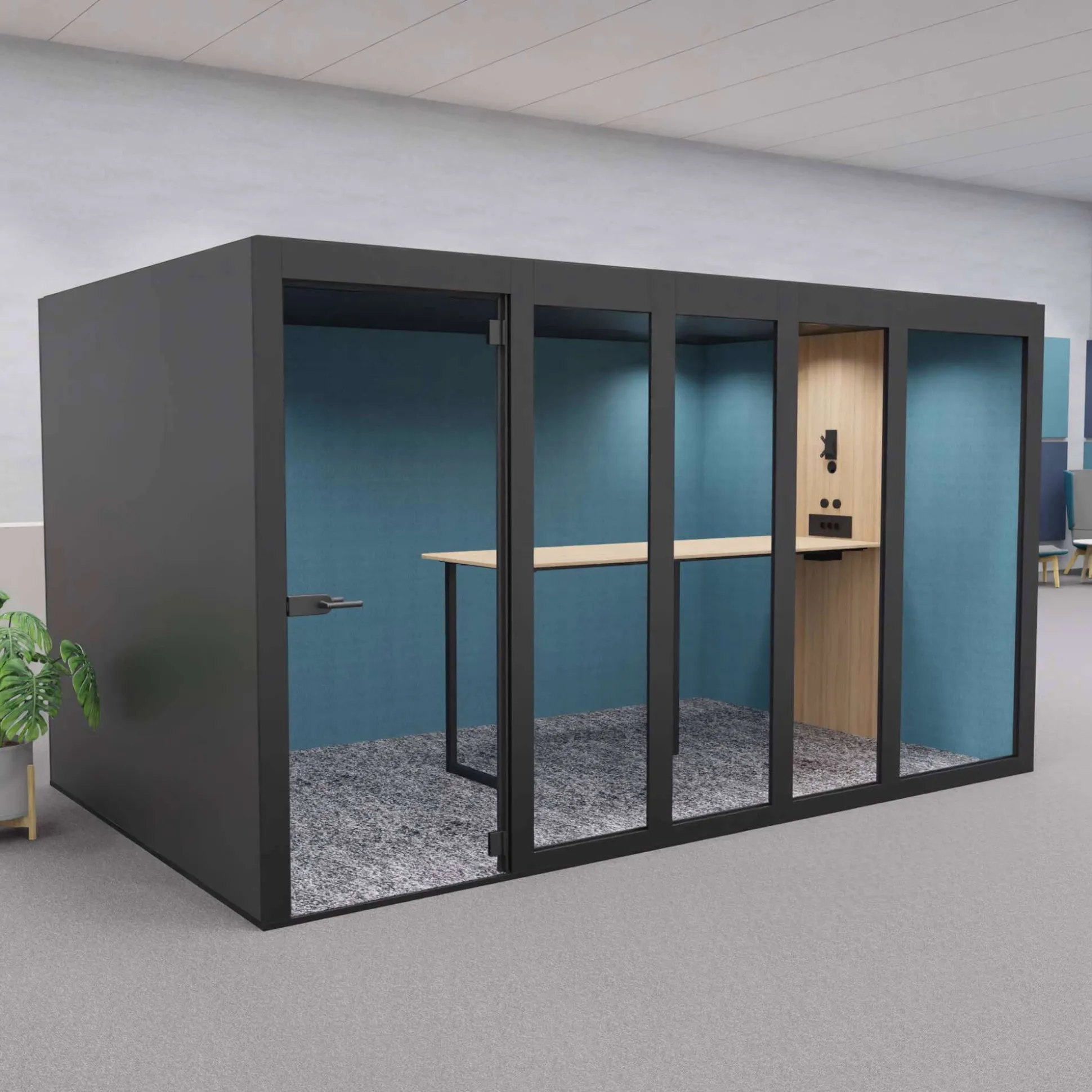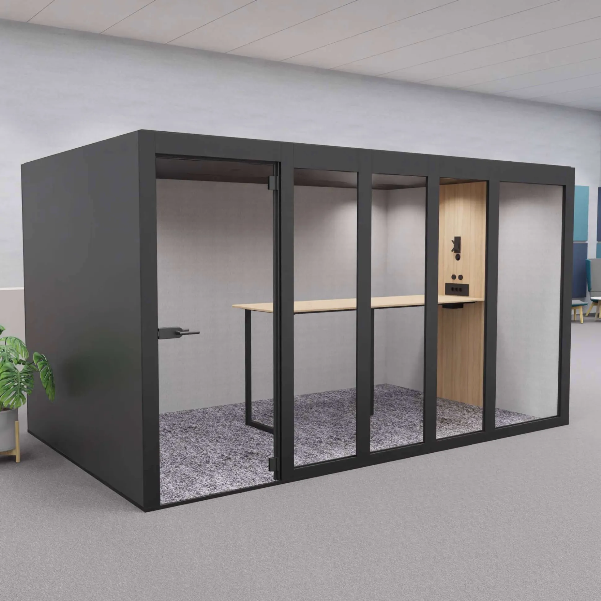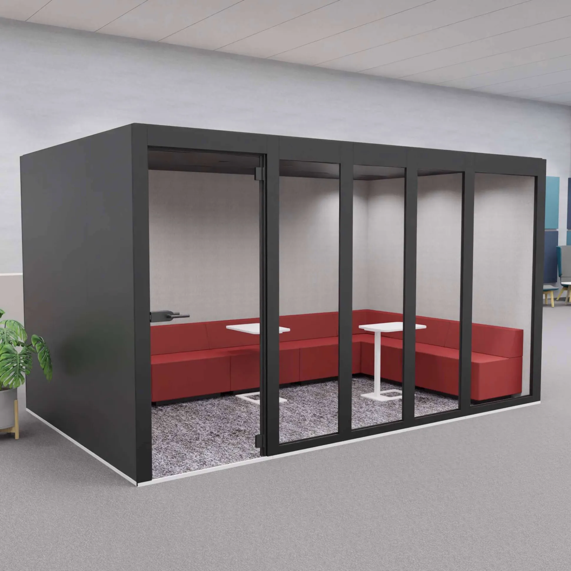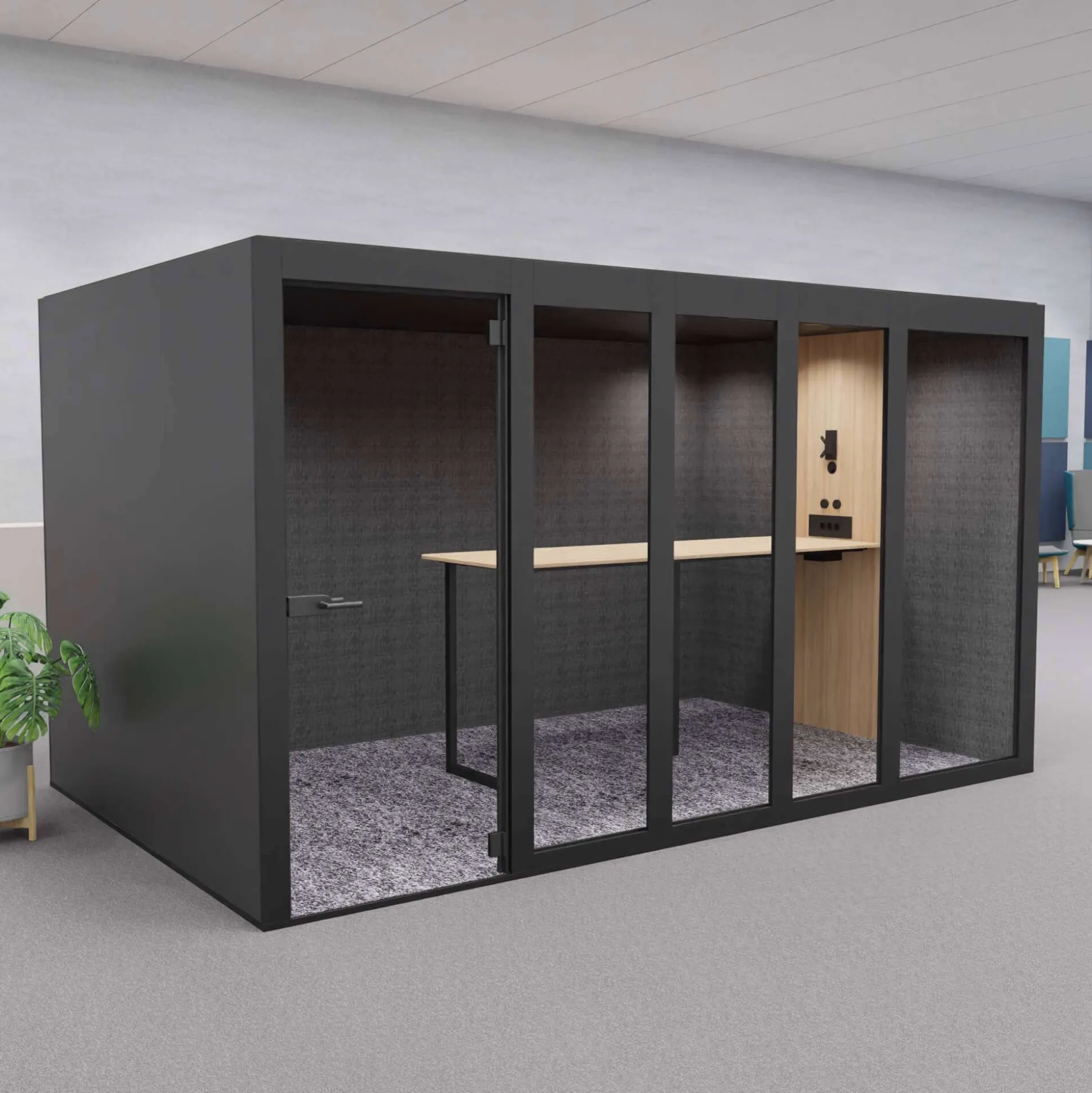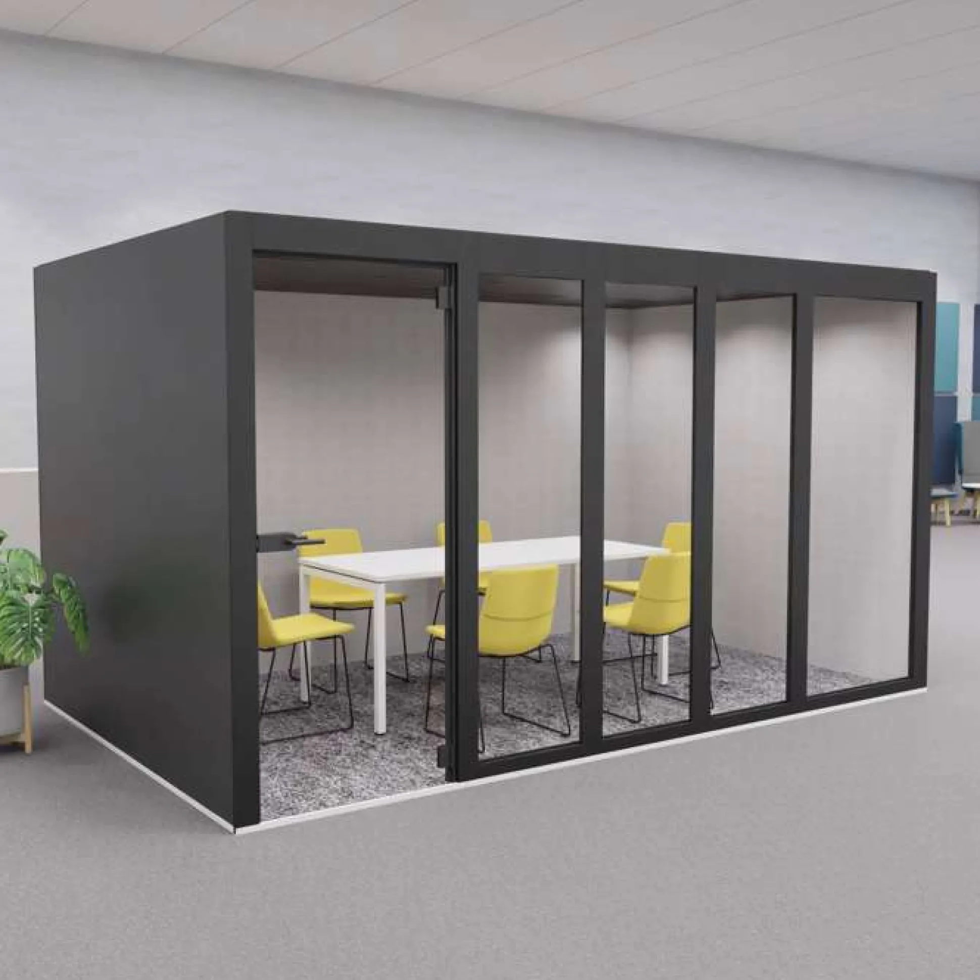 XT-XL mødeboks er et lyddæmpende og eksklusivt møderum ideel til åbne kontormiljøer, hvor der ikke er mulighed for at kunne gå afsides og holde møder. Møderummet er velegnet til 8 personer.