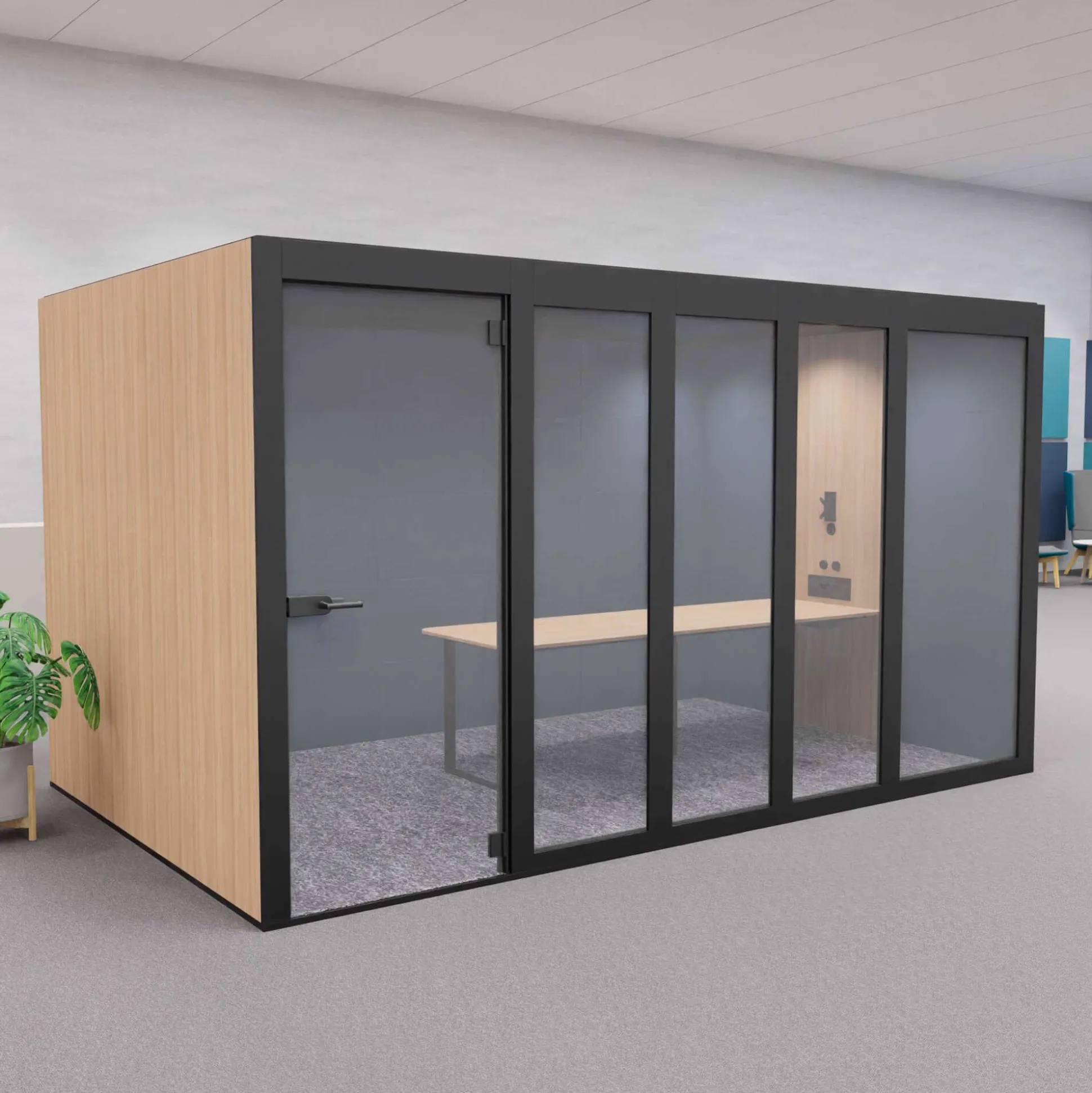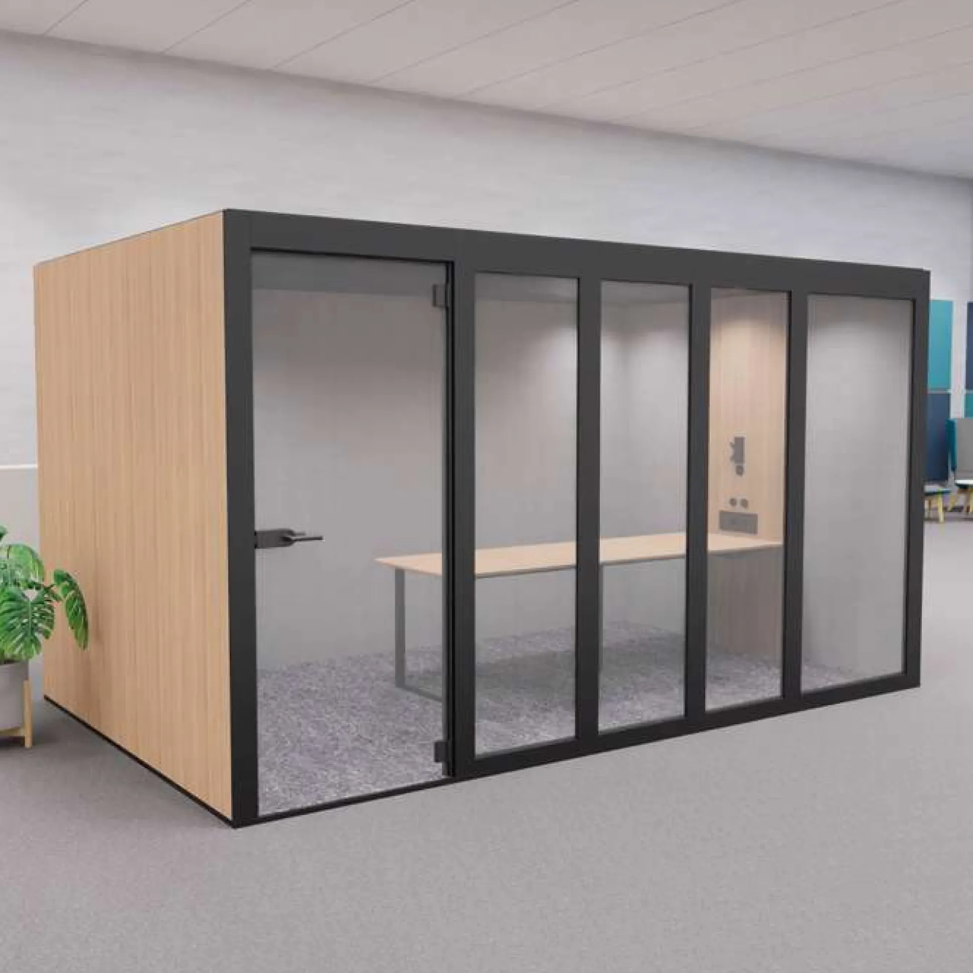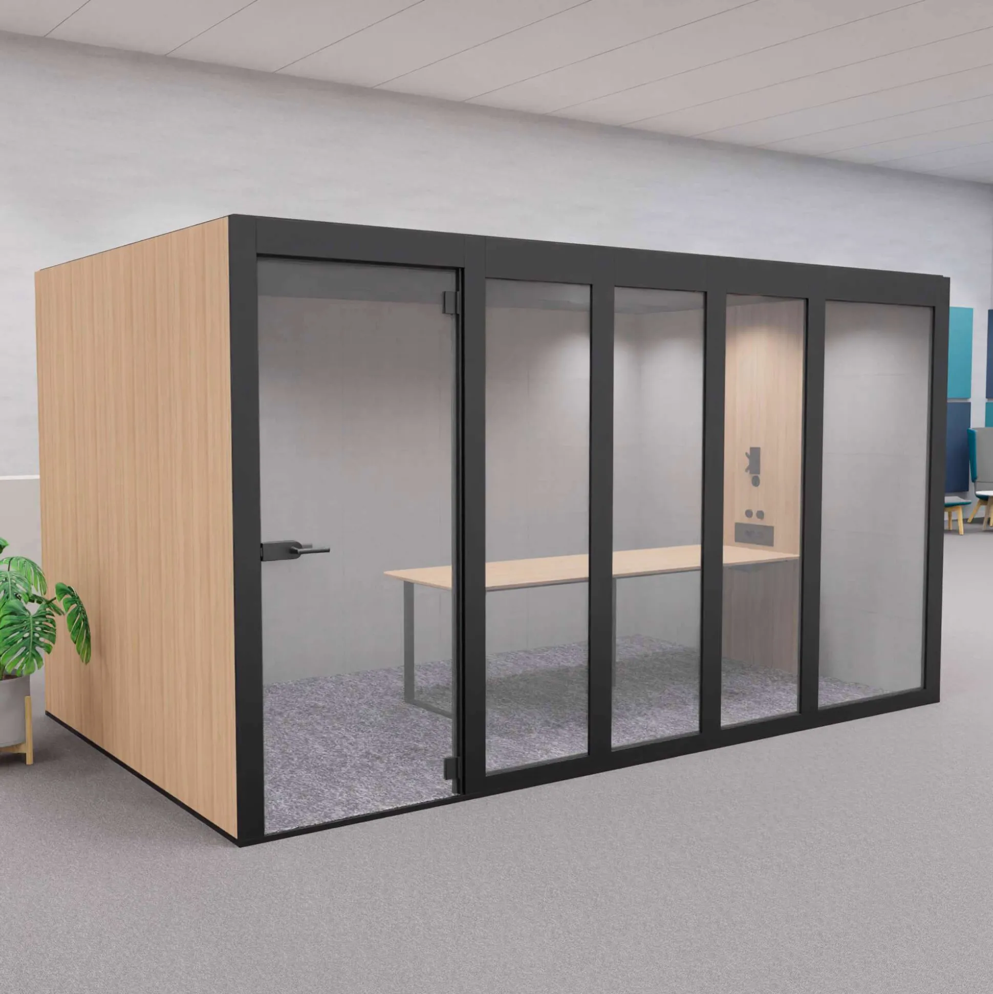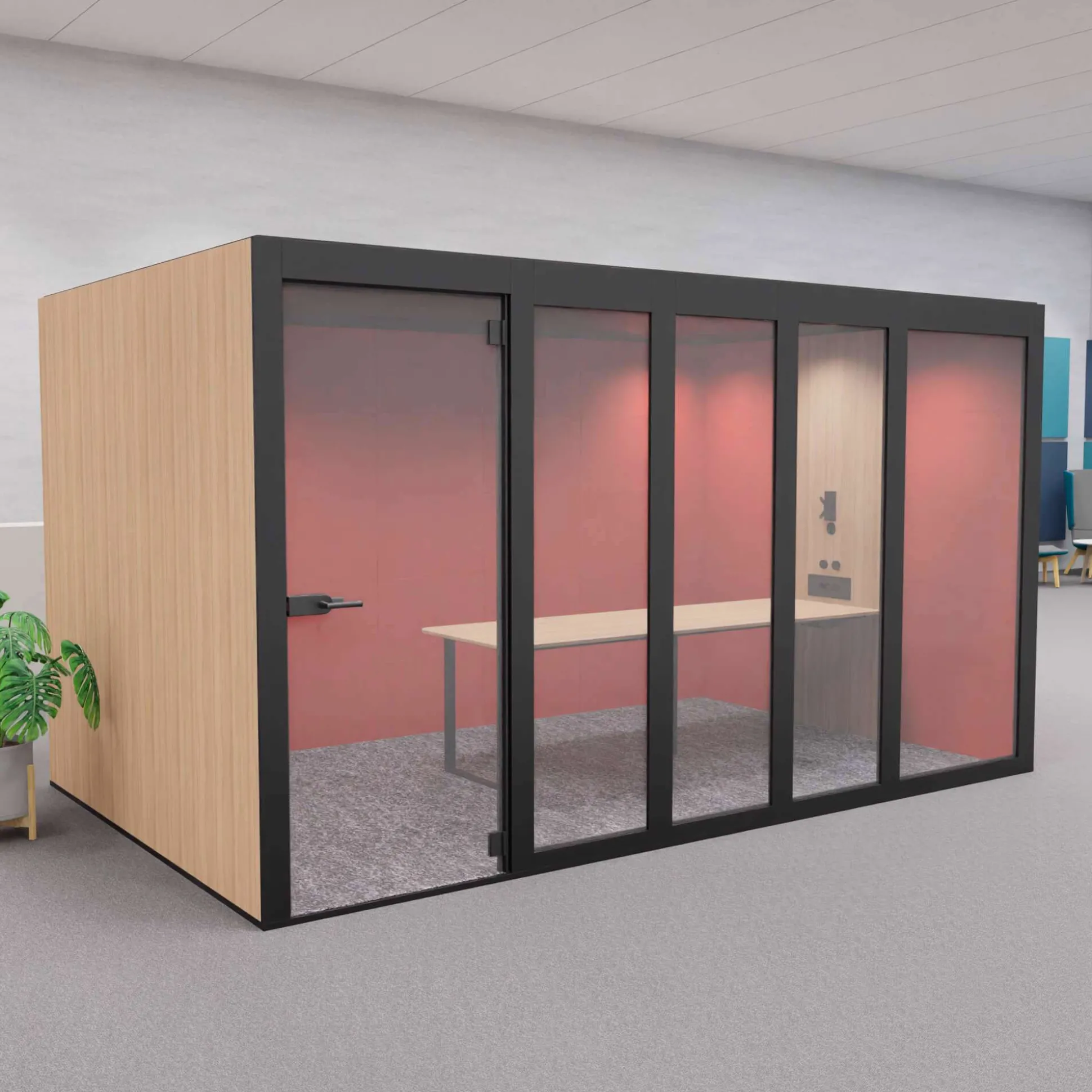 Denne mødeboks har flere forskellige lysindstillinger, ventilationsanlæg, lavt bord og en dør i tempereret glas. Døren leveres som standard højrevendt med håndtaget i venstre side, men kan også fås venstrevendt.