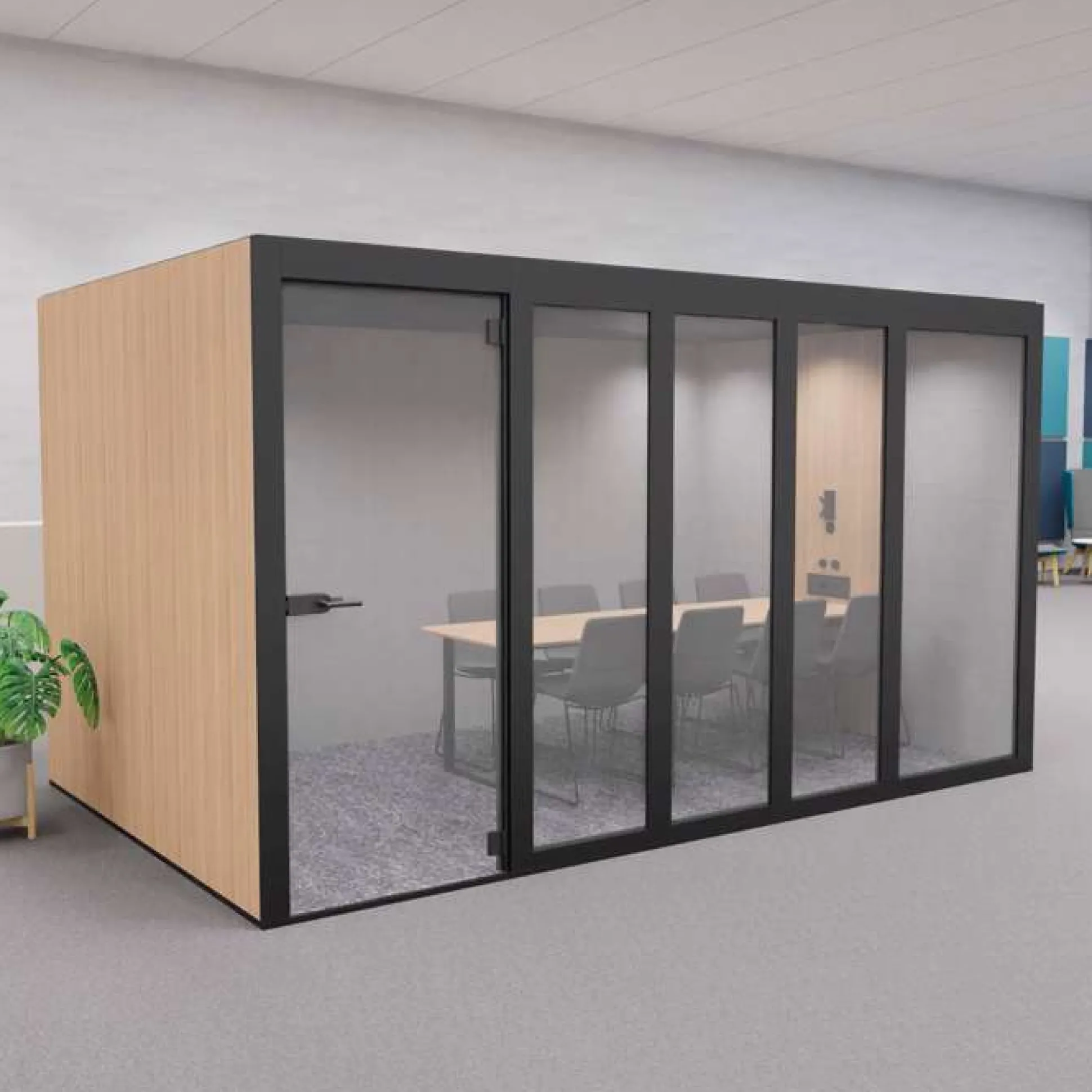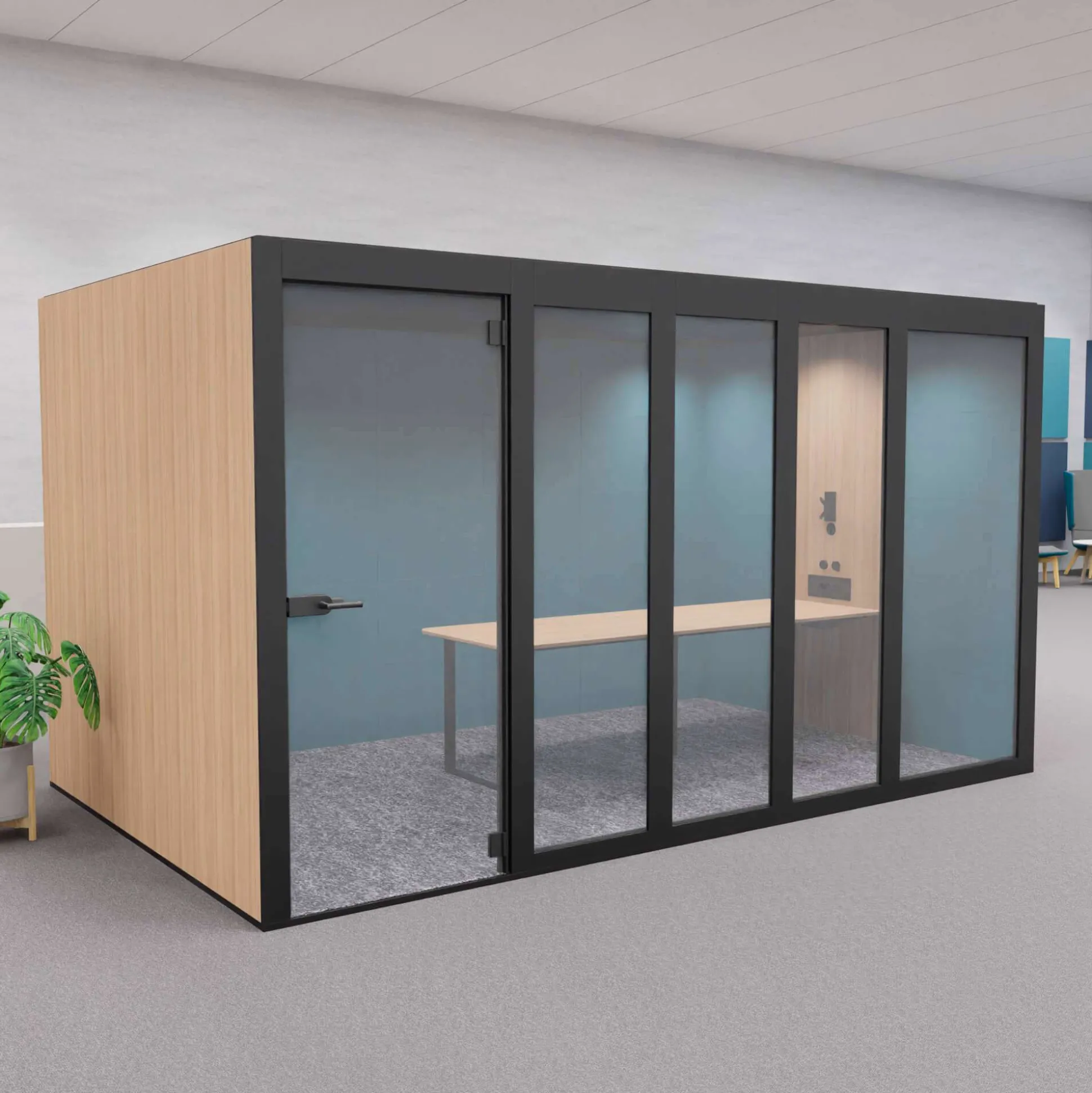 XT-XL mødeboks er et lyddæmpende og eksklusivt møderum ideel til åbne kontormiljøer, hvor der ikke er mulighed for at kunne gå afsides og holde møder. Møderummet er velegnet til 8 personer.