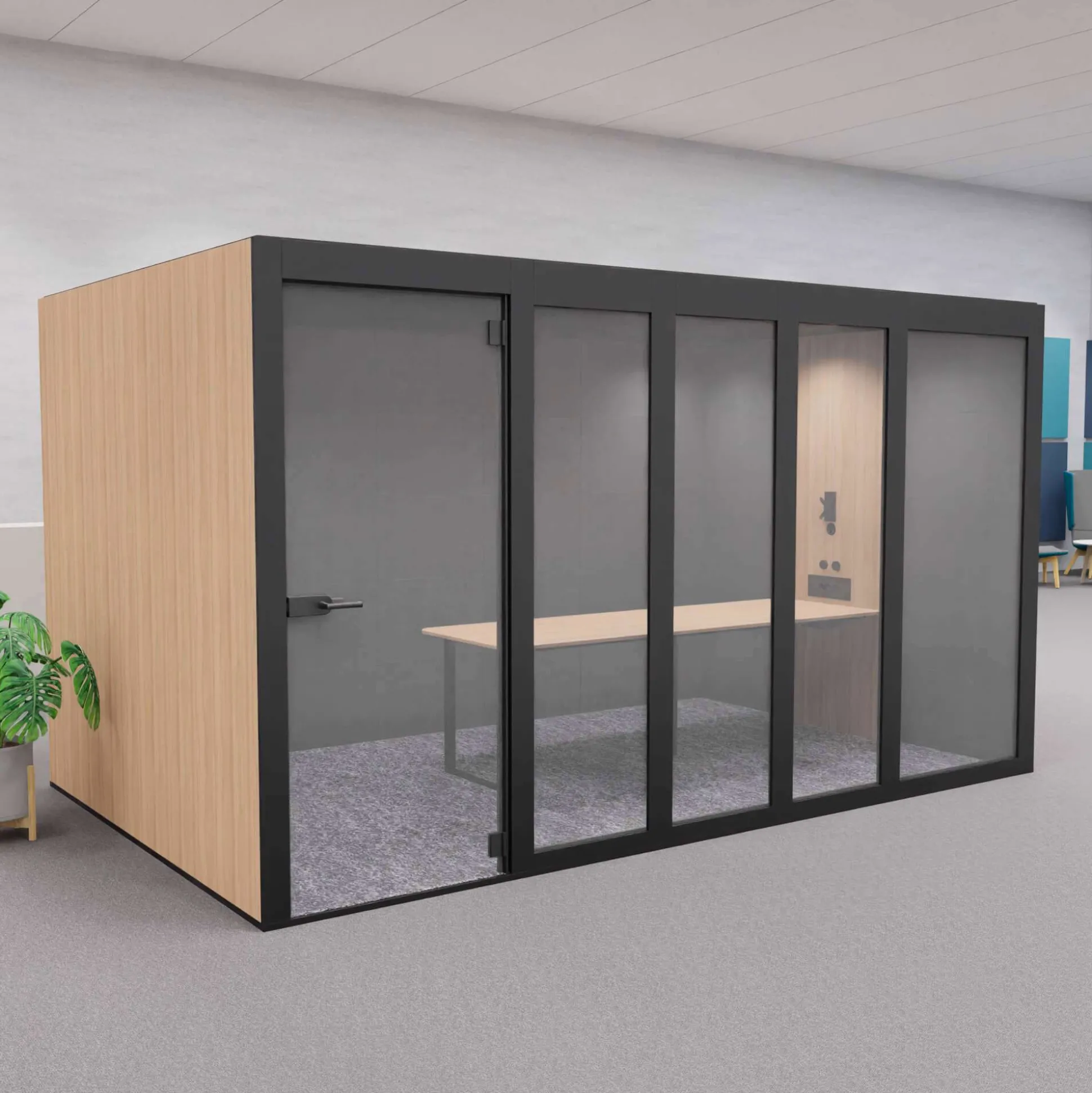 Lyddæmpende mødeboks med lavt bord til 8 personer