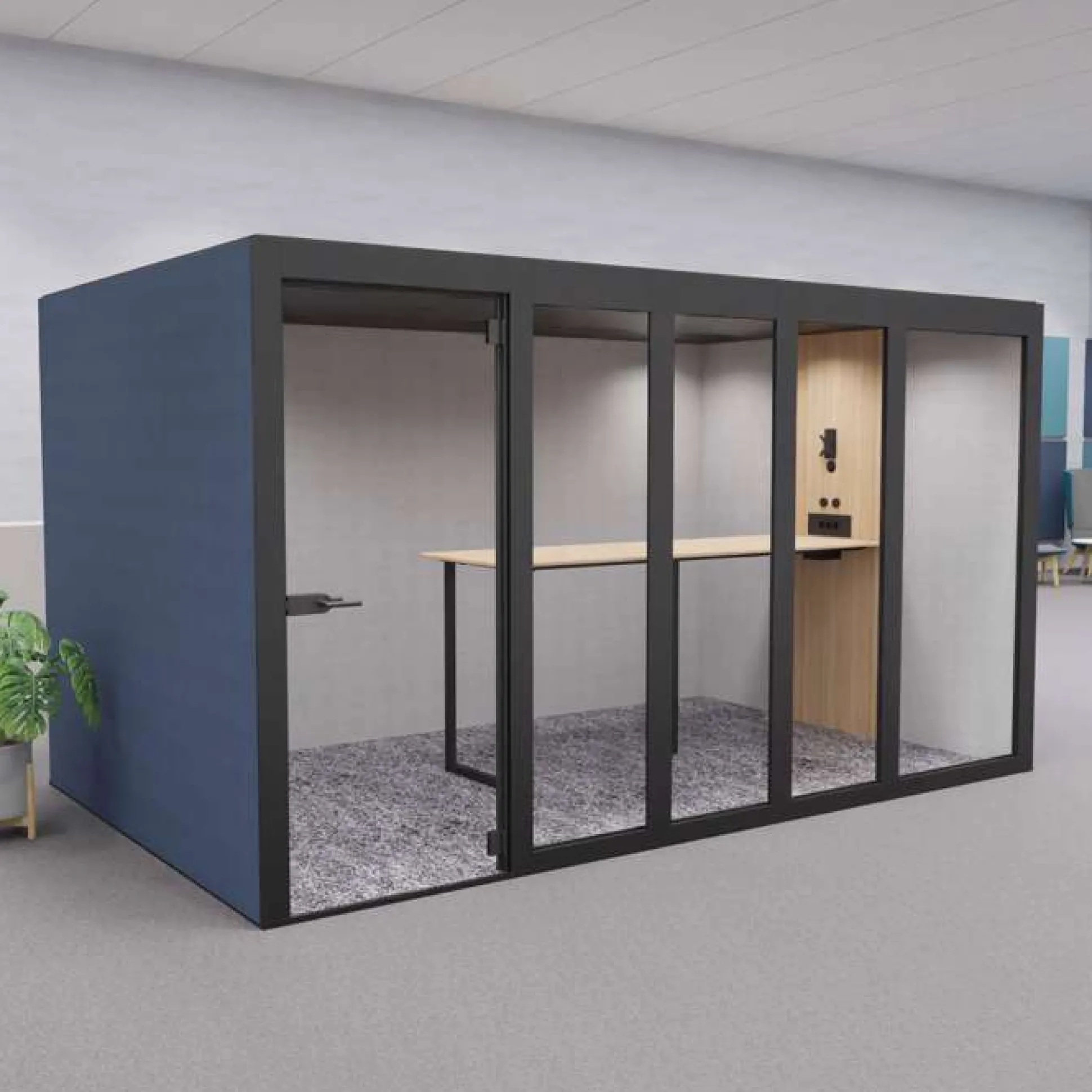 Denne mødeboks har flere forskellige lysindstillinger, ventilationsanlæg, højt bord og en dør i tempereret glas. Døren leveres som standard højrevendt med håndtaget i venstre side, men kan også fås venstrevendt.