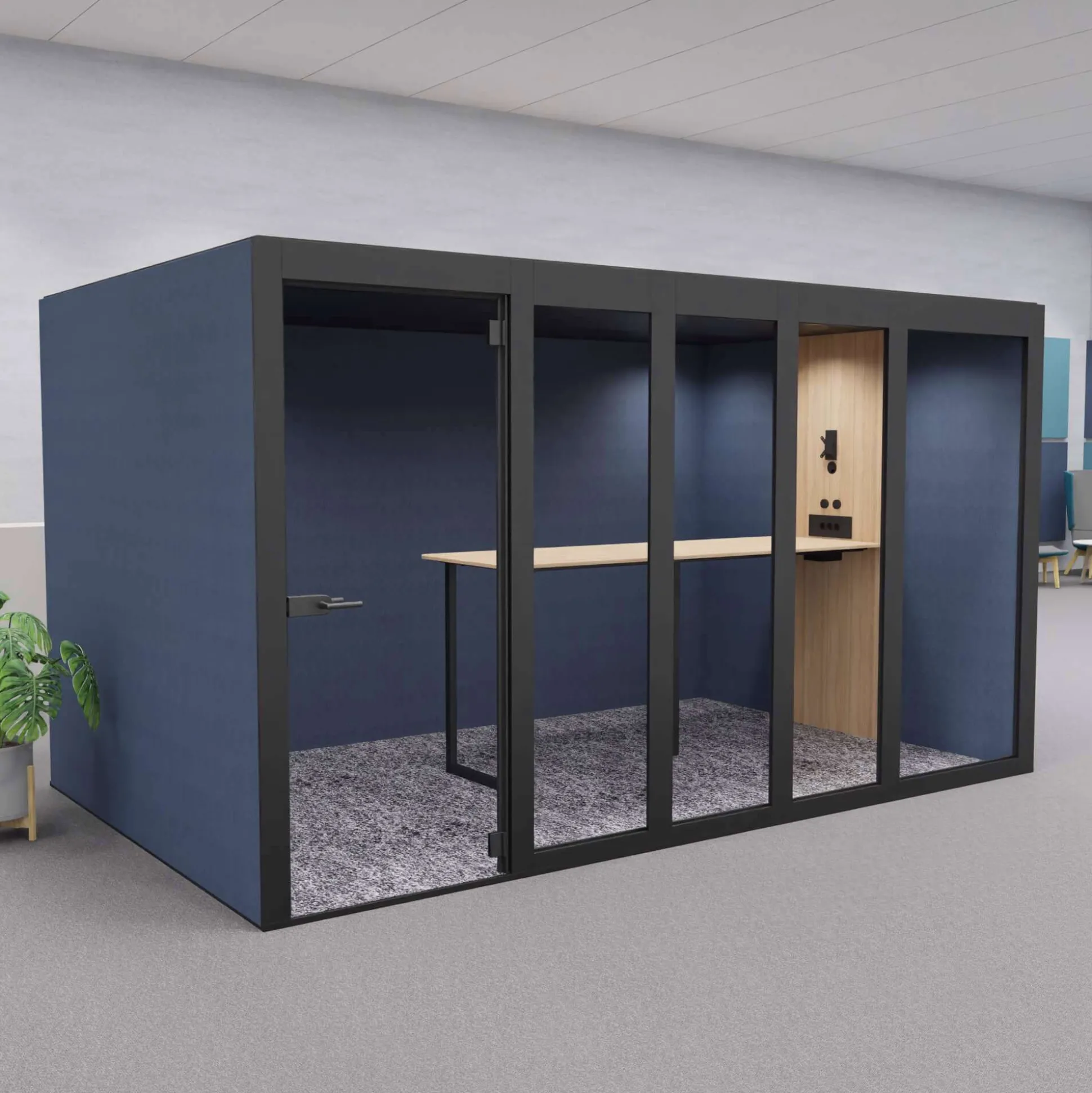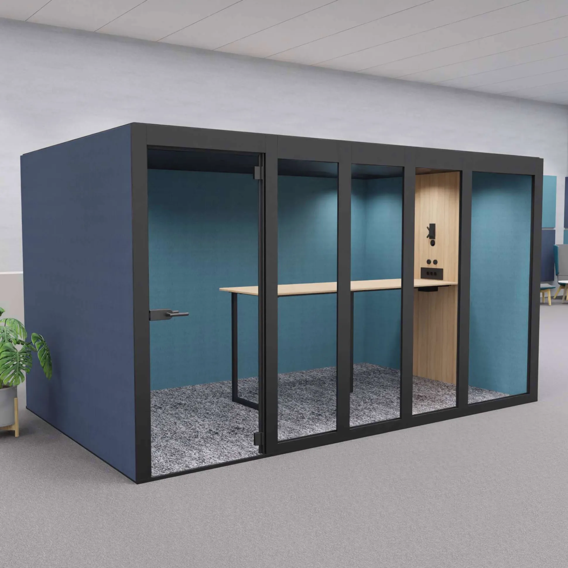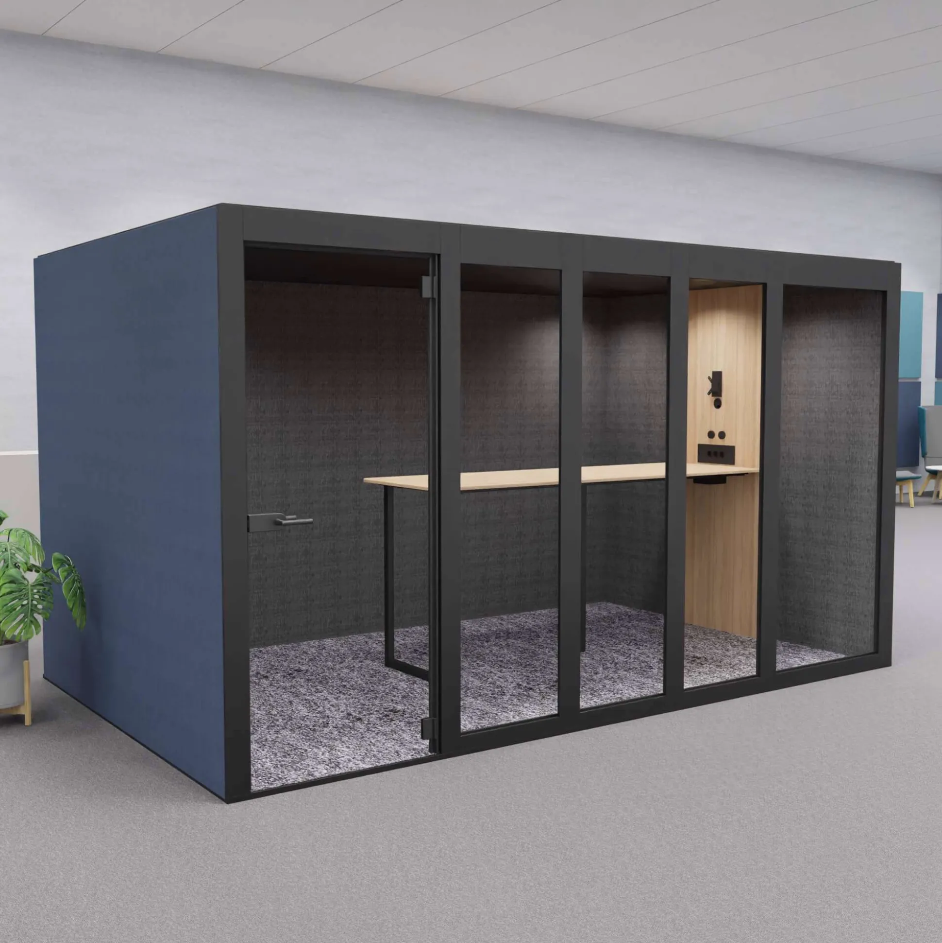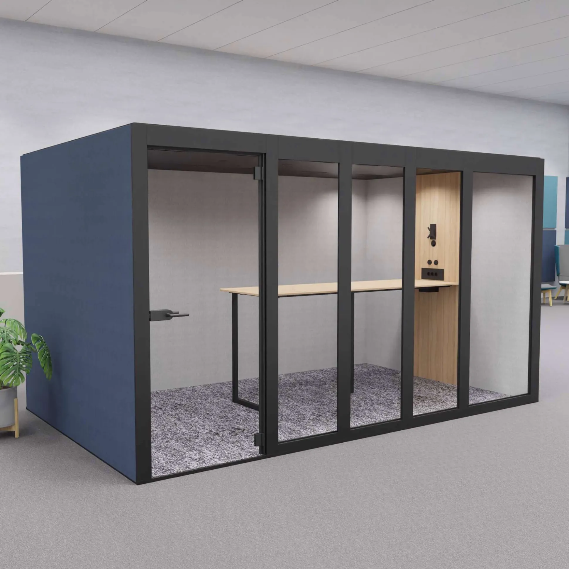 XT-XL mødeboks er et lyddæmpende og eksklusivt møderum ideel til åbne kontormiljøer, hvor der ikke er mulighed for at kunne gå afsides og holde møder. Møderummet er velegnet til 8 personer.