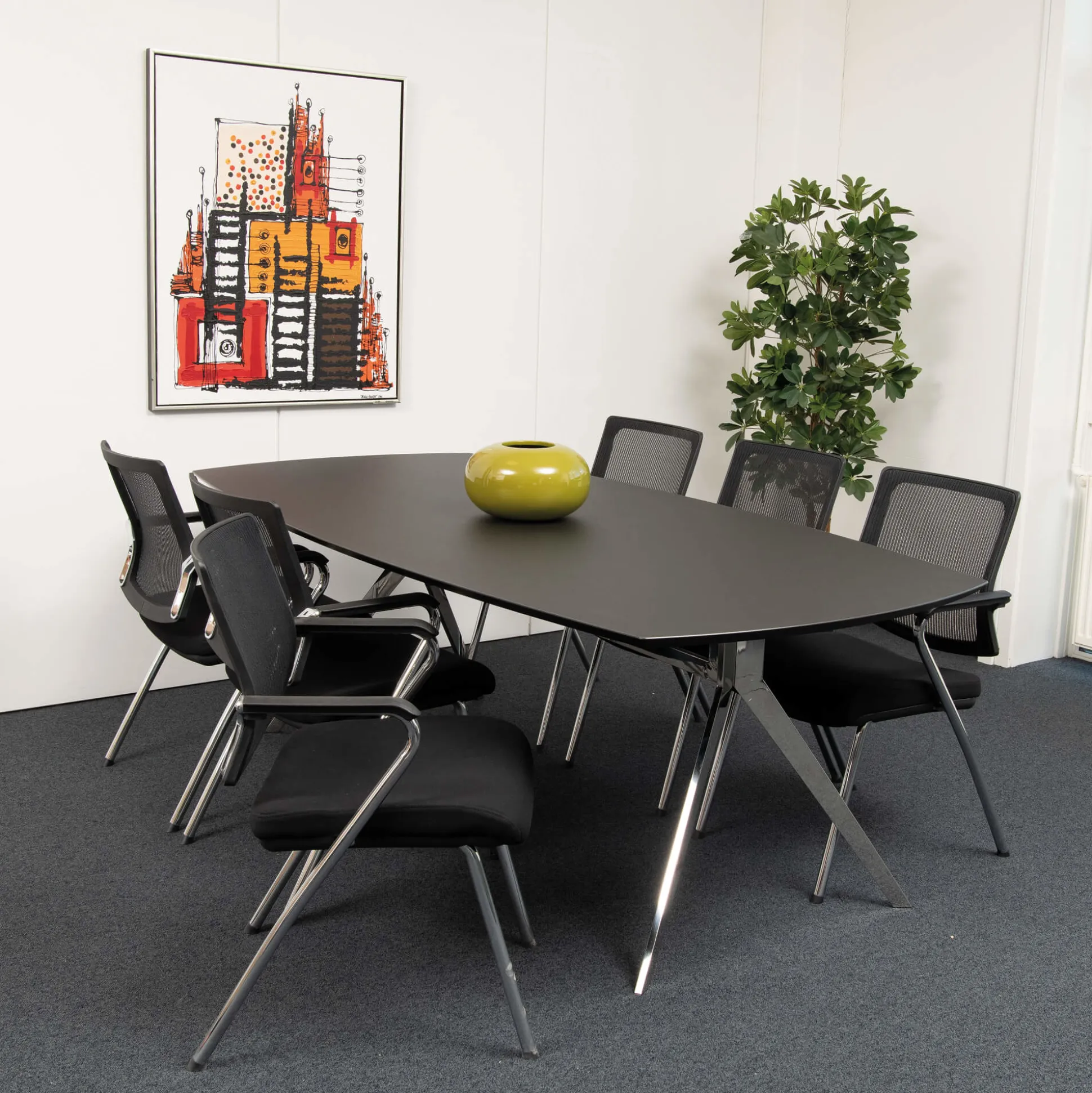 Flot mødebord med sort linoleums plade og blank stel.