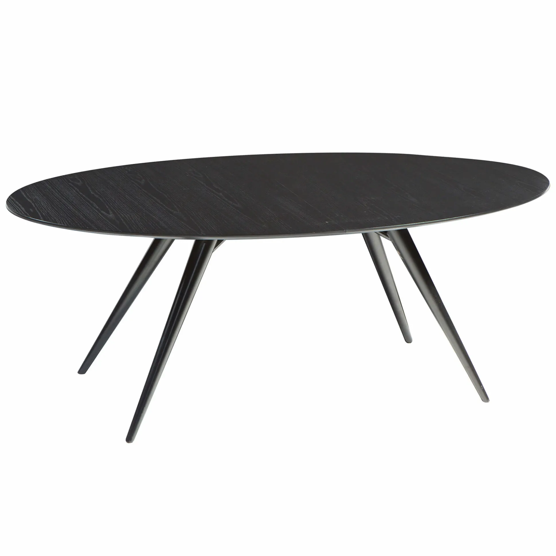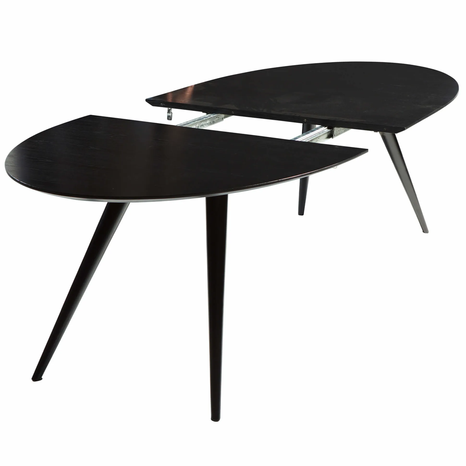 Elegant Eclipse mødebord som har en smuk oval form med koniske ben. Det er velegnet til både små kantiner og kontorlokaler. Når bordet er fuldt udstrakt, kan det passe 10-12 stole. Bordet leveres med 2 tillægsplader, der forlænger bordlængden fra 2 til 3 meter. Tillægspladerne monteres let, da bordpladen sidder på metalskinner, der gør dem ubesværet at glide fra hinanden. De holdes på plads af skjulte lukkebeslag under bordet. Tillægspladerne opbevares adskilt fra bordet. Bordbenene kommer i en pulverlakeret sort finish, som fuldender bordets udtryk.