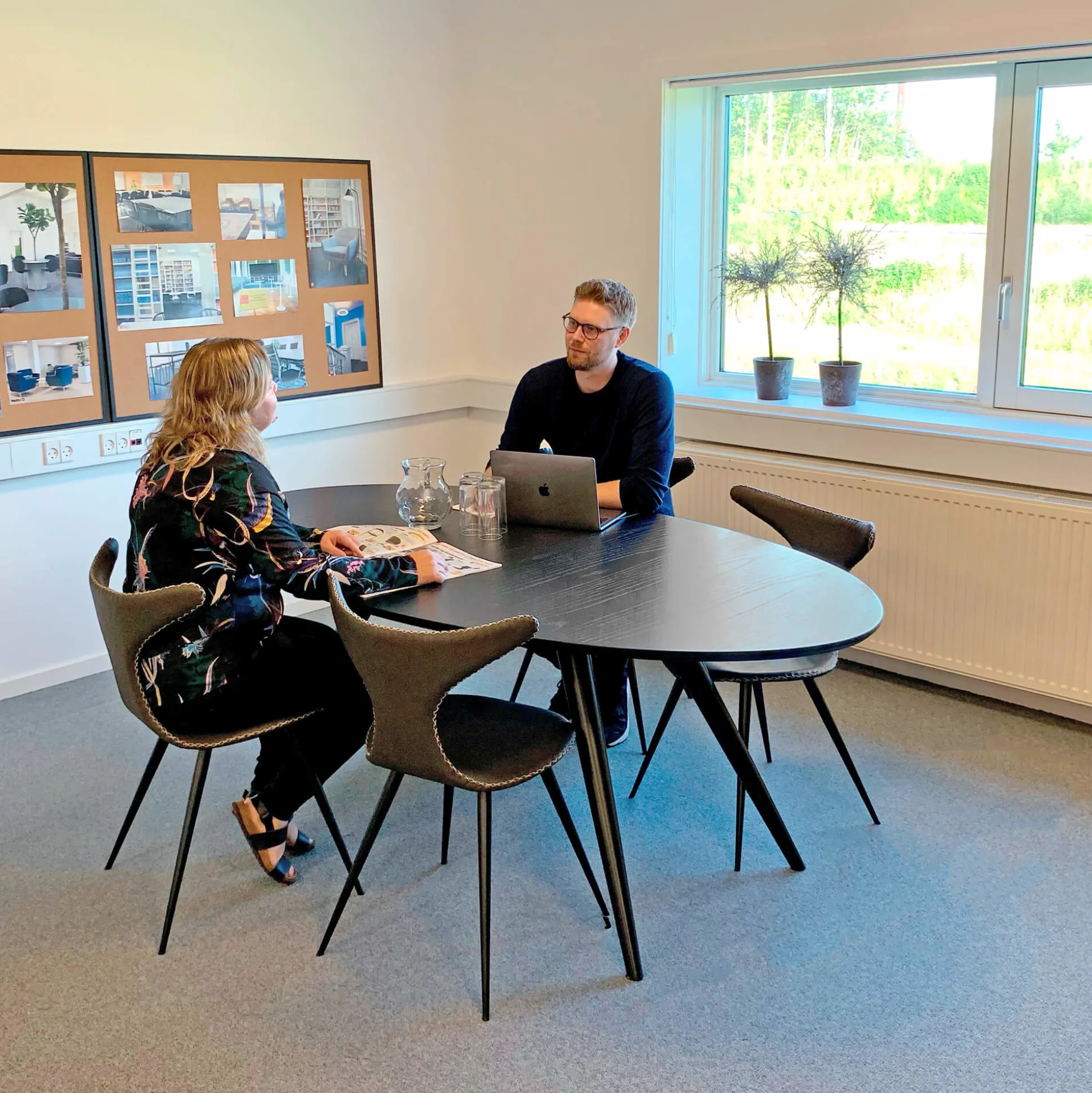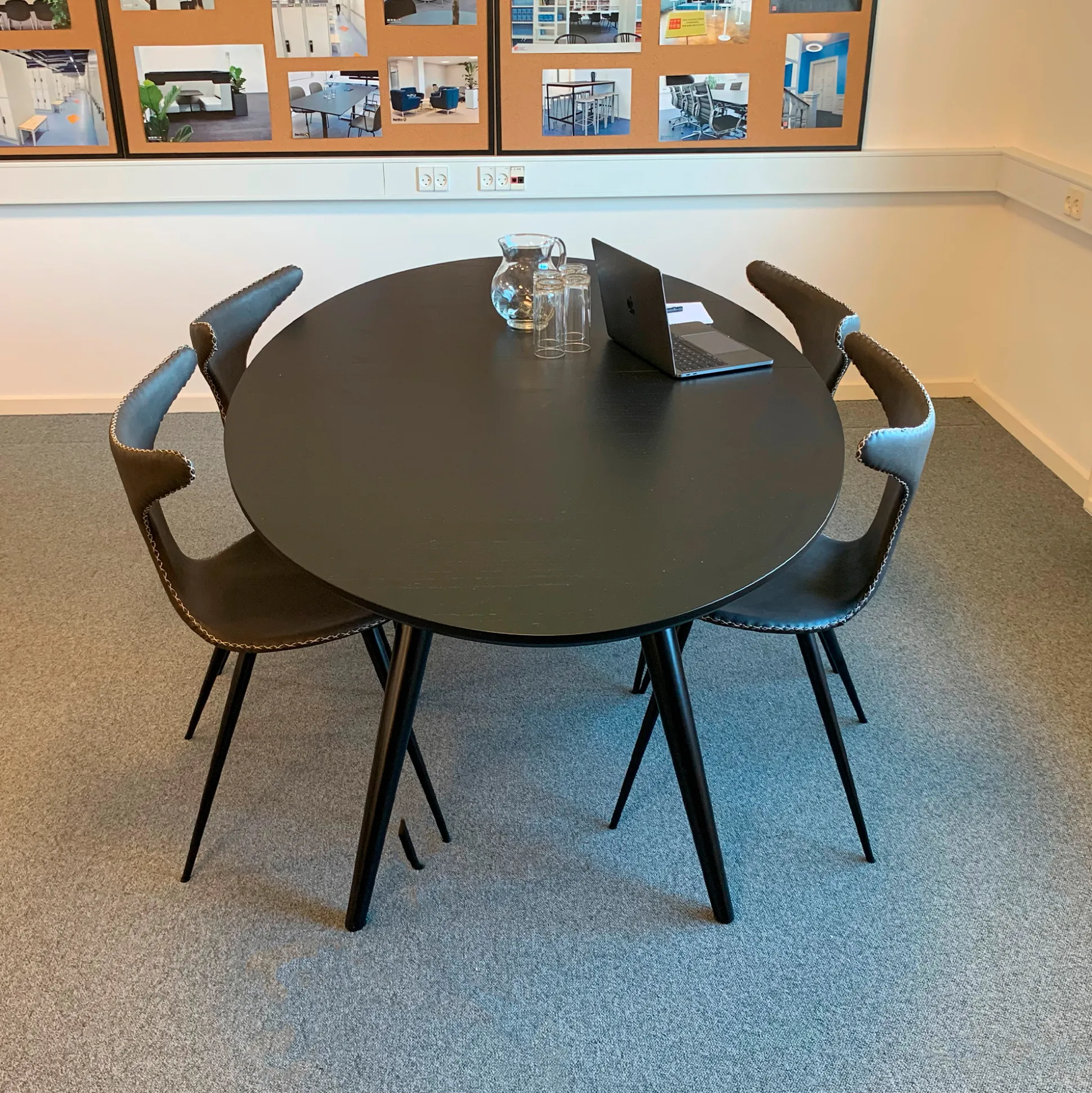 Elegant Eclipse mødebord som har en smuk oval form med koniske ben. Det er velegnet til både små kantiner og kontorlokaler. Der medfølger 4 Dolphin stole. Dolphin stolen er en ikonisk stol. Den har et tidløst, nordisk design. Sædet er baseret på en form i bøjet træ, hvilket øger siddekomforten til de lange møder. Der medfølger også 2 tillægsplader, så bordet kan blive 3 m. hvis der skal afholdes større møder.