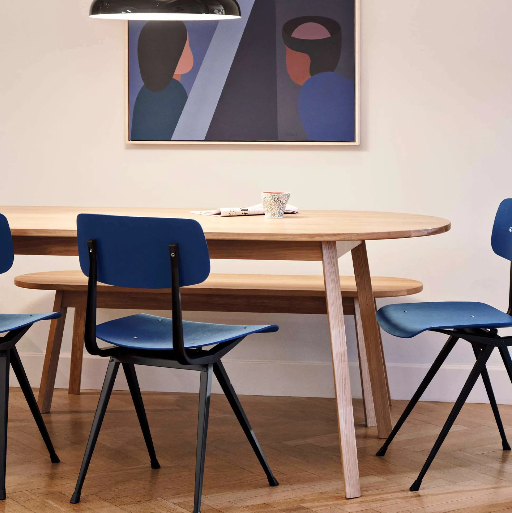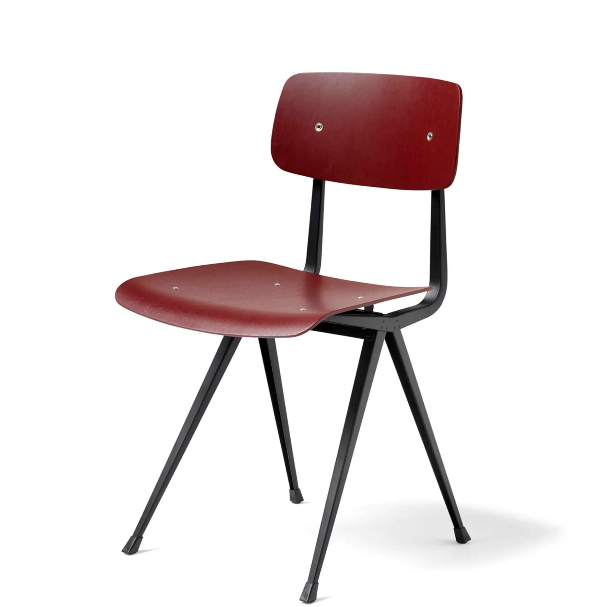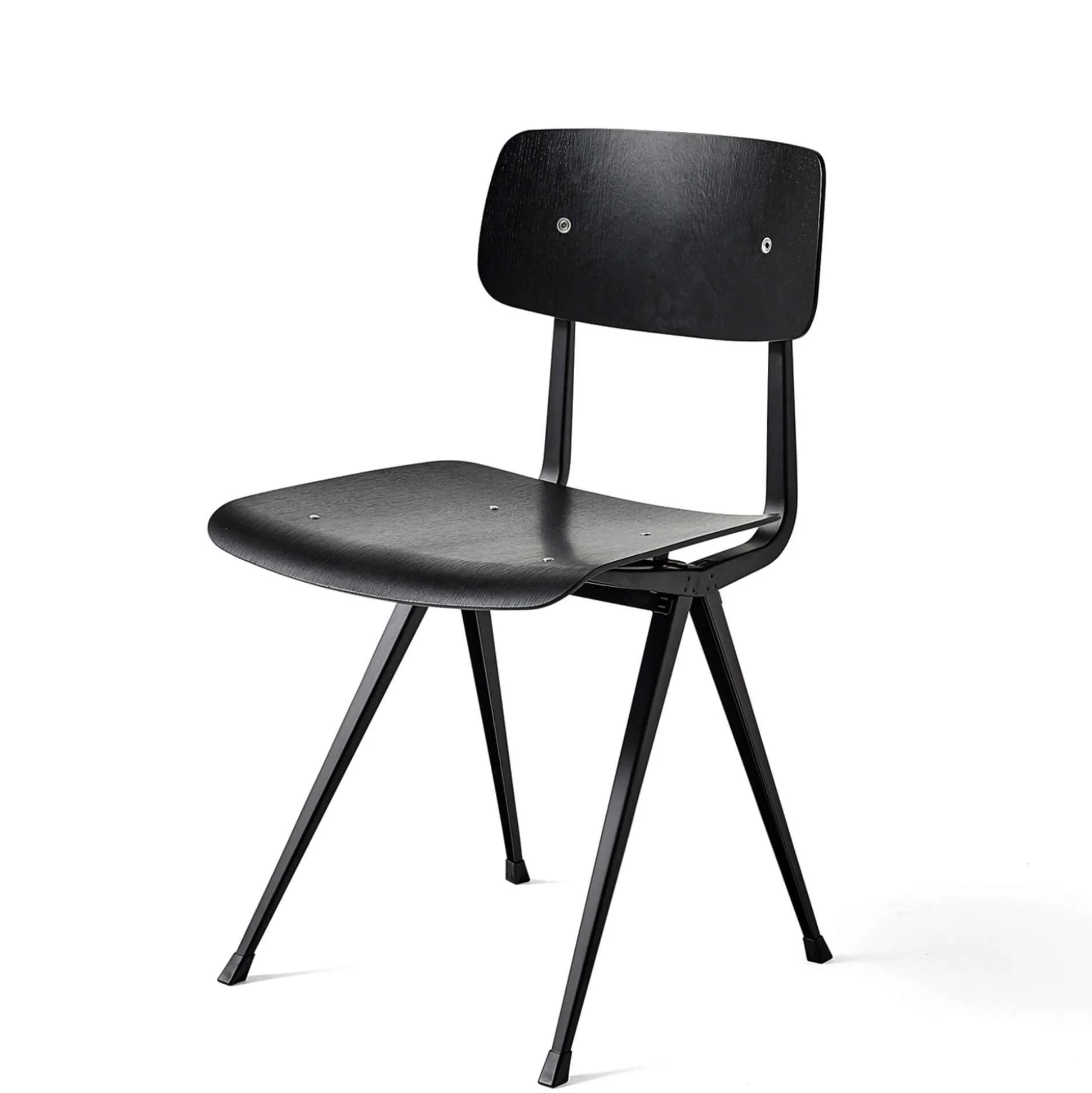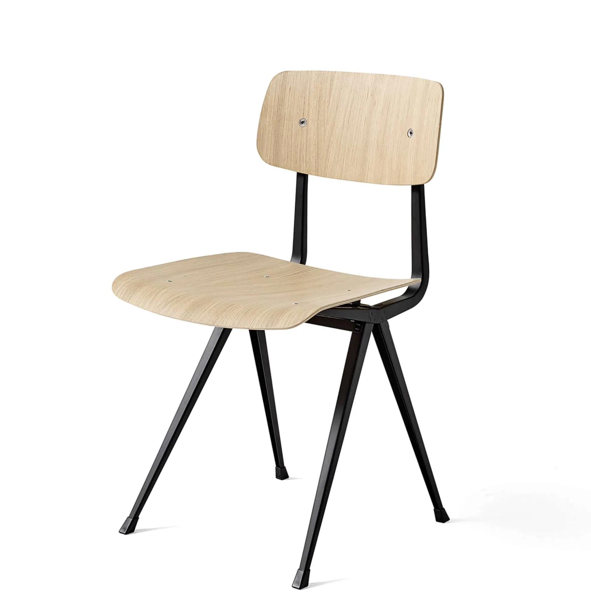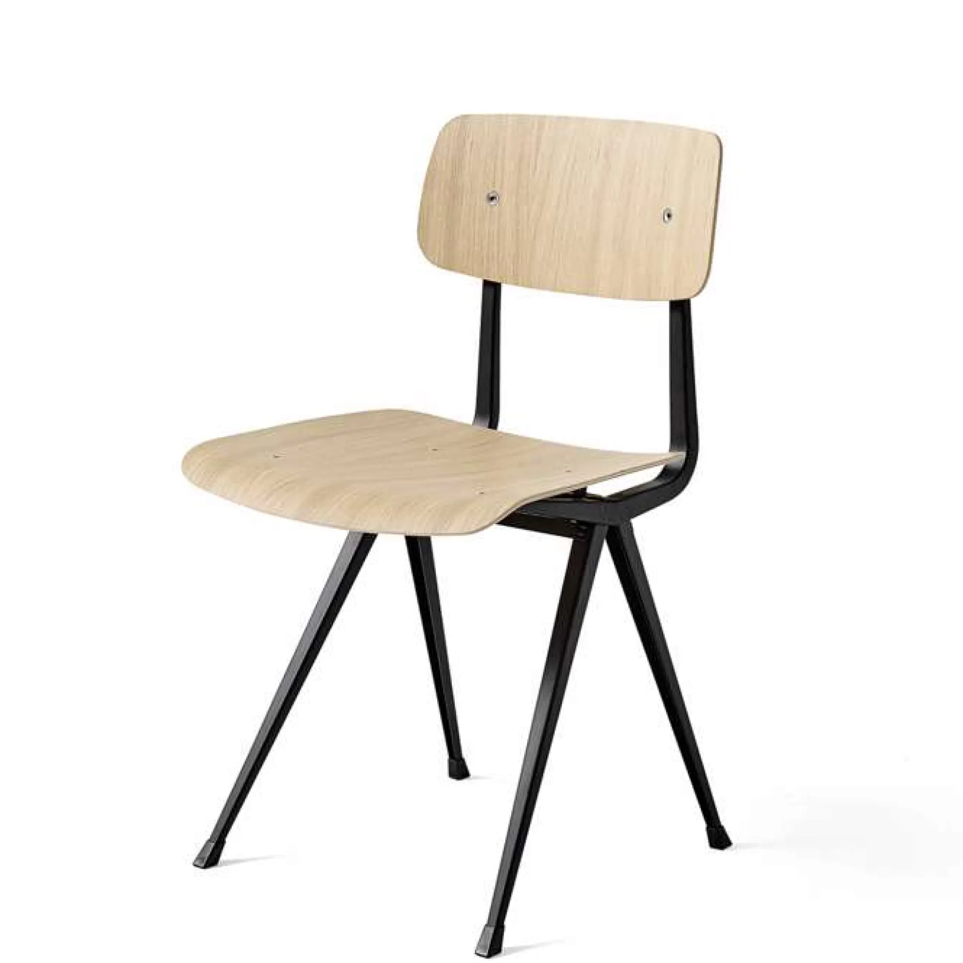 HAY Result mødestolen blev oprindeligt designet i 1950’erne af verdenskendte designere Friso Kramer og Wim Rietveld for Ahrend. Mødestolen blev relanceret i 2016 i samarbejde med HAY. På tidspunktet for deres første lancering blev designerne hyldet for deres innovative brug af stål. I dag bliver Result mødestolen rost for sin sparrende brug af materialer, det enkle design samt det faktum, at mødestolen er utrolig nem at flytte rundt på. Result mødestolen har en tynd krydsfinér med egefinér på sæde og ryglæn, der bevarer maksimal fleksibilitet, lethed og styrke. Mødestolens design gør det muligt at placere dem oven på borde.