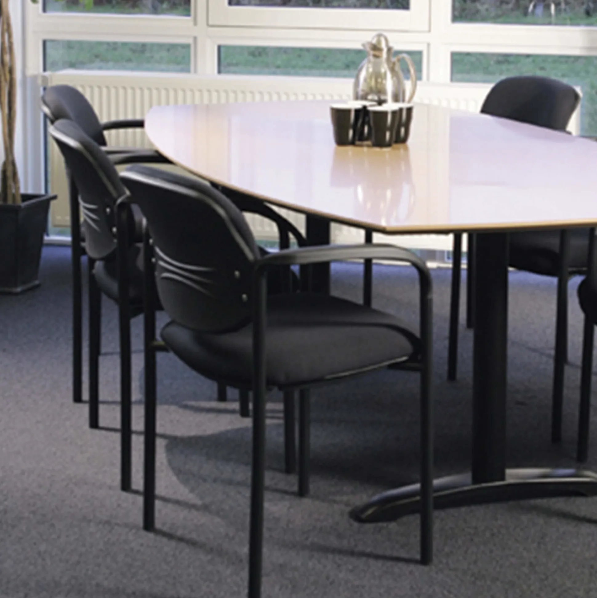 Meet stol er en enkel og behagelig, polstret mødestol med integrerede armlæn. Stolen sæde og ryg, er polstret med kraftigt skum, og betrukket med slidstærkt sort Oban stof.
