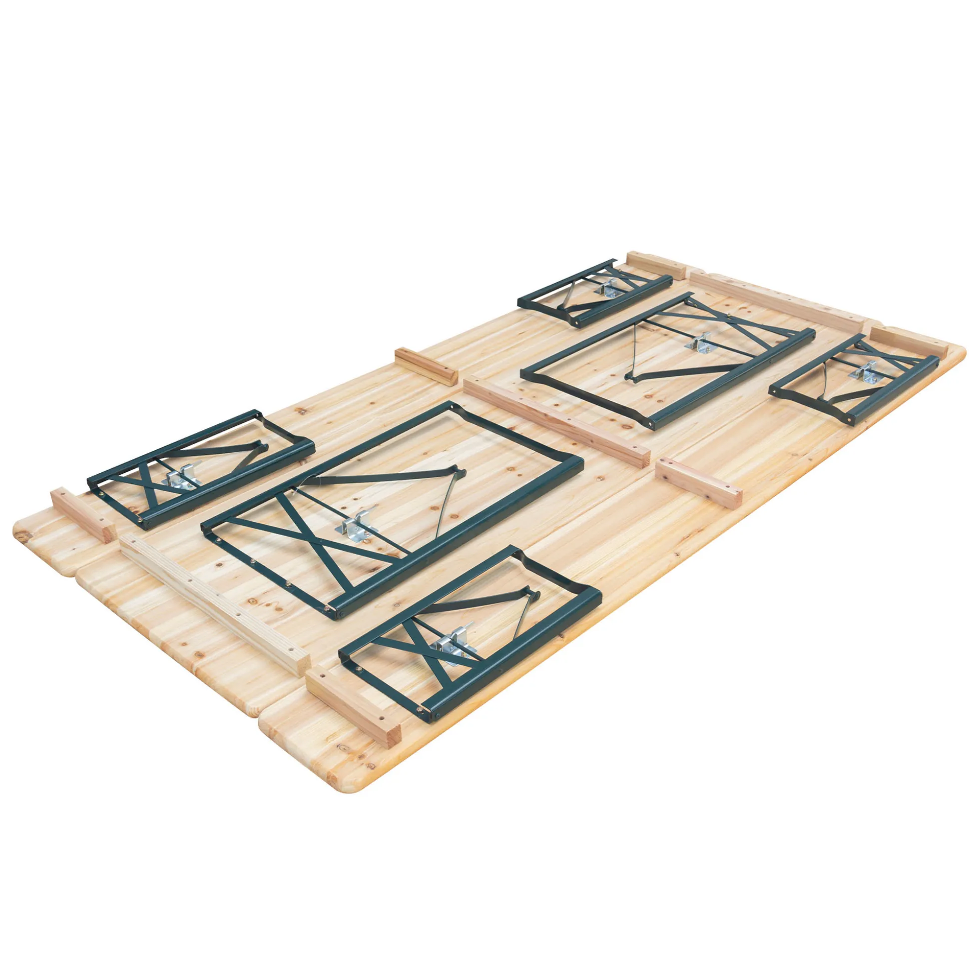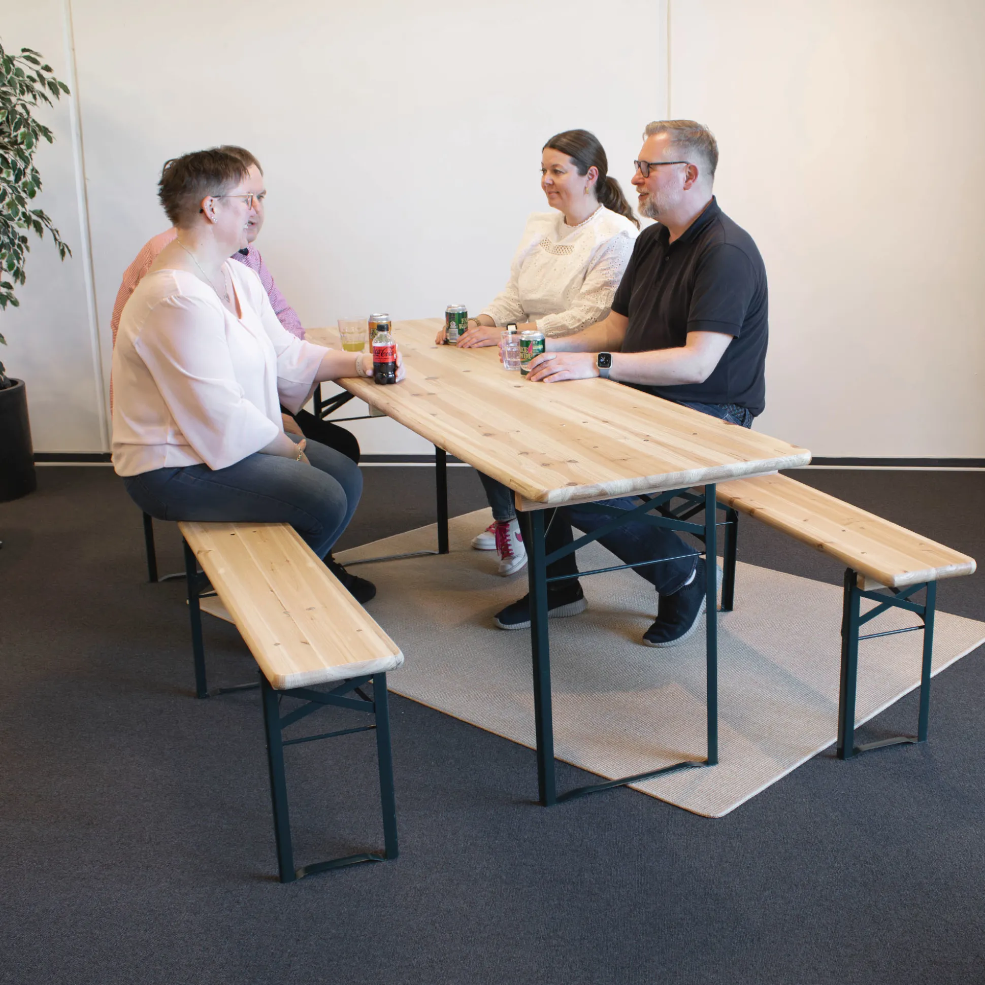 Bordet og bænkene er ikke sat sammen og kan derfor opsættes helt efter behov. De er nemme at klappe sammen og stable for nem opbevaring.