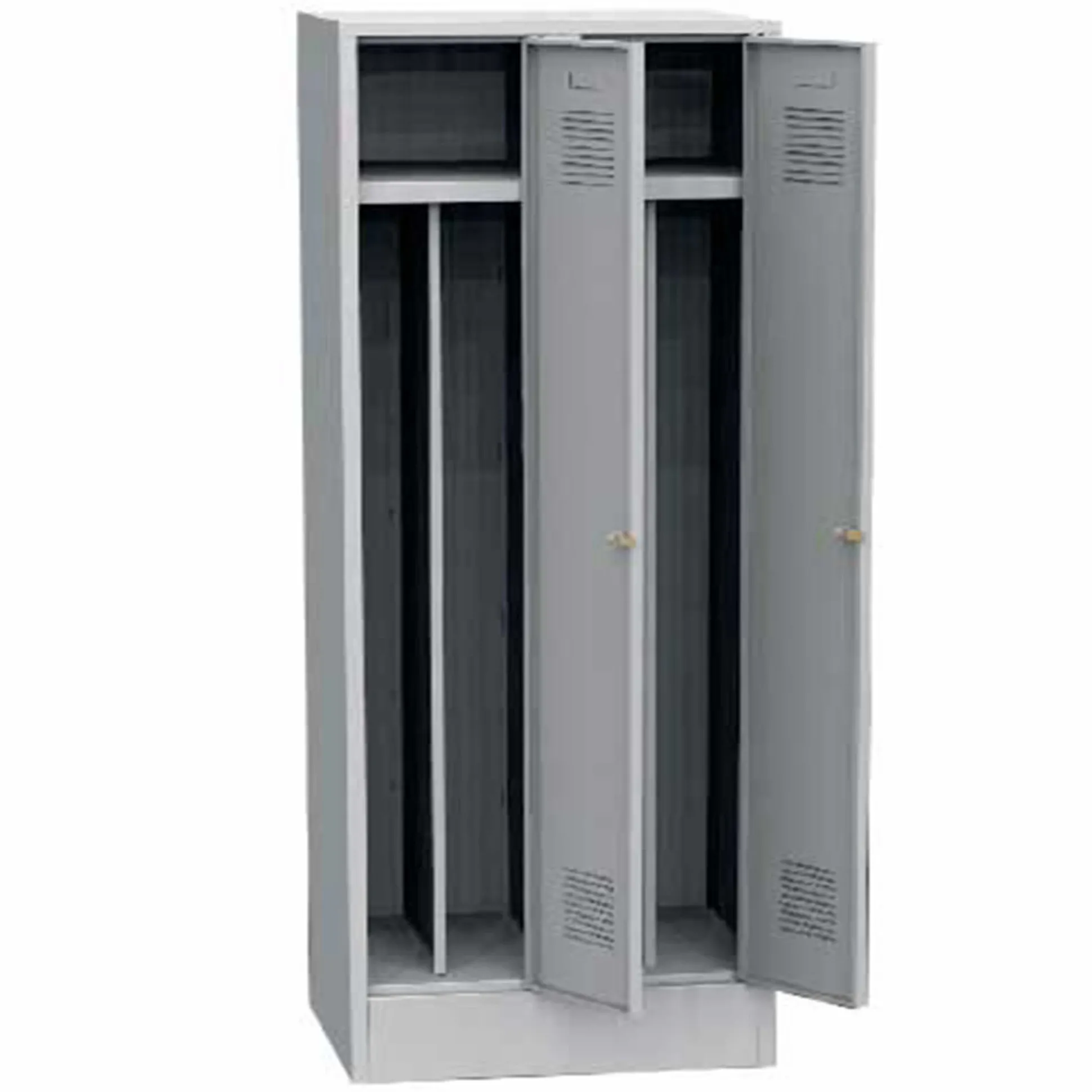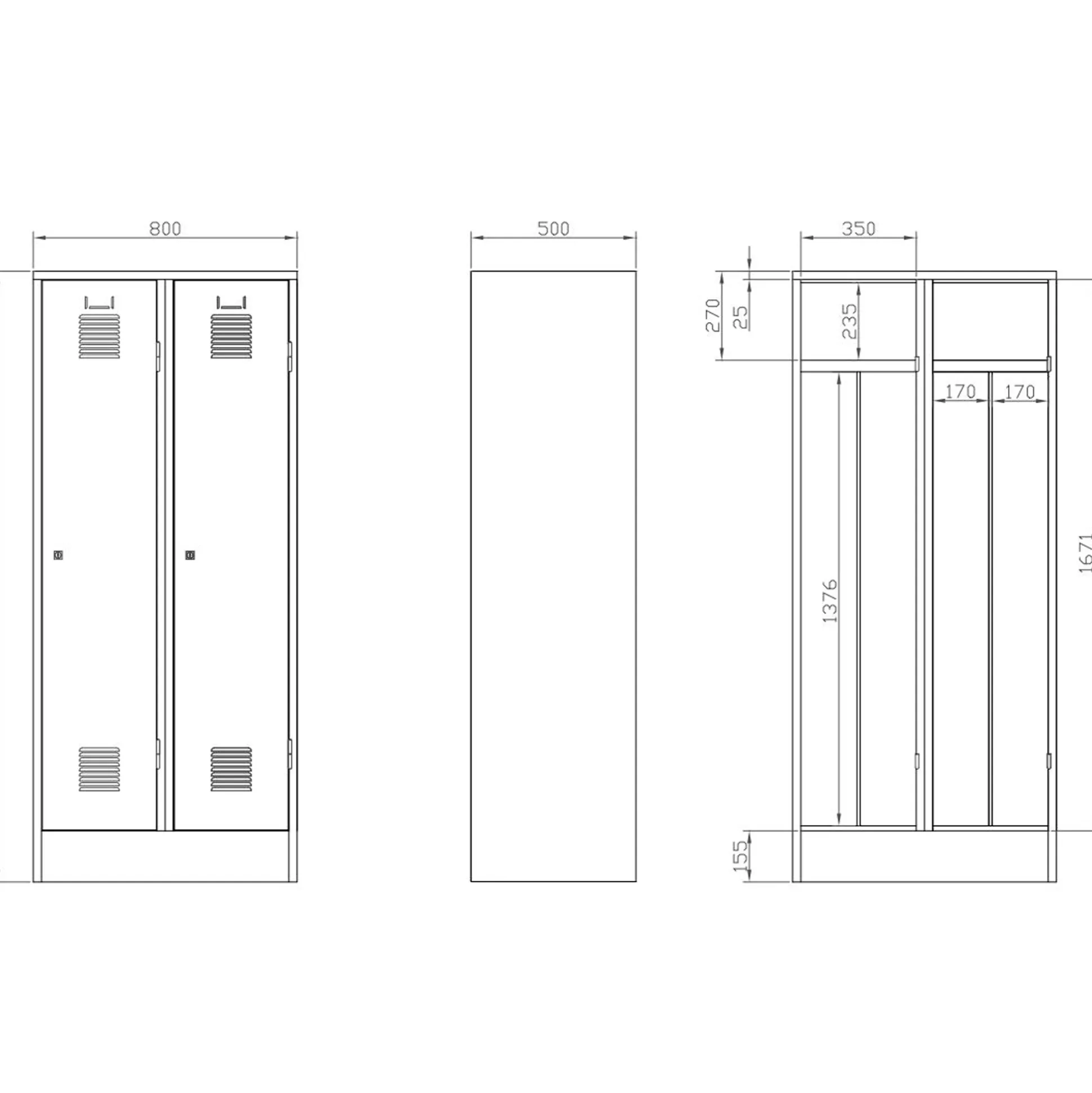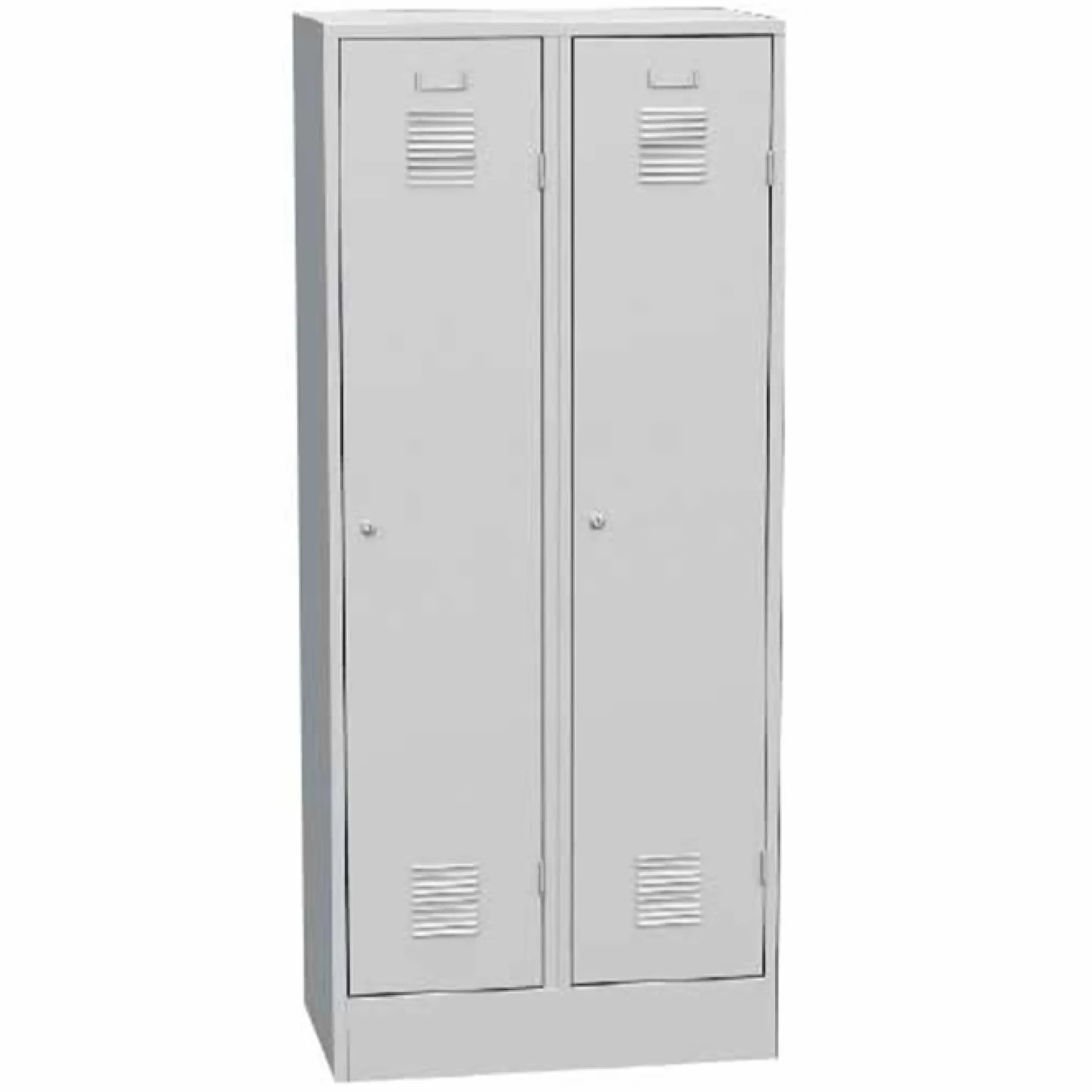 Omklædningsskab med 2 rum. Kabinettet er lysegråt, låger lysegrå og de 2 rum er indelt i 2 med en hylde i toppen, bøjlestang og 2 kroge. På lågen er der ventilationsrille i top og bund, navneskilt og en selvstændig lås, hvori der kun passer en nøgle. Lagerføres i lysegrå og mørkegrå, men fås i mange farver. Desuden er der mulighed for fødder, andre låsesystemer og skråt tag.