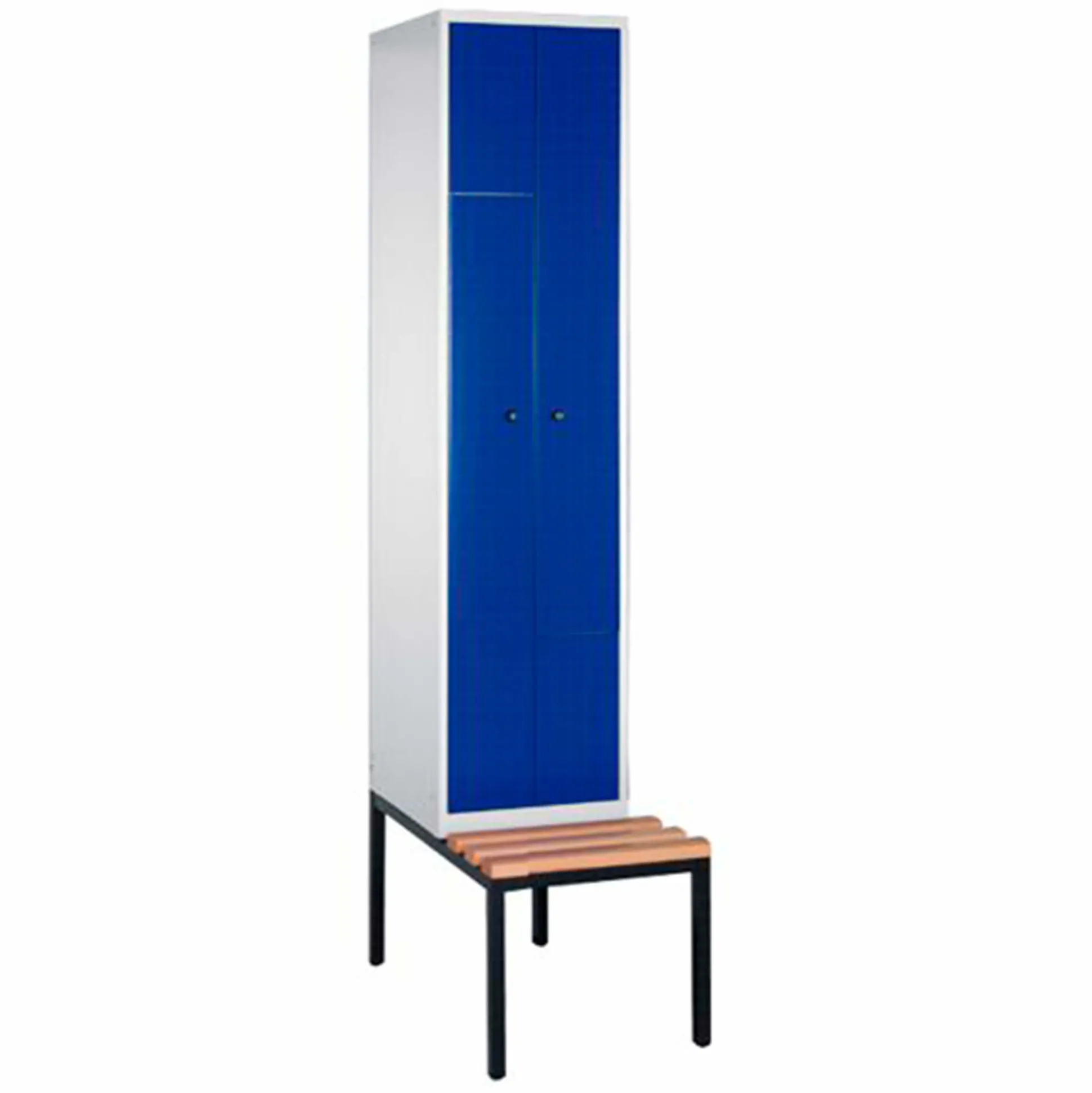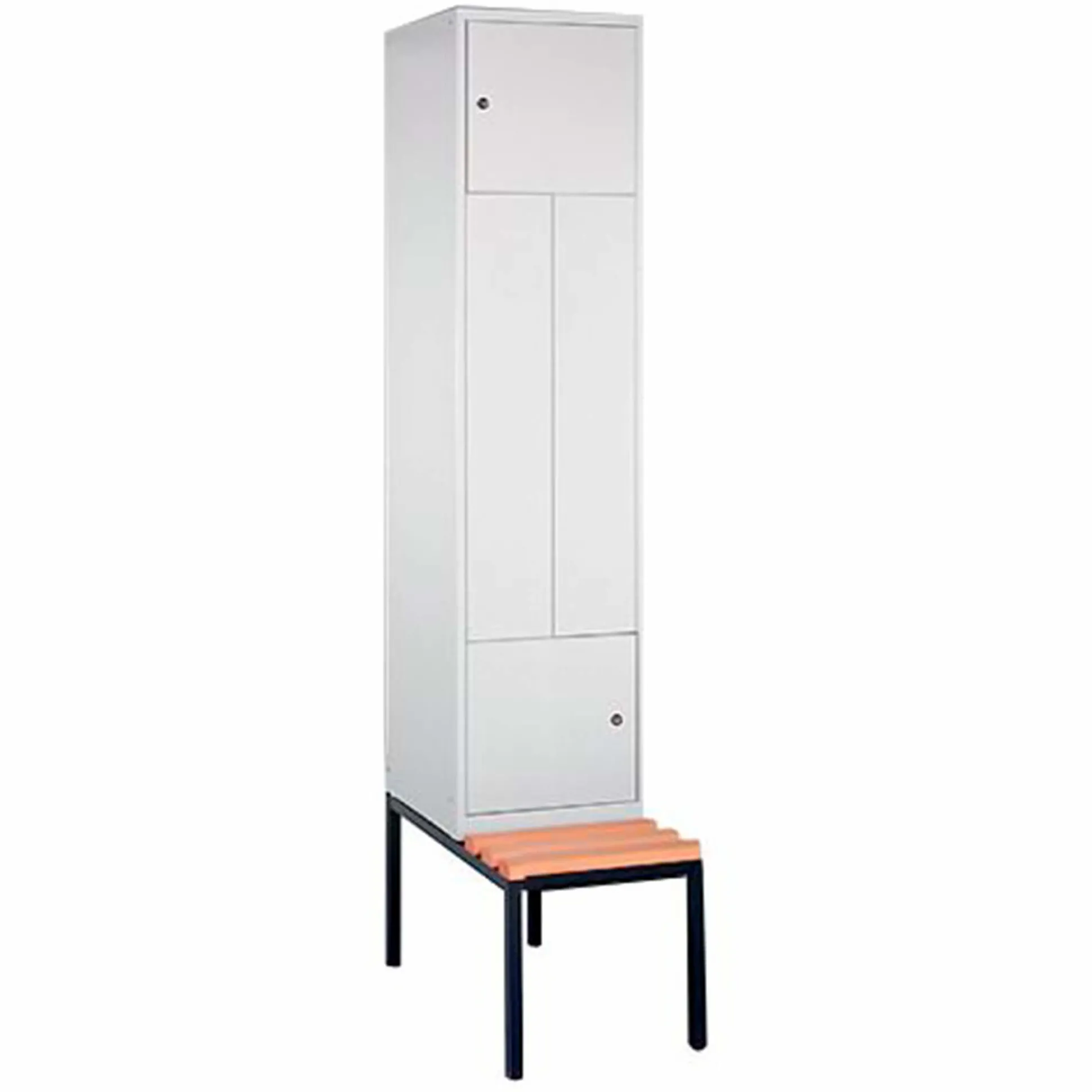 Z-formet Omklædningsskab med grå låger og bænk. Med 2 rum. Svejset og solidt skab. Dørgreb med nøglelås. Kontakt os, hvis andre farvekombinationer eller låsesystemer ønskes. Mål: 42 x 51,5/82,5 x 209h cm.