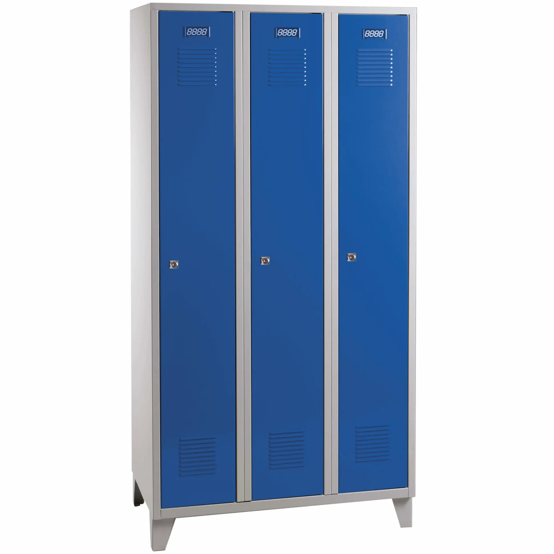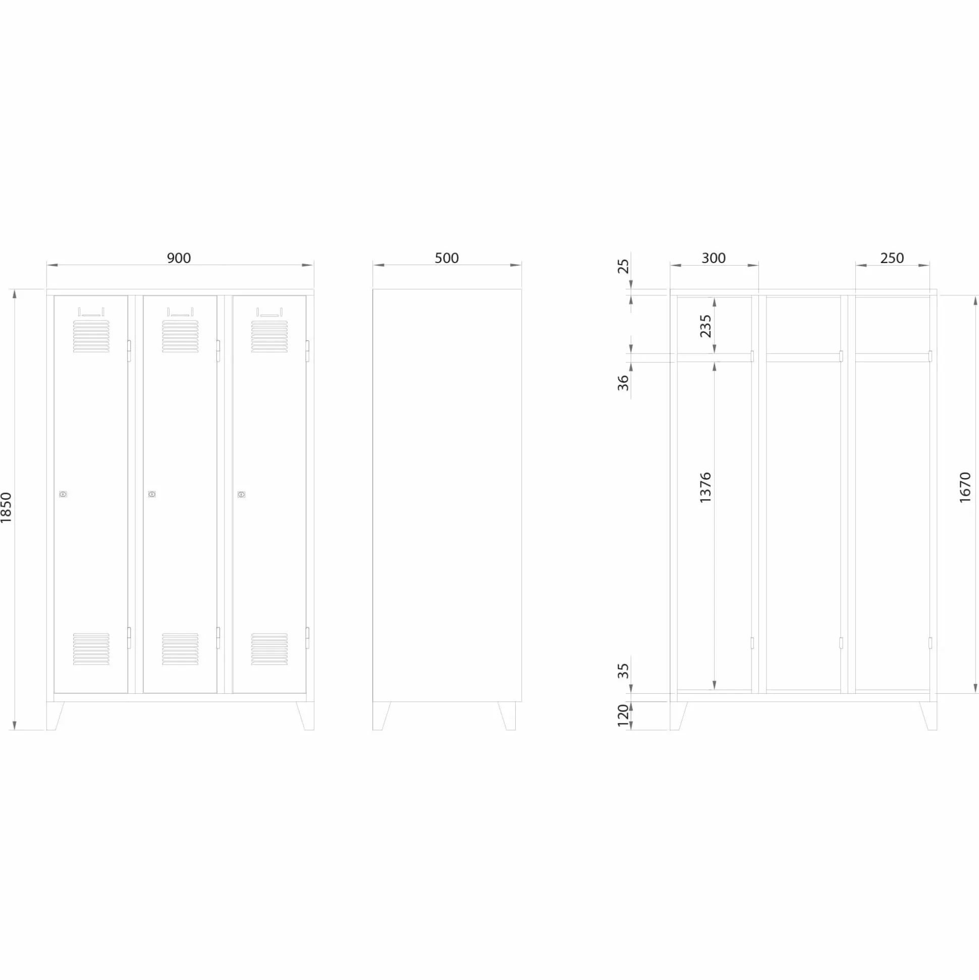 Garderobeskab med 3 rum. Skabet fås med ventilationsrille i top og bund af lågerne, indrettet med hattehylde, bøjlestang og håndklædekrog. Desuden er skabet med navneskilt og lås. Findes i 3 farver.