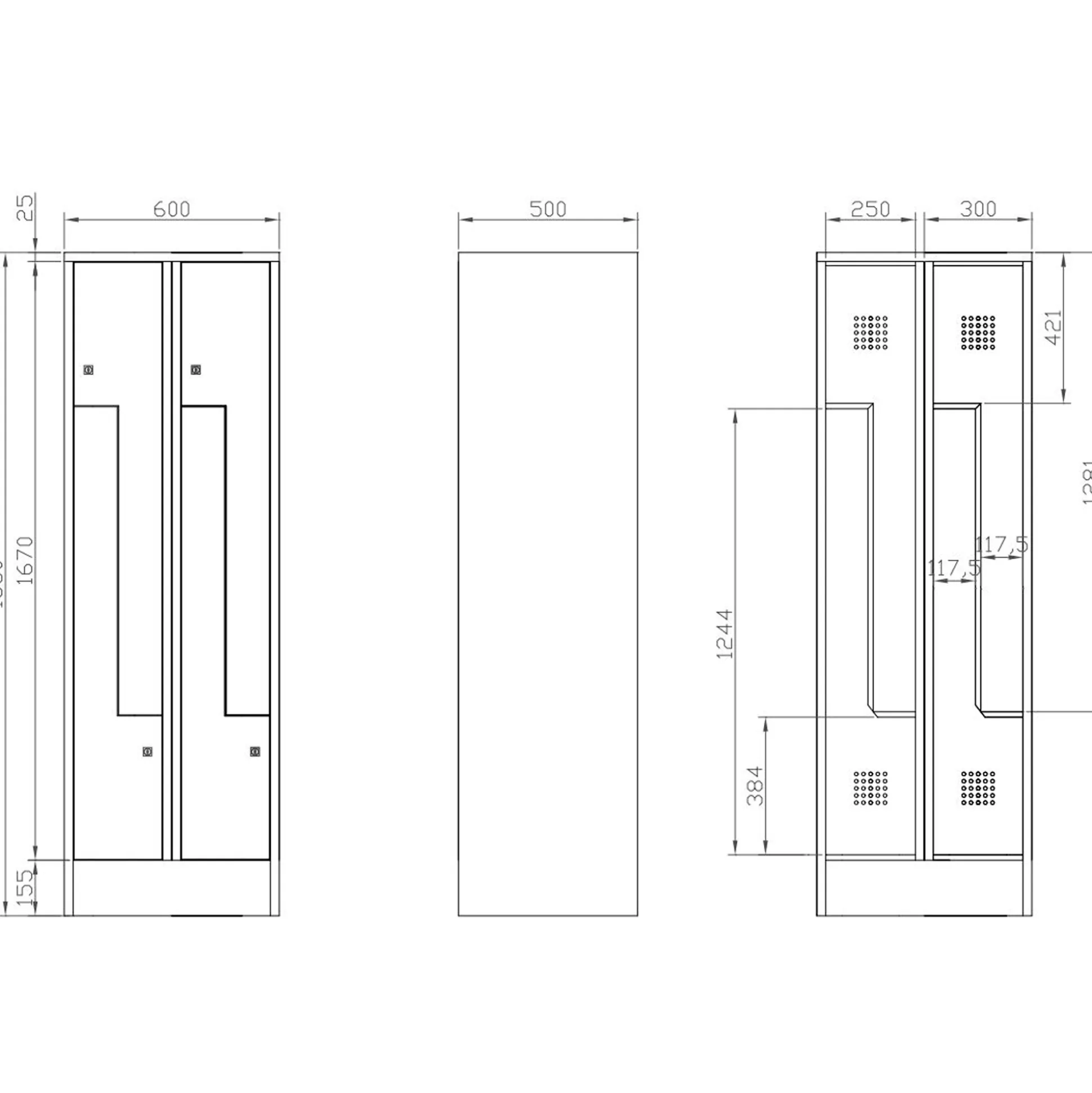 Z-formet skab. Med 2×2 låger. Korpus i lysegrå og låger i mørkegrå. Begge rum (øverst og nederst) er med 2 kroge. Låsesystemet består af en selvstændig lås, hvori der kun passer en nøgle.