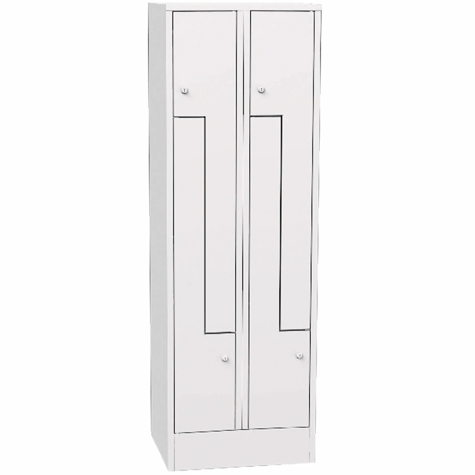 Z-formet skab. Med 2×2 låger. Kabinet i lysegrå og låger i lysegrå. Begge rum (øverst og nederst) er med 2 kroge. Låsesystemet består af en selvstændig lås, hvori der kun passer en nøgle.