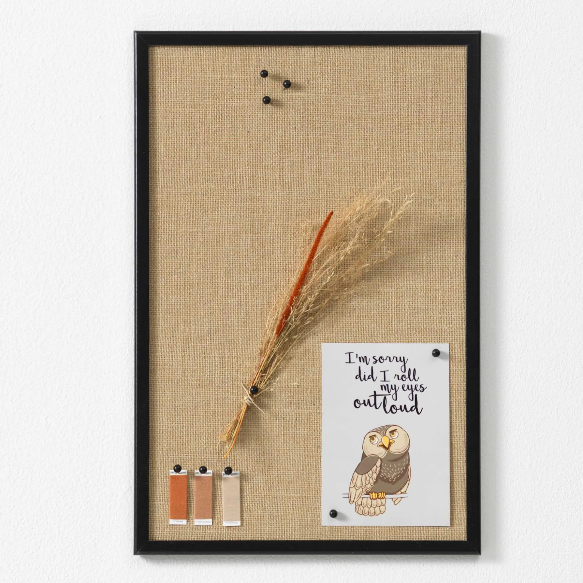 Stilfuld 40×60 cm opslagstavle i hessian stof med sort MDF ramme