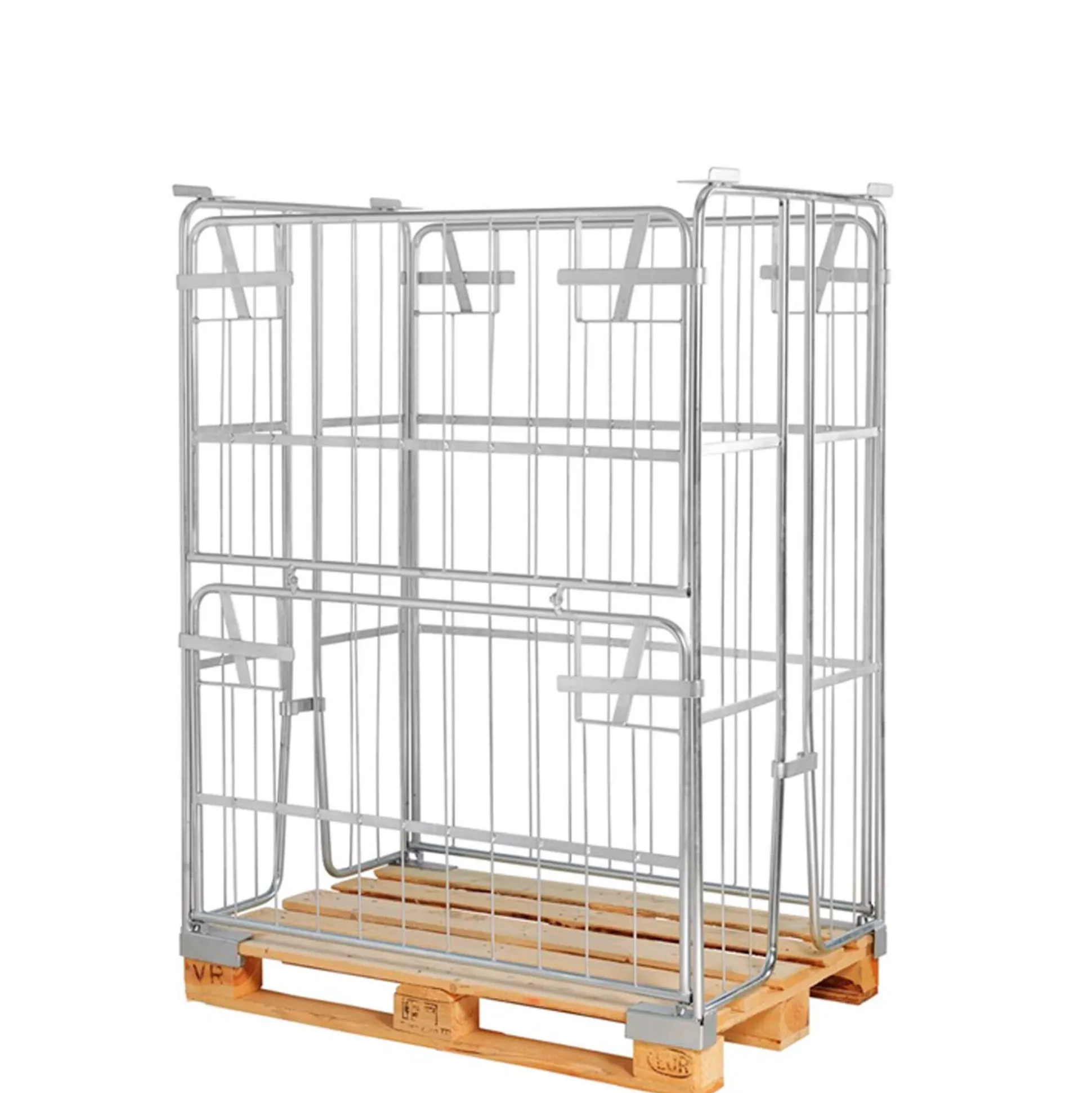 Kraftig pallecontainer som passer til EUR-paller. Mål: 80x120x150h cm. Leveres elforzinket. Kan klappes sammen så det fylder mindst muligt, når det ikke er i brug. Aftagelig halvhængt låge på ene langside. Kan stables