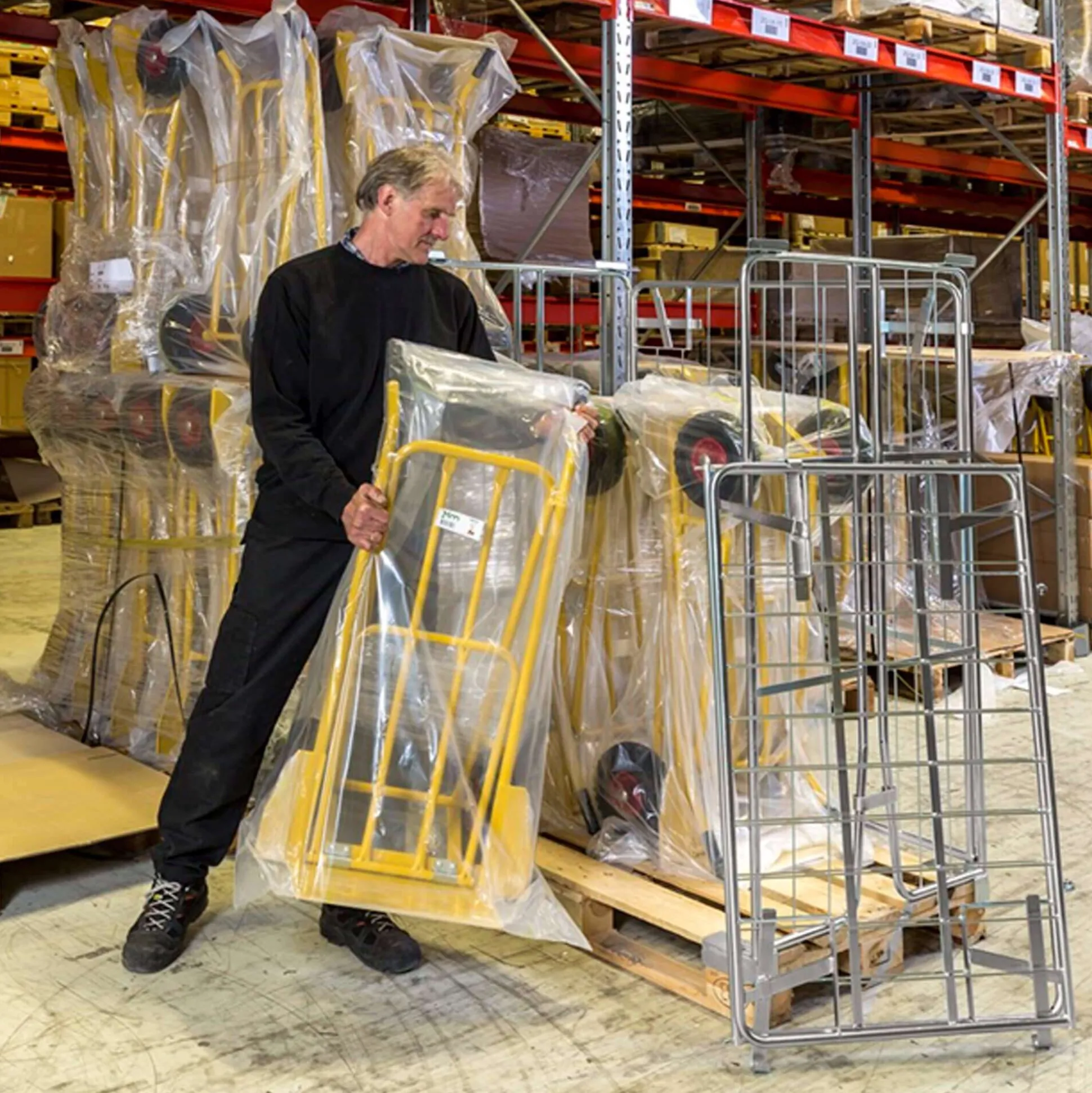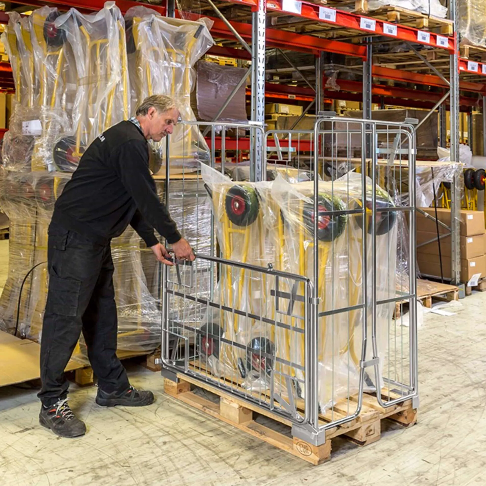 Kraftig pallecontainer som passer til EUR-paller. Mål: 80x120x180h cm. Leveres elforzinket. Kan klappes sammen så det fylder mindst muligt, når det ikke er i brug. Aftagelig halvhængt låge på ene langside. Kan stables