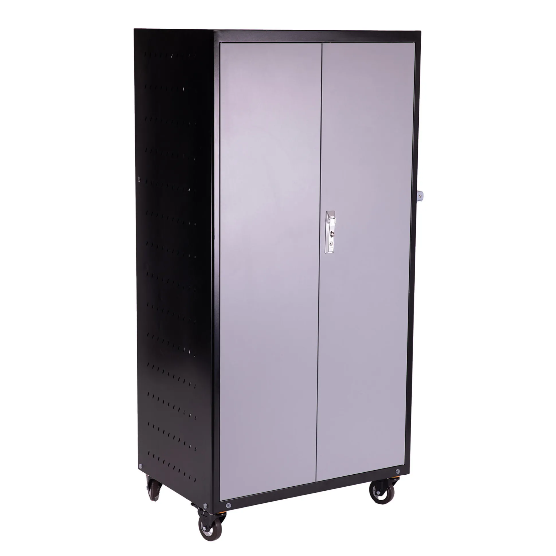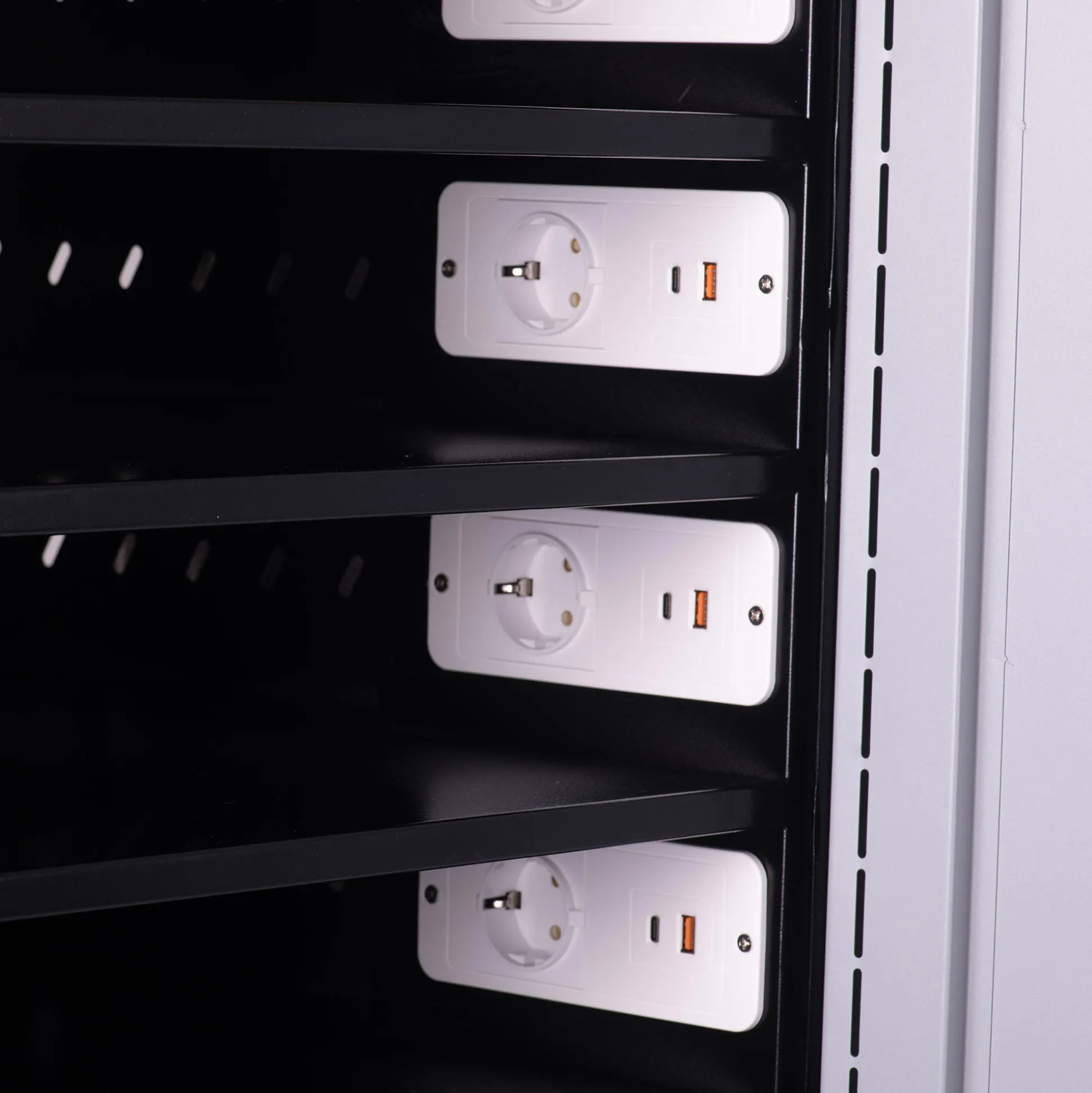 Mobilt ladeskab til Pc’er med 28 rum bag to låsbare låger, med 2 nøgler samt mulighed for hængelås. Vognen kommer med letrullende låsbare hjul samt et praktisk håndtag der gør det lettere at flytte og håndtere vognen. En PC-vogn er idéel til opbevaring samt opladning af bærbare computere, mobil telefoner, tablets o.lign. Hvert rum har egen strømtilslutning via enten schuko, USB-A eller USB-C og kan enten lade alle på en gang, eller i sekvens.
