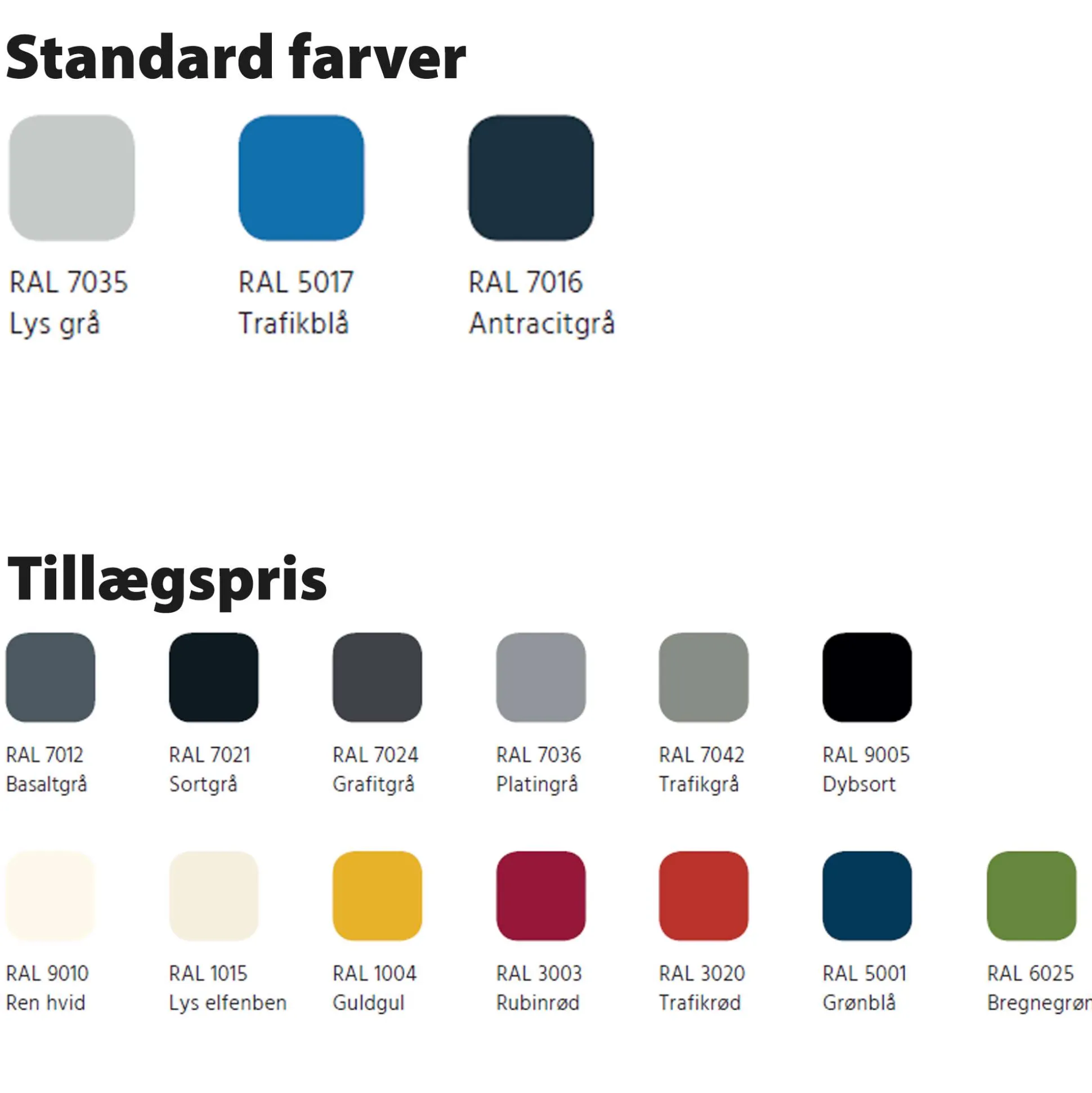Skabet kan bestilles i forskellige farver, noter venligst dette i bemærkningsfeltet. Standard farver kan vælges uden tillæg i prisen, der kan vælges 1 farve til kabinettet og 1 farve til lågerne.