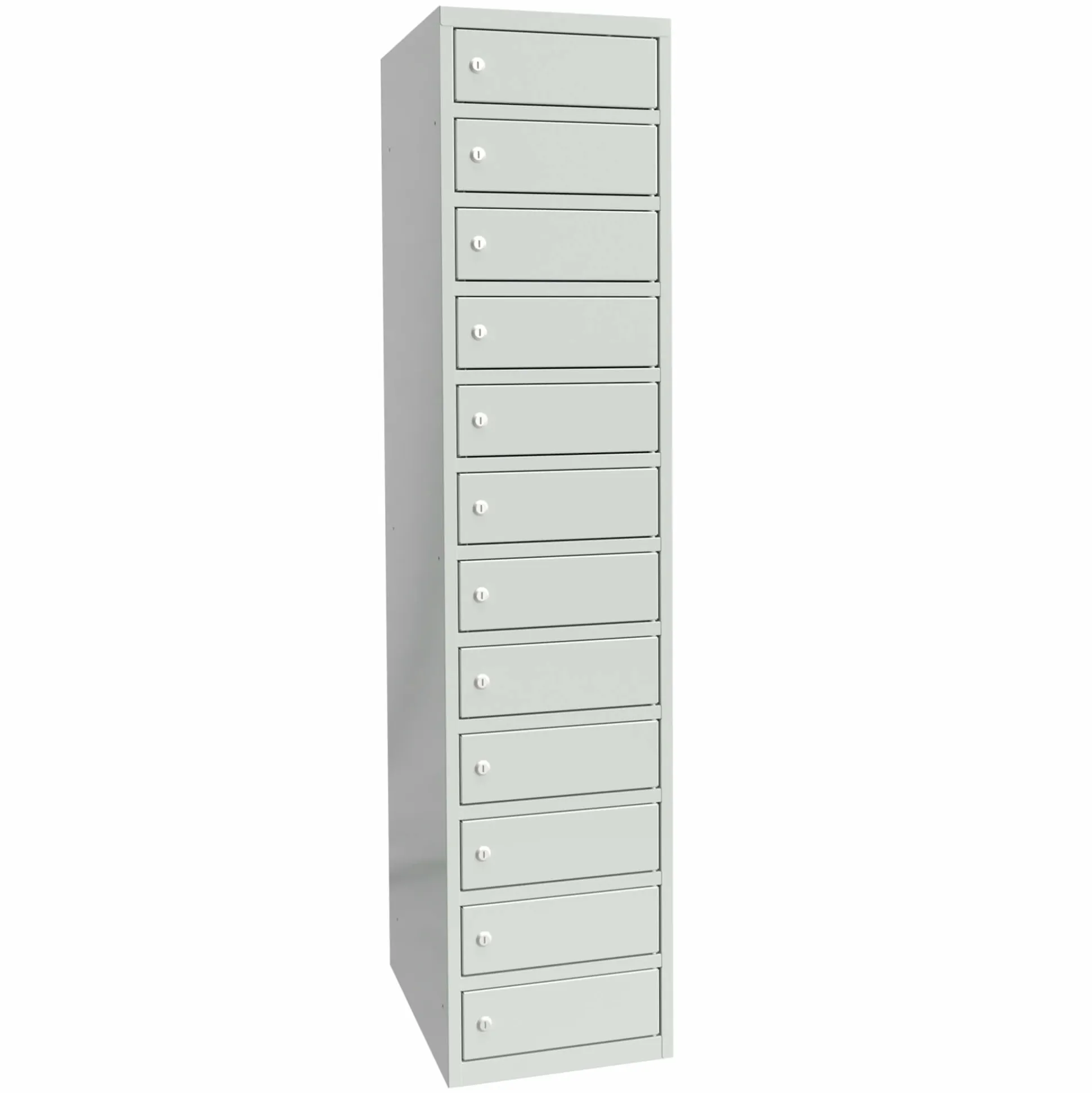 PC-skab til sikker opbevaring af bærbar computer, tablet, iPad og lign. Skabet leveres med 12 rum i højden – med opladning, schukostik. Ekskl. understel. Med cylinderlås og 2 nøgler. Skabet kan stå på sokkel, ben eller væghænges. Se “Andre købte også”.