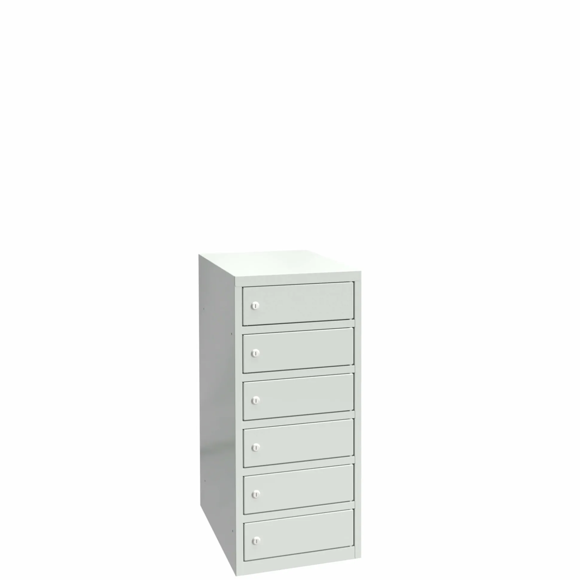 Består af et helsvejst stålkabinet, som er pulverlakeret lysegråt, samt lysegrå låger (RAL 7035). Hvert rum leveres med cylinderlås og 2 nøgler.