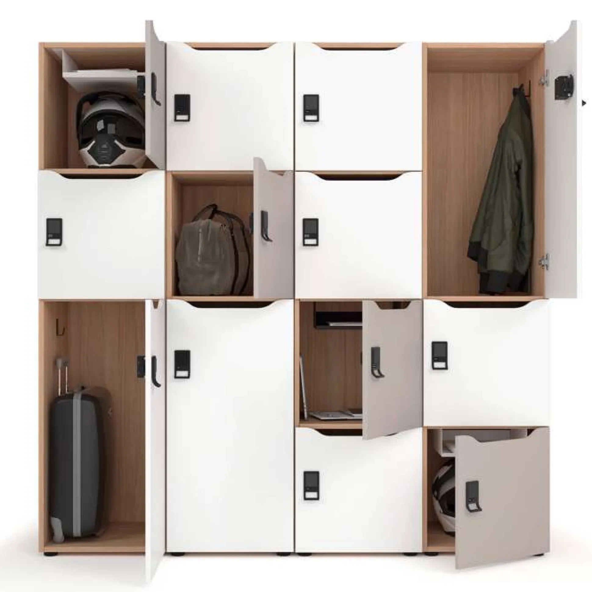 Du kan selv sammensætte din egen opstilling af personaleskabe, så det passer præcis til dine behov. Der kan ændres farve på korpus og låger, der kan tilkøbes kodelås eller elektroniske låse.
