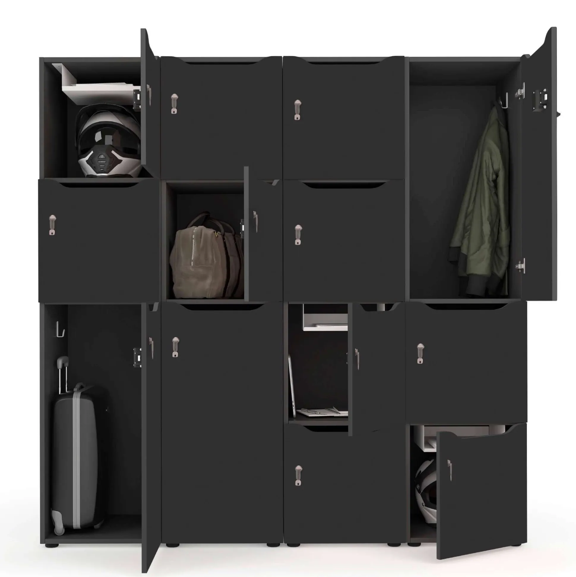 Det viste personaleskab er med 13 rum og indkast, hvor korpus og låger har samme farve. Du kan vælge mellem hvid, lysegrå, antracit eller eg. Hvert rum er med en standard nøglelås inkl. 2 nøgler.