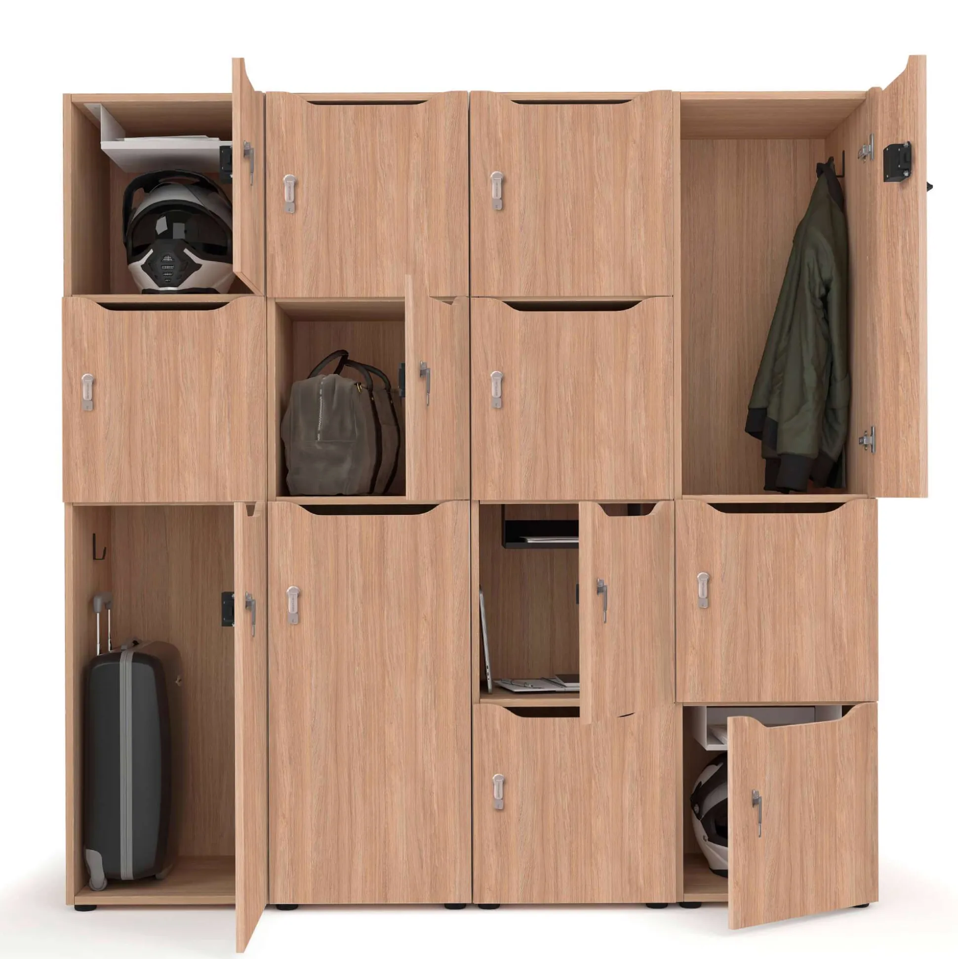 Det viste personaleskab er med 13 rum og indkast, hvor korpus og låger har samme farve. Du kan vælge mellem hvid, lysegrå, antracit eller eg. Hvert rum er med en standard nøglelås inkl. 2 nøgler.