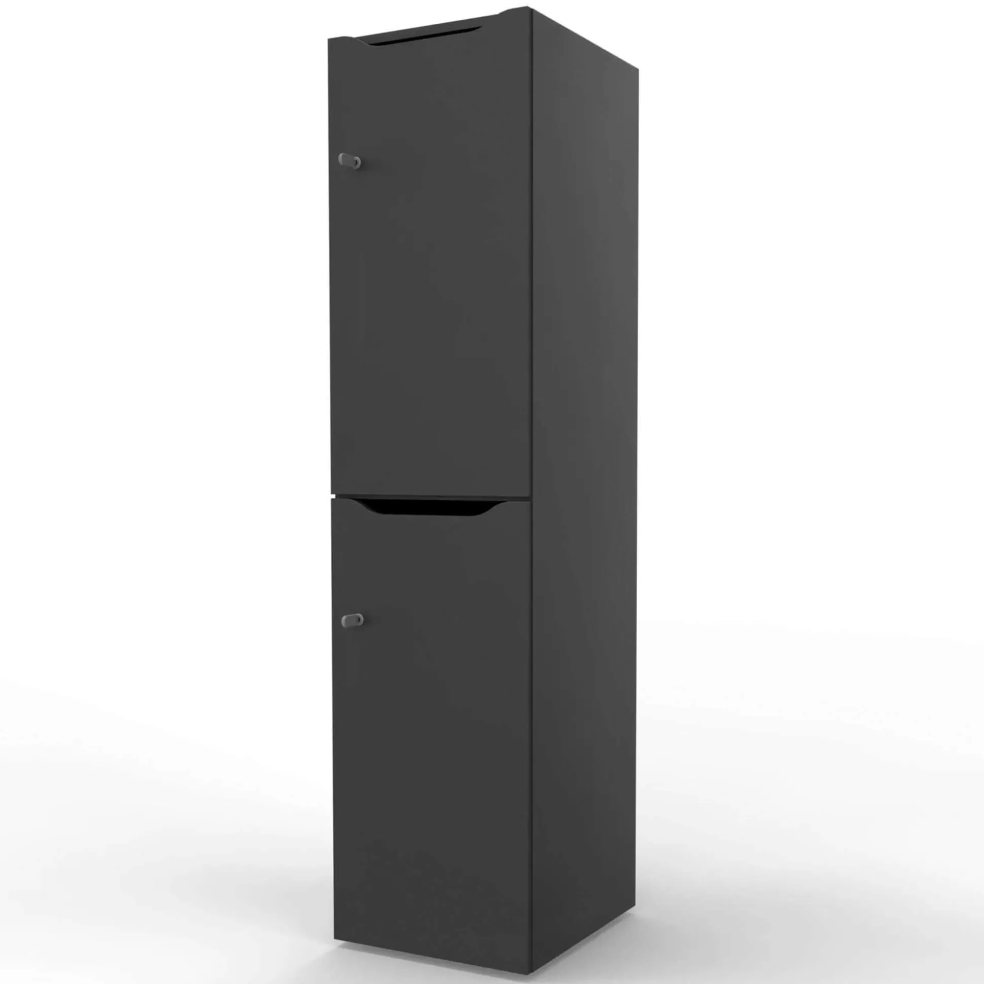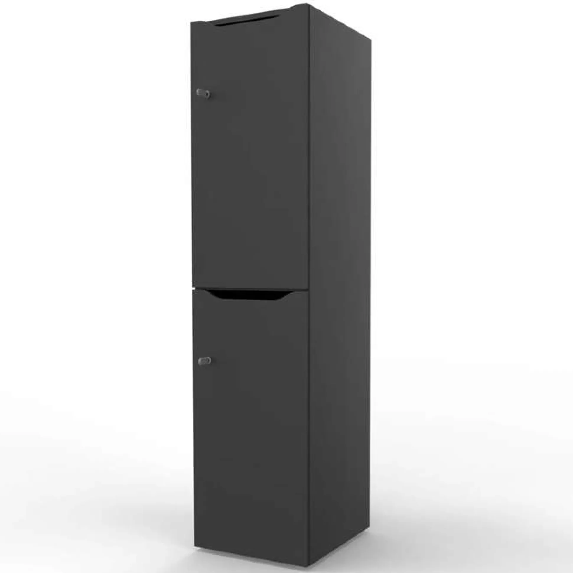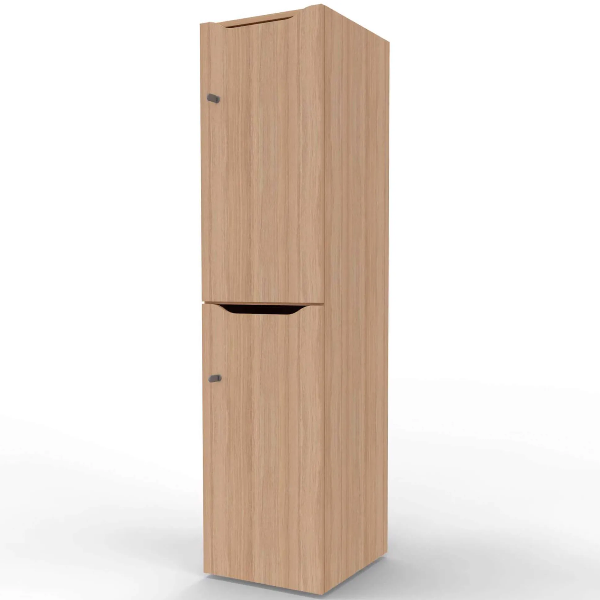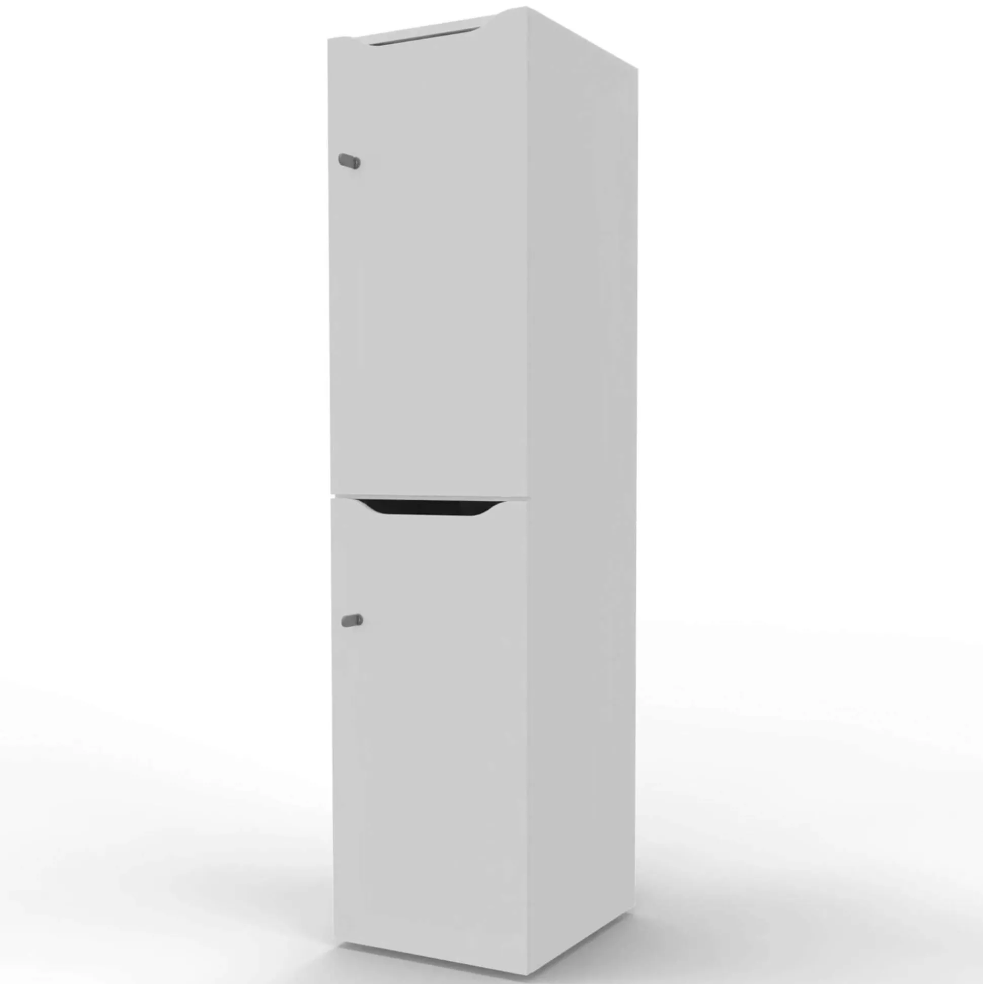 Det viste personaleskab er med 2 rum og indkast, hvor korpus og låger har samme farve. Du kan vælge mellem hvid, lysegrå, antracit eller eg. Hvert rum er med en standard nøglelås inkl. 2 nøgler.