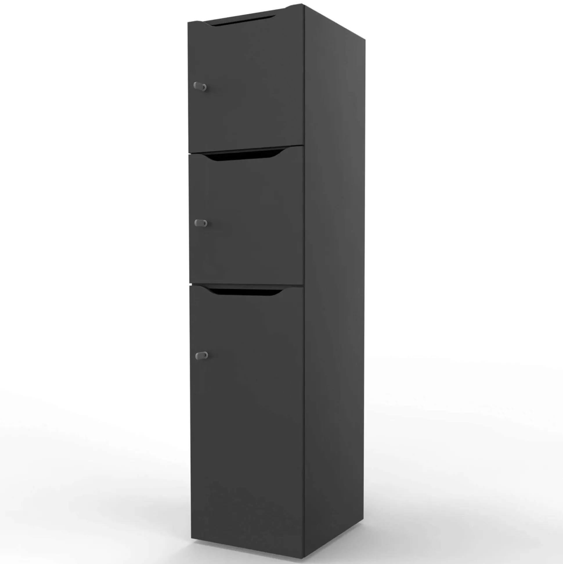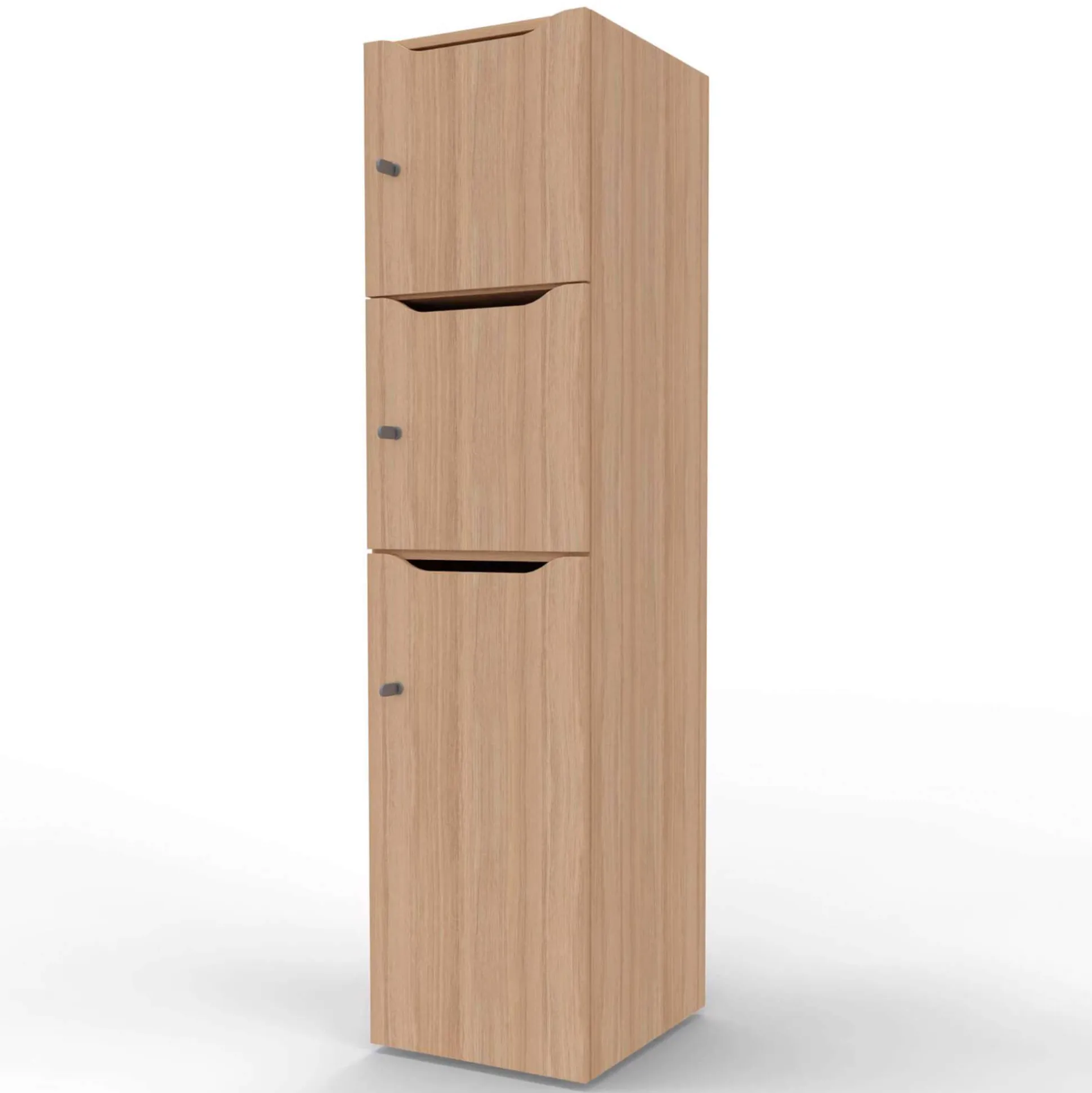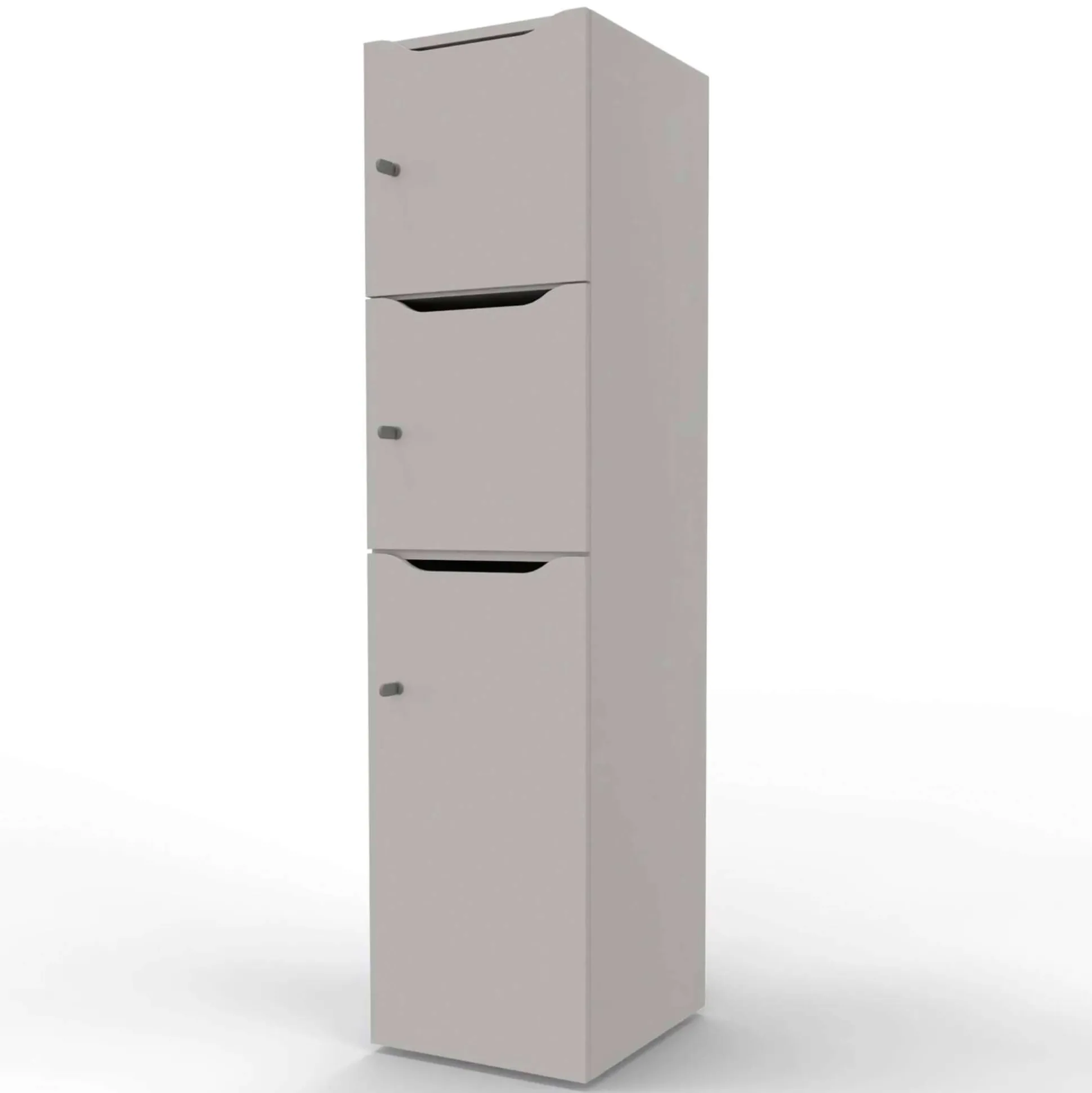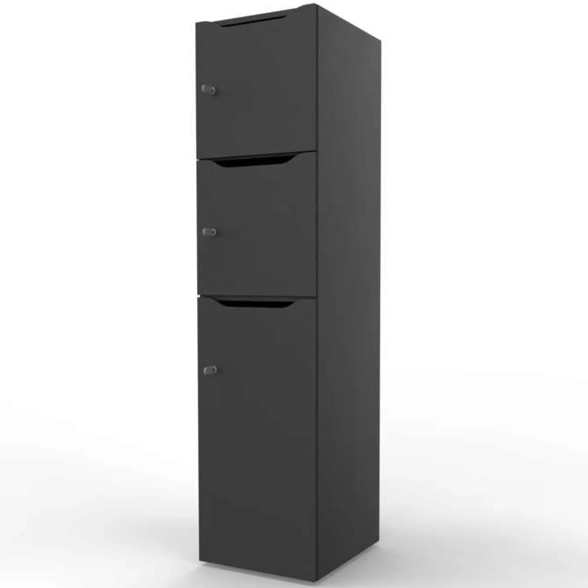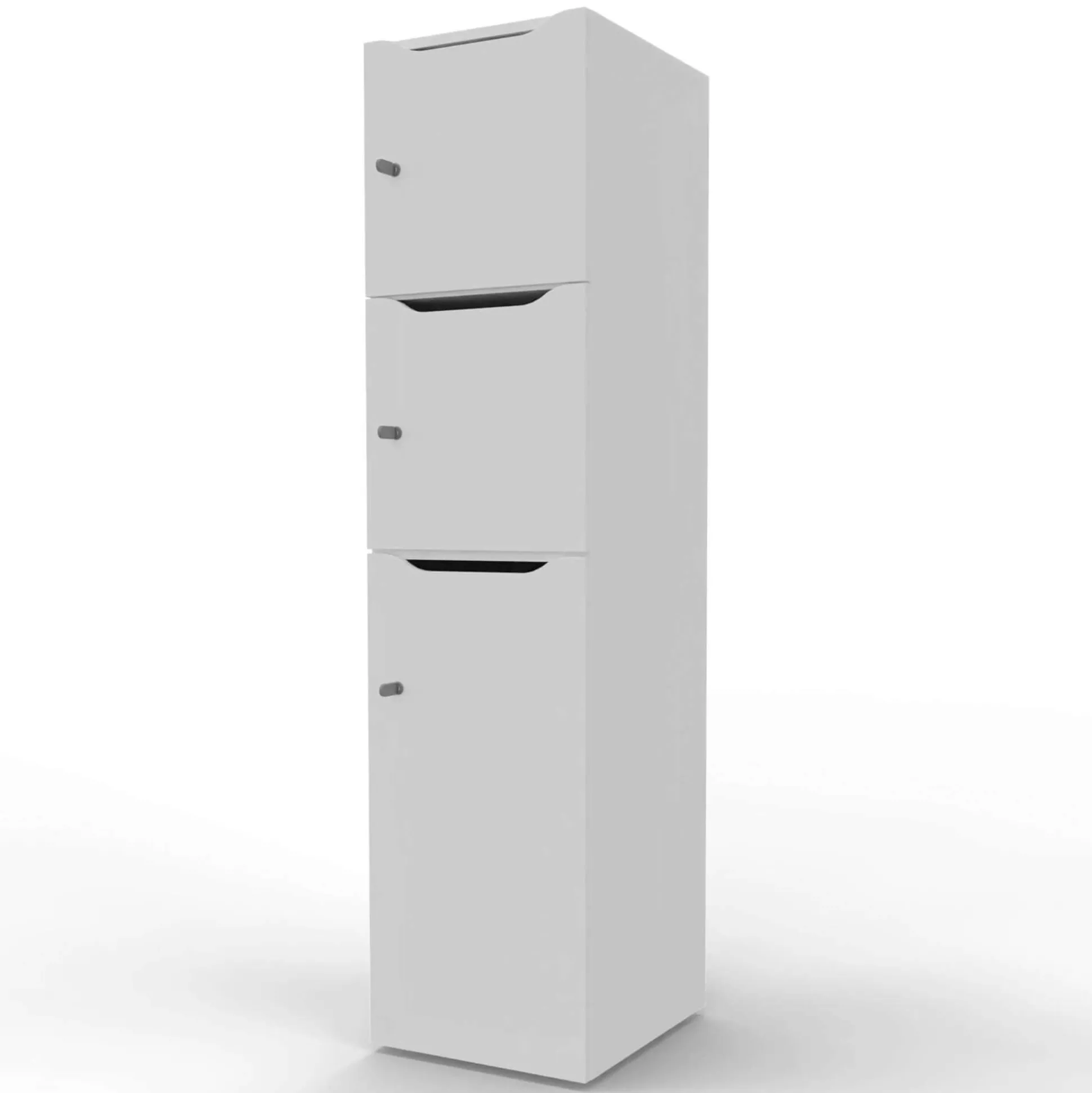 Det viste personaleskab er med 3 rum og indkast, hvor korpus og låger har samme farve. Du kan vælge mellem hvid, lysegrå, antracit eller eg. Hvert rum er med en standard nøglelås inkl. 2 nøgler.