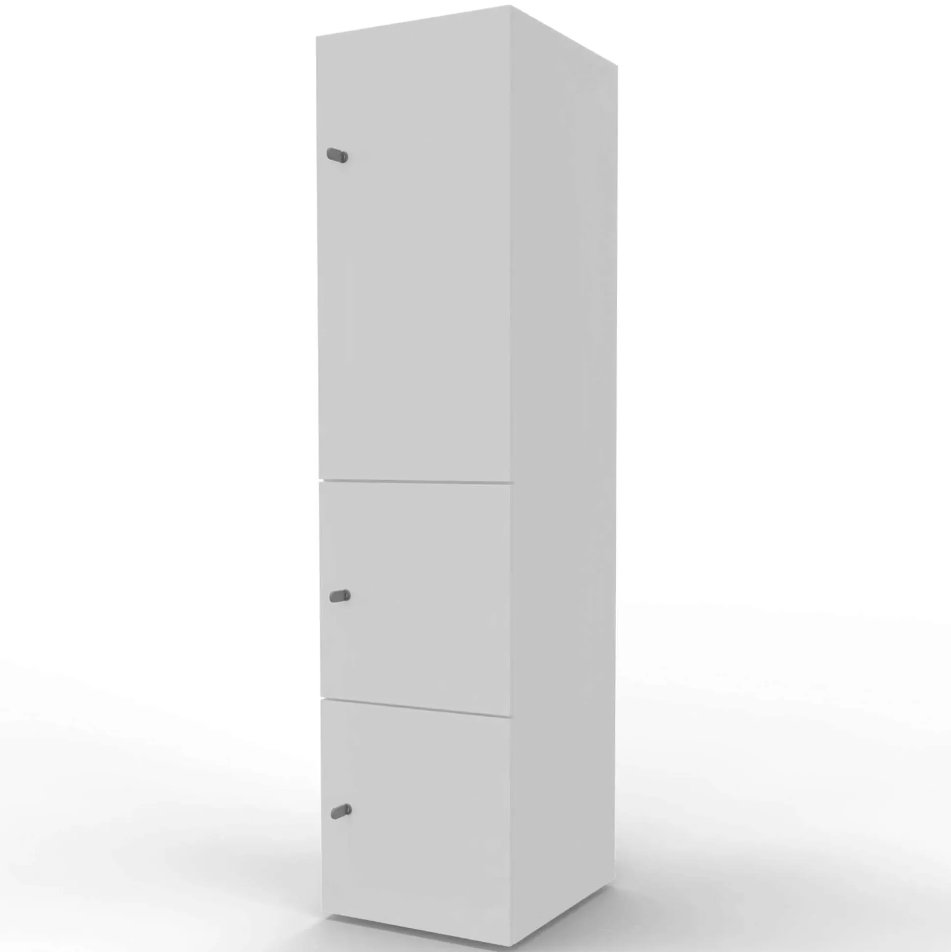Det viste personaleskab er med 3 rum, hvor korpus og låger har samme farve. Du kan vælge mellem hvid, lysegrå, antracit eller eg. Hvert rum er med en standard nøglelås inkl. 2 nøgler.