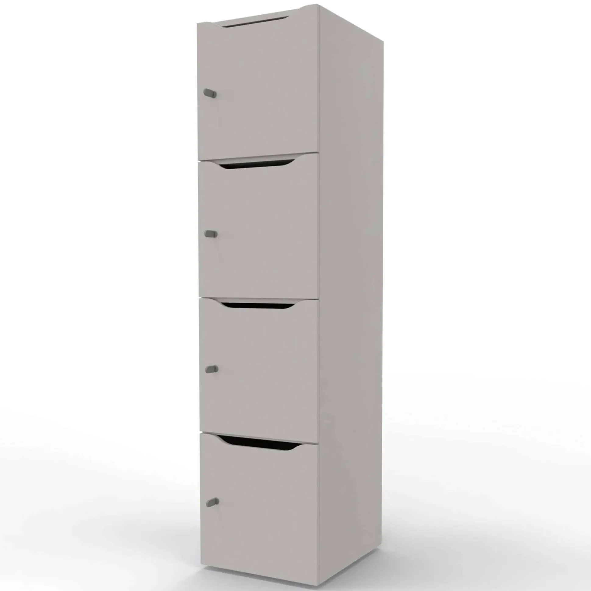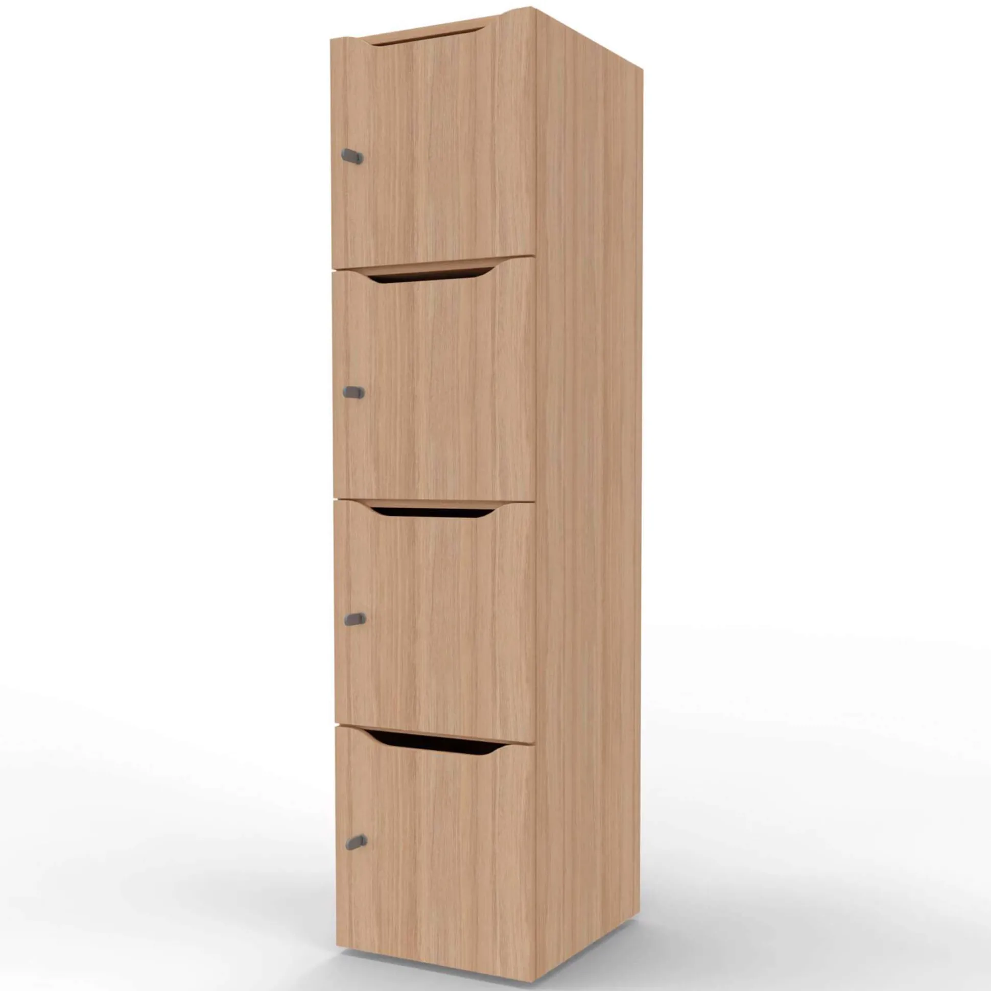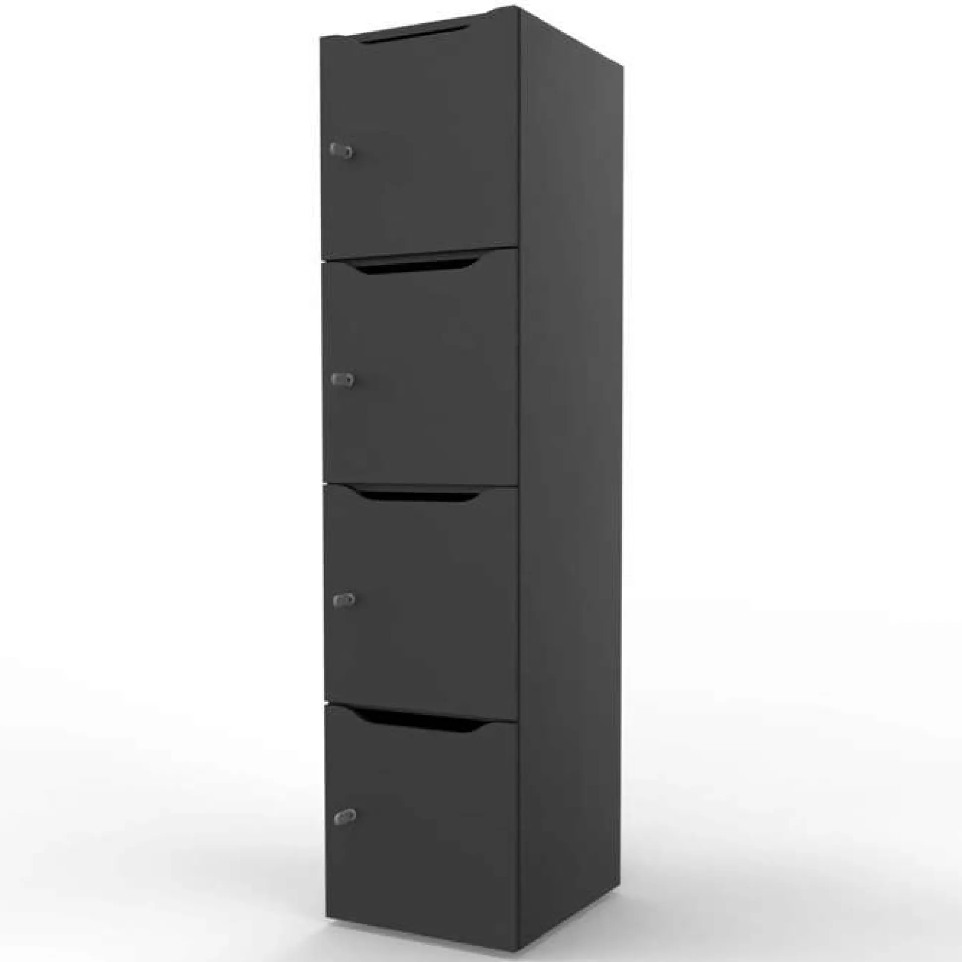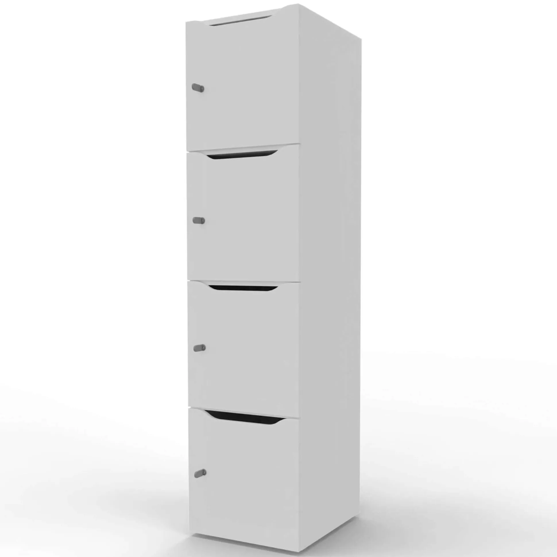 Det viste personaleskab er med 4 rum og indkast, hvor korpus og låger har samme farve. Du kan vælge mellem hvid, lysegrå, antracit eller eg. Hvert rum er med en standard nøglelås inkl. 2 nøgler.