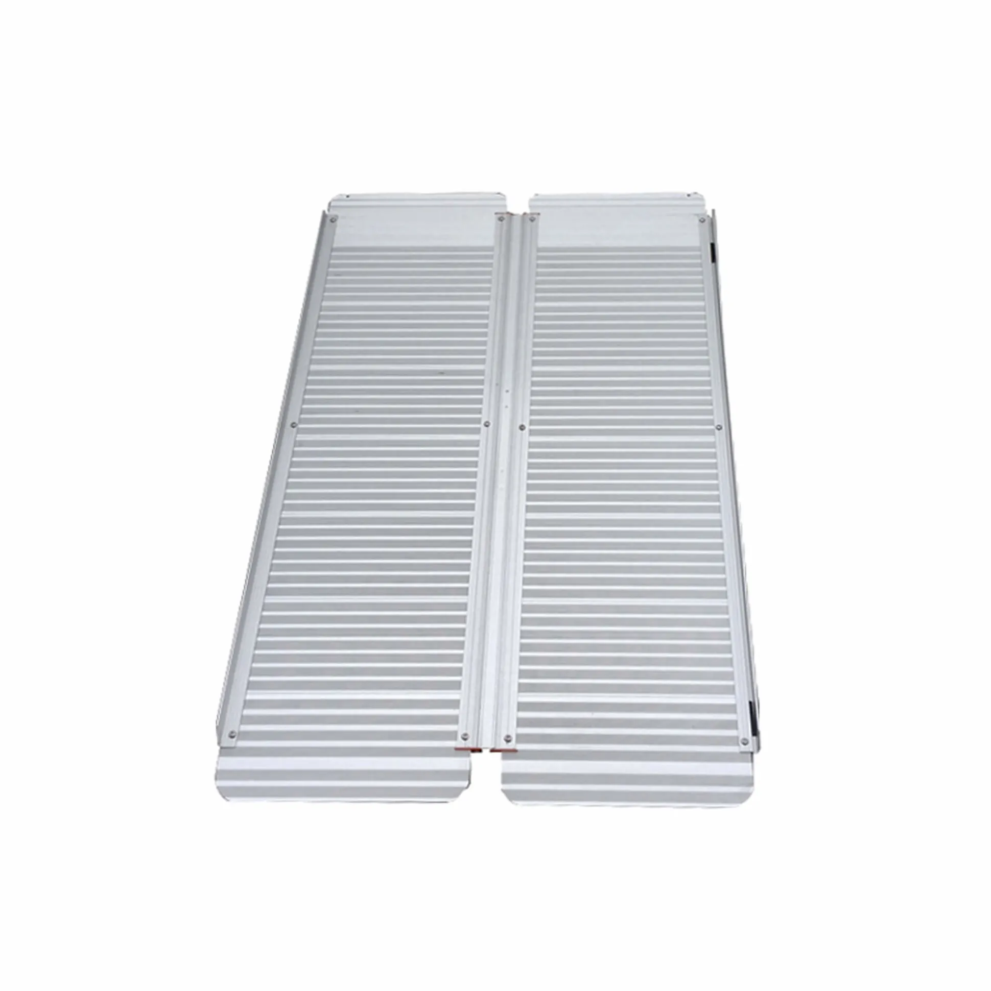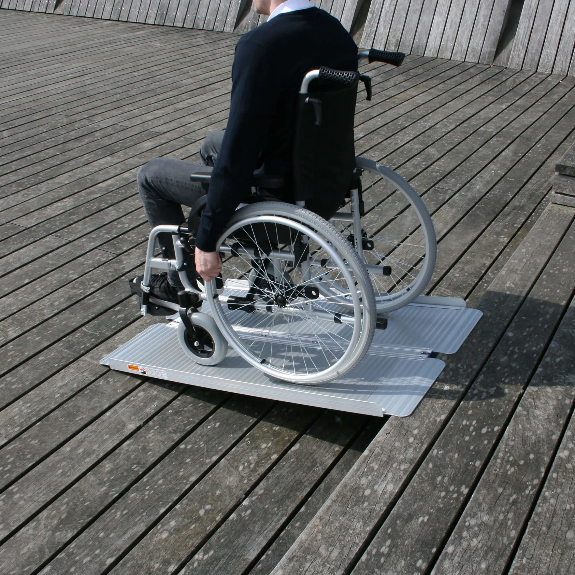 Foldbar rampe som fylder mindre når den ikke er i brug. Med riflet og dermed skridsikker overflade. Ideel til vogne, kørestole, transportbure og lign. Maksimal belastning pr. par: 270 kg.