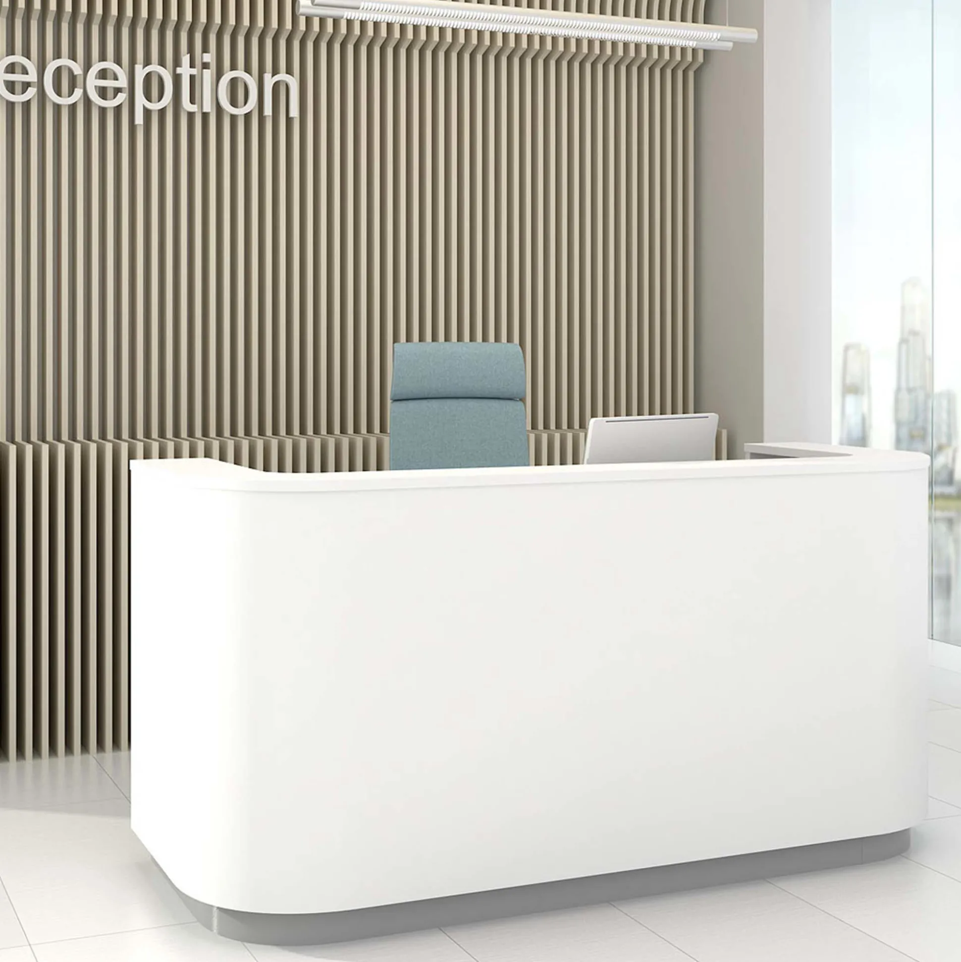 Cubic er en enkel receptionsdisk i hvid laminat. En populær standard løsning i et økonomisk prisniveau. Cubic receptionsdisk kommer med afrundede hjørner der giver et blødt og imødekommende indtryk når der kommer besøgende. Diskens front er lavet i en meget slidstærk CPL laminat og et alu farvet fodspark, der holder til det daglige slid. Toppen og det indvendige skrivebord er lavet i hvid decor laminat.