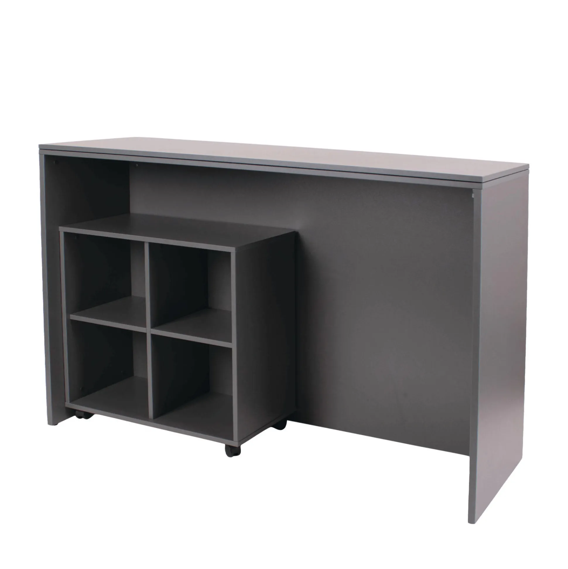 Der er mulighed for at indsætte et skrivebord eller reoler, bag skranken, så du får flere muligheder. Se “Andre købte også”. Denne skranke er med folieprint på fronten, hvor der står “RECEPTION”. Folieprinten monteres efterfølgende af vores montører.