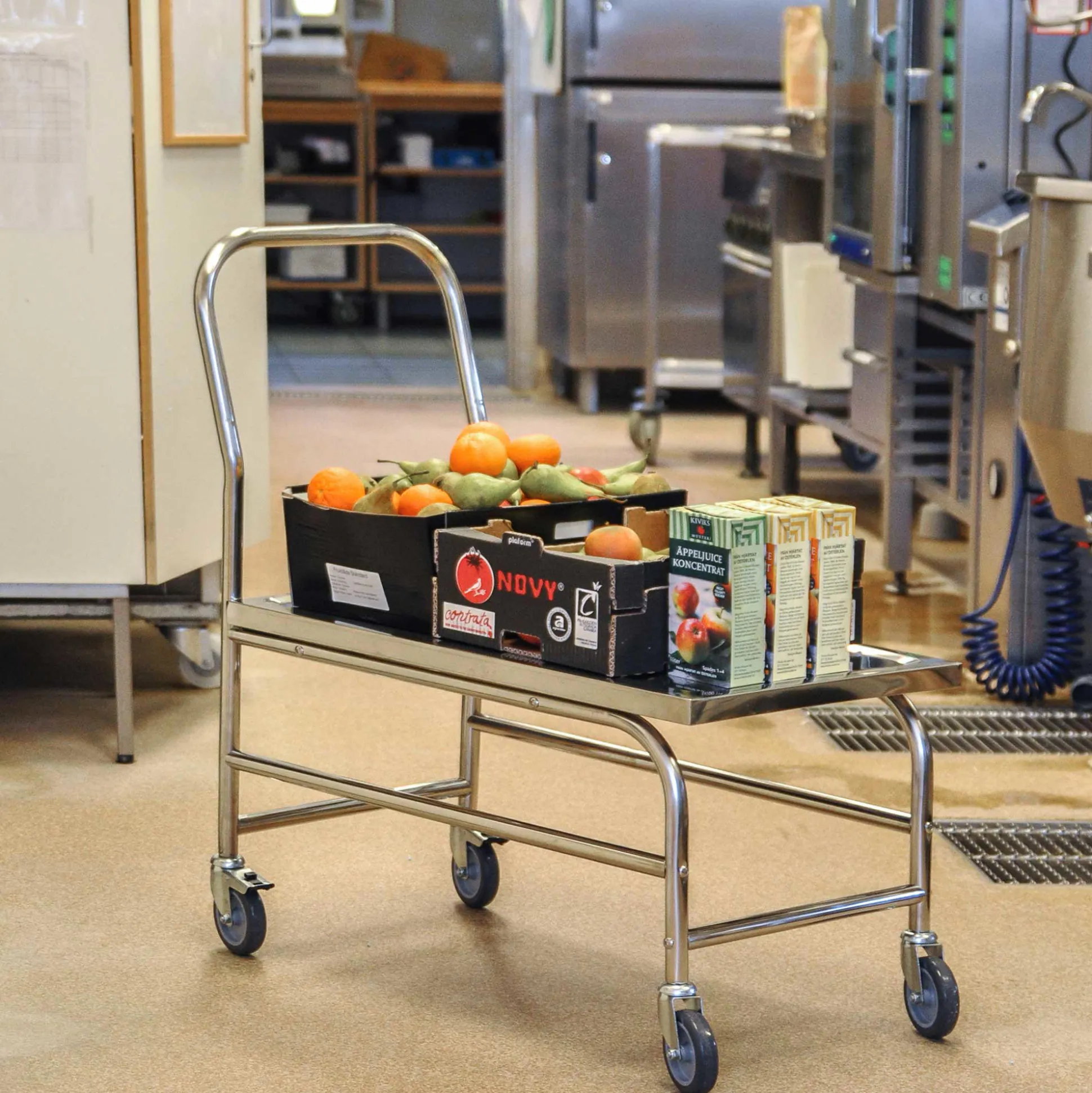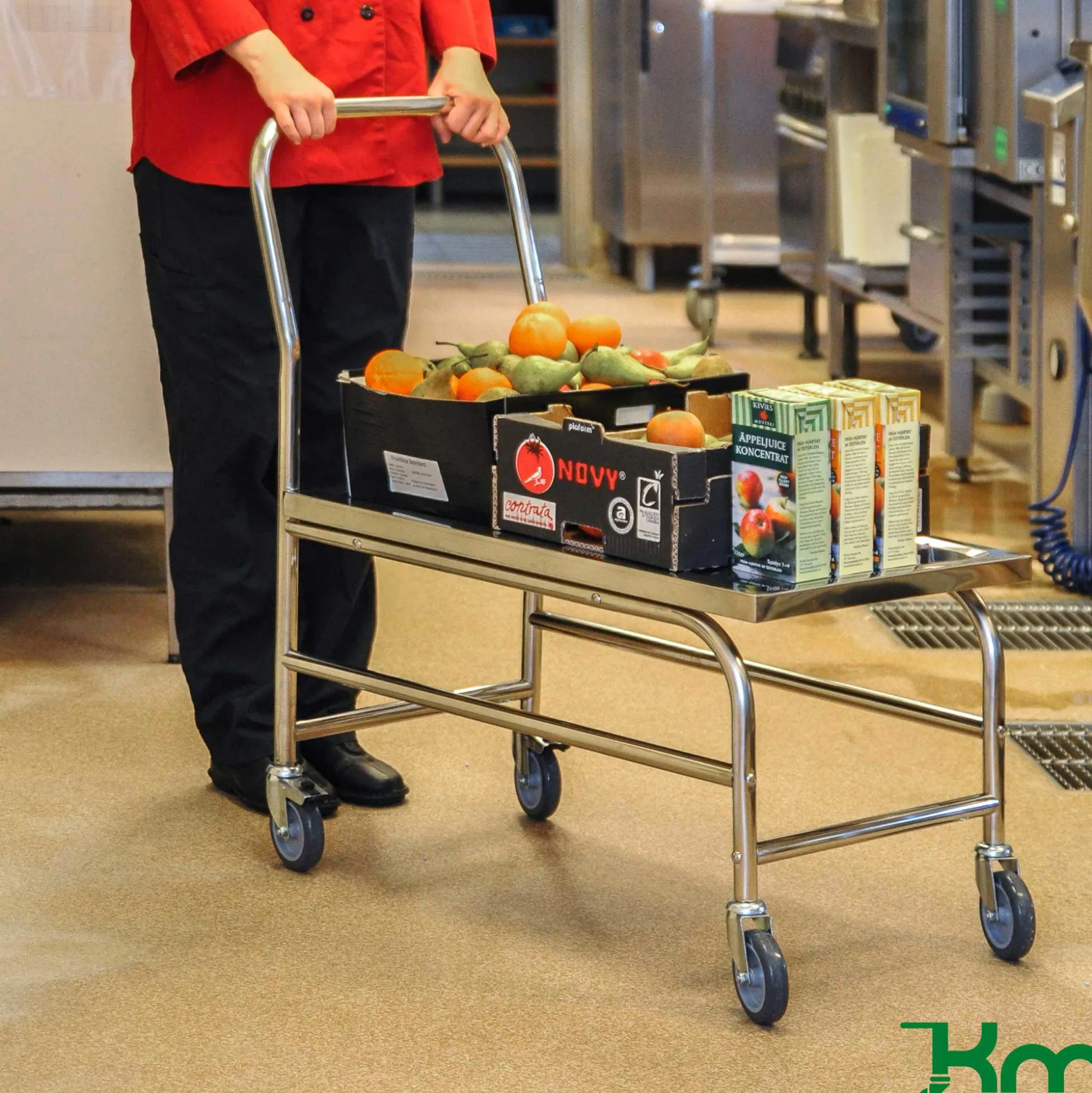 Rustfrit plateauvogn. Mål: 50x88x94h cm. Med 4 svingbare hjul, hvoraf de 2 er låsbare, Ø10 cm. Højde til platform: 47 cm. Belastning: 150 kg. Leveres usamlet.