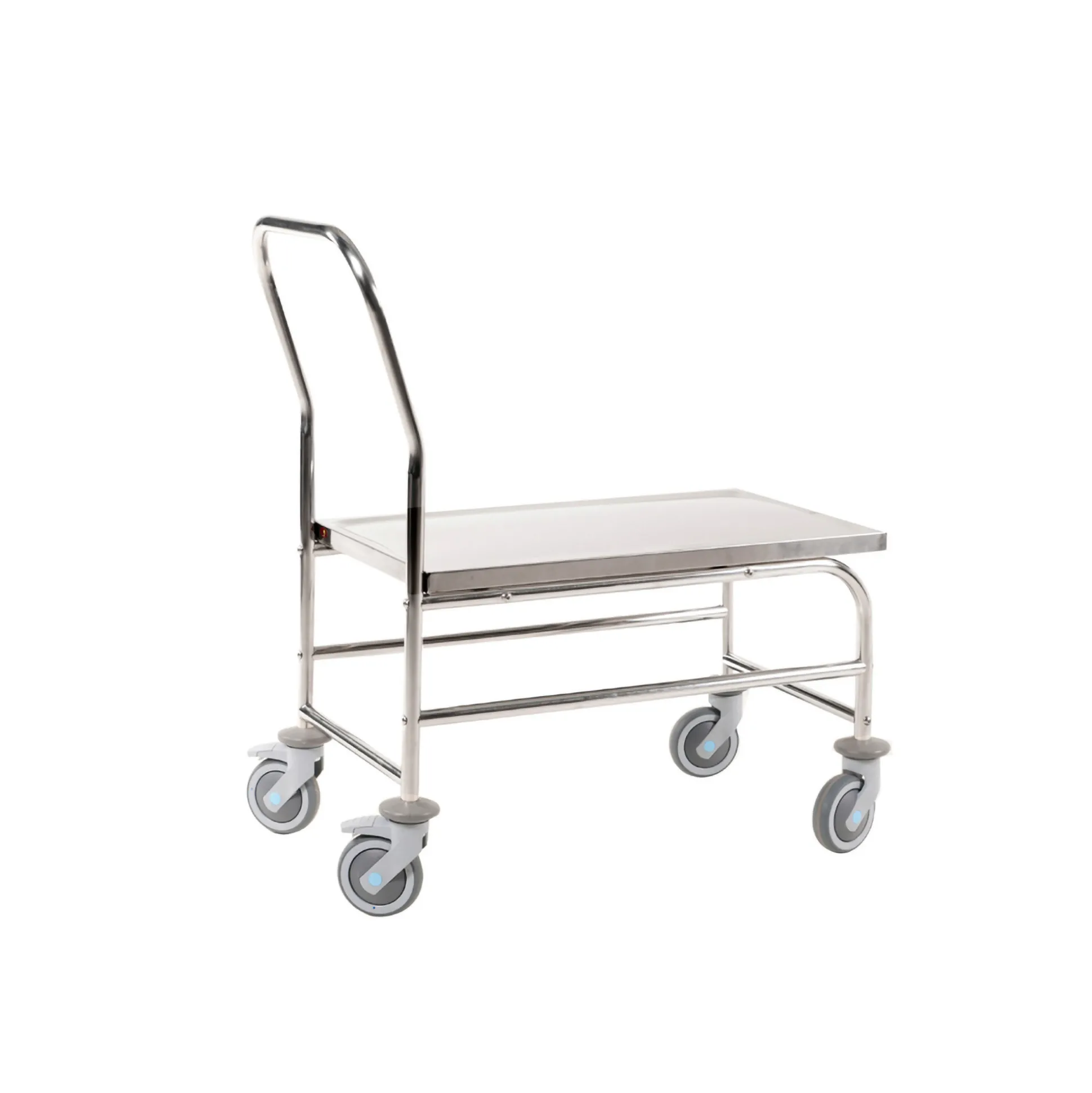 Rustfrit plateauvogn, hvor alt er rustfrit – selv hjulene. Med 4 svingbare hjul med termogummibaner, hvoraf de 2 er låsbare, Ø12,5 cm.