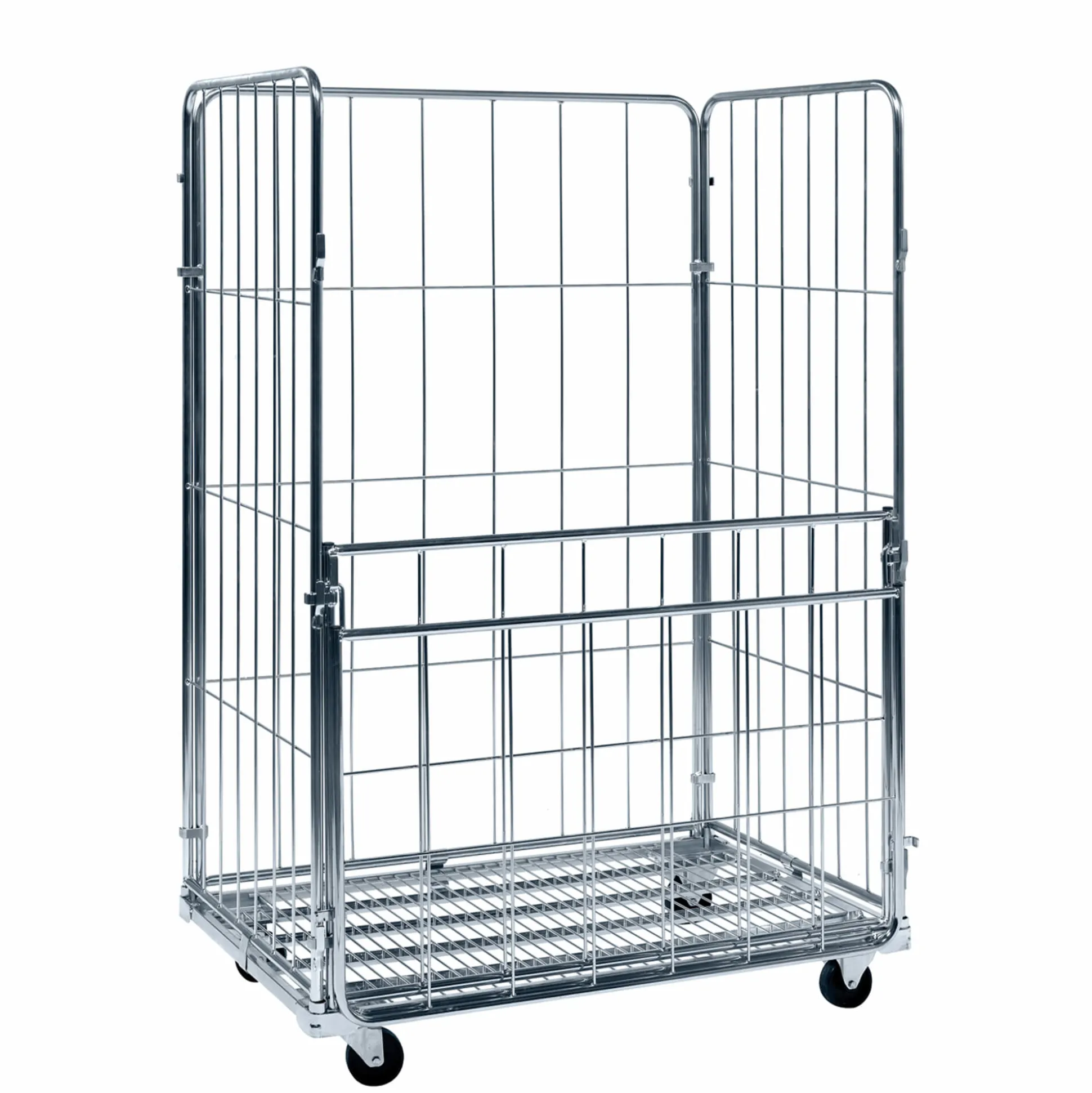 Rullecontainer med 4 vægge, hvor der er åbning på den ene 120 cm side, i form af en halvhængt låge. Udv. mål: 120x80x180h cm.Leveres elforzinket. Med 4 hjul – heraf er 2 svingbare og 2 faste, Ø 10 cm. Samles uden brug af værktøj.
