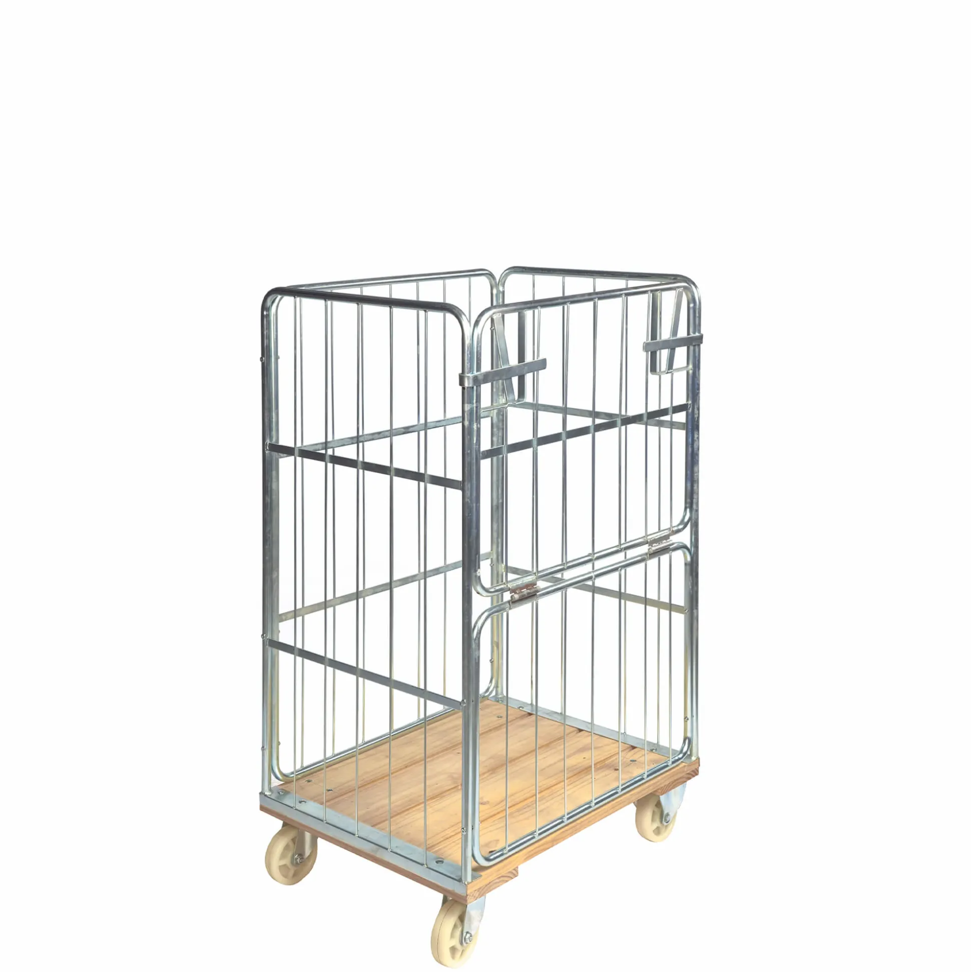 Rullecontainer med træbund, låge og 3 vægge og åbning på 85 cm siden. Udv. mål: 845x630x139 mm. Lågen er i halvhængt og åbner nedad. Leveres elforzinket. Med 4 hjul – heraf er 2 svingbare og 2 faste, Ø 12,5 cm. Mulighed for hylder. Bestilles separat.