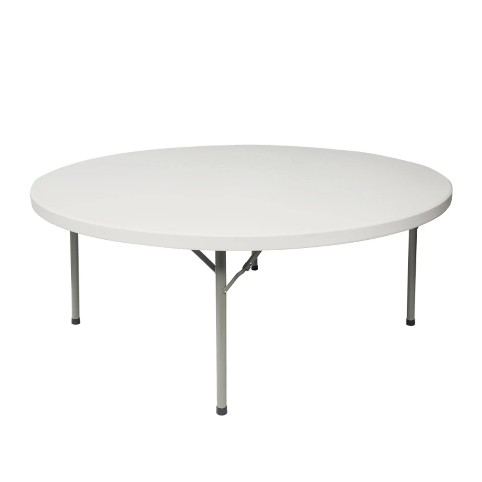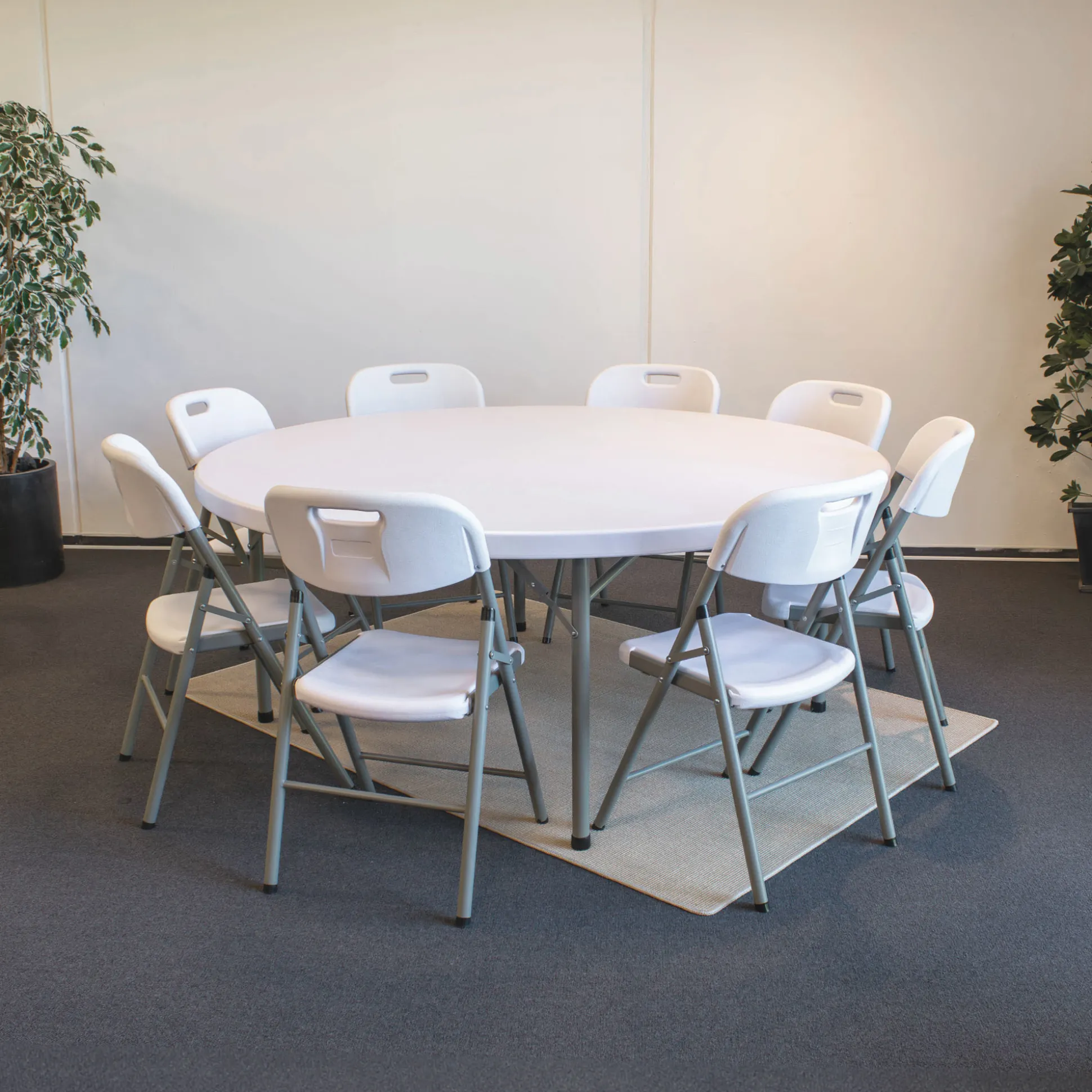 American klapbord Ø180 cm til 8-10 personer. Klapbordet er med et letvægts-stålstel og en helstøbt bordplade i hvid plast. Perfekt til både uden- og indendørsfester.