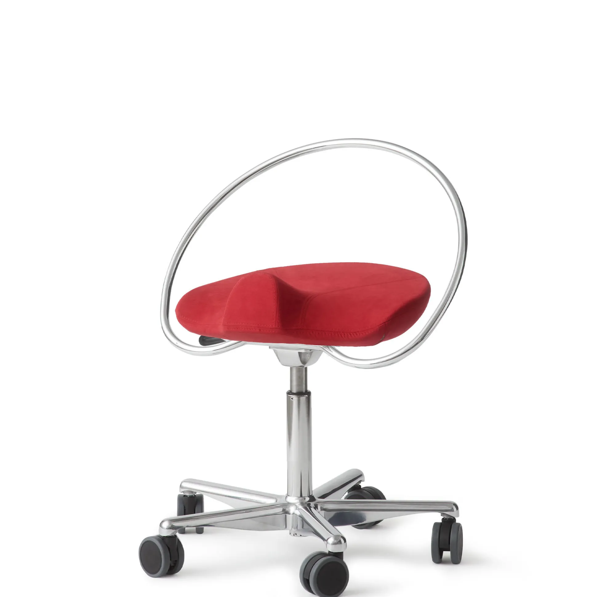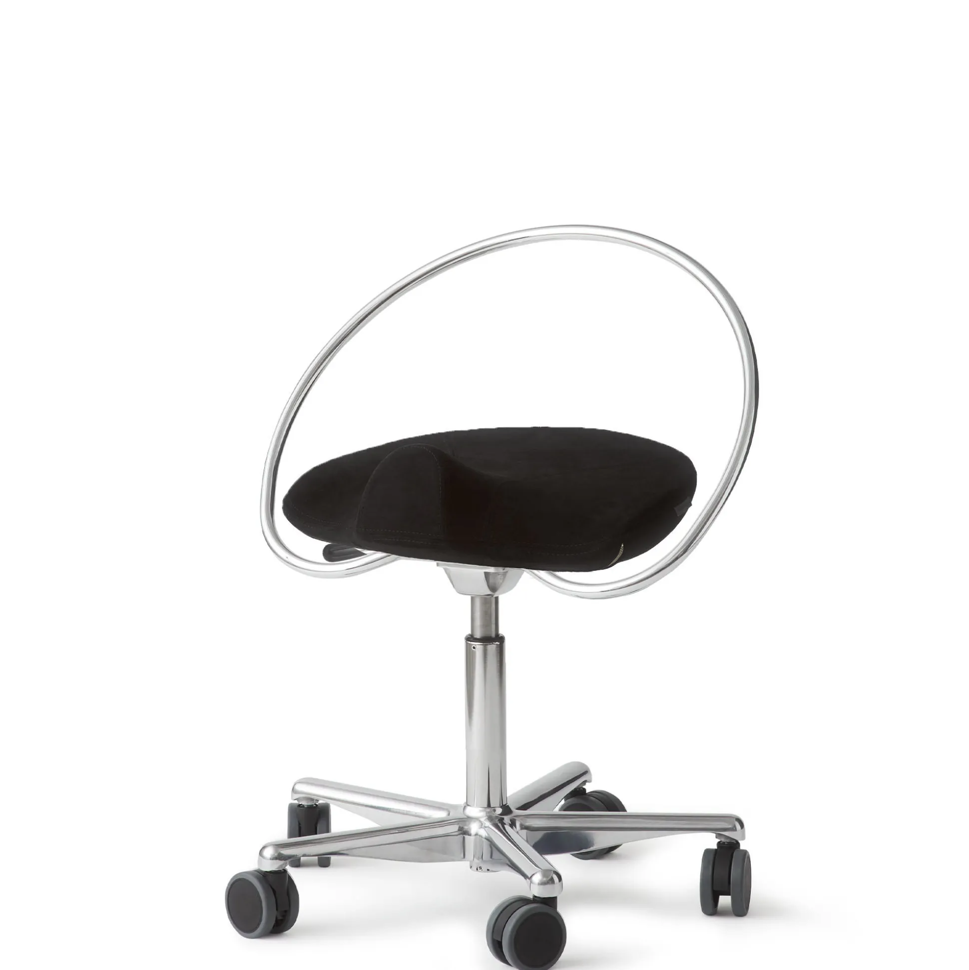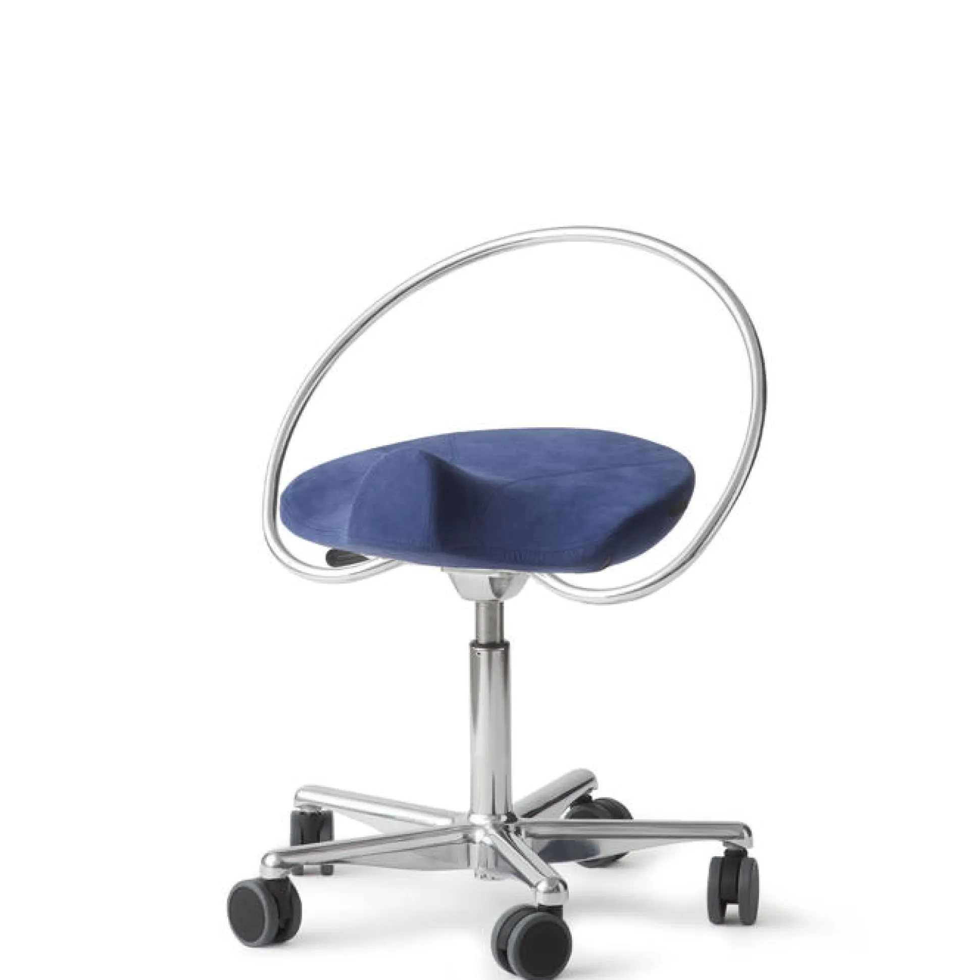 En afrundet metalbøjle som gør det meget nemt at få fat i stolen. For at trække sadelstolen til sig, flytte den væk igen og for at justere retningen på sædet. Bøjlen bruges ikke som ryglæn. Stolen kan bestilles uden bøjlen – kontakt os på mail eller tlf. 70101013.