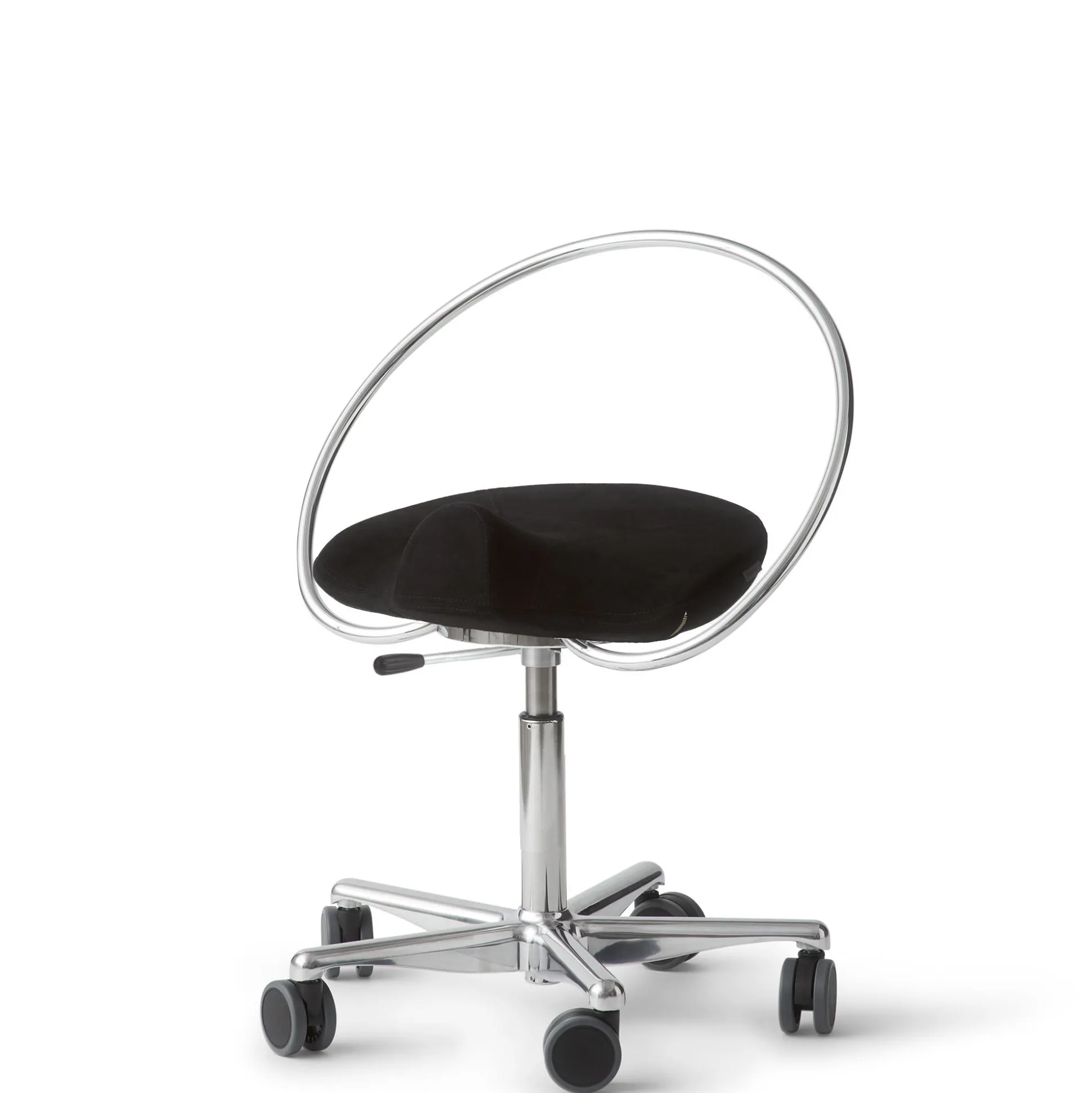 En afrundet metalbøjle som gør det meget nemt at få fat i stolen. For at trække sadelstolen til sig, flytte den væk igen og for at justere retningen på sædet. Bøjlen bruges ikke som ryglæn. Stolen kan bestilles uden bøjlen – kontakt os på mail eller tlf. 70101013.