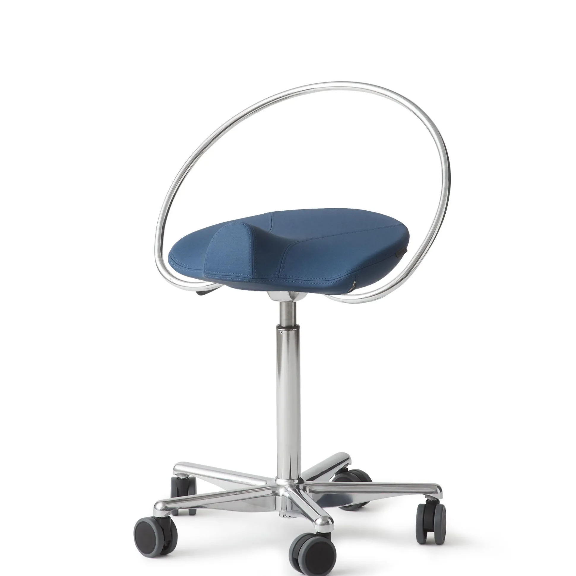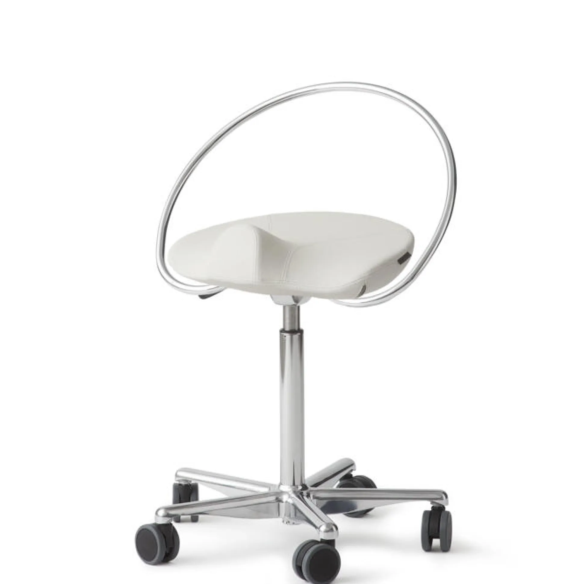 En afrundet metalbøjle som gør det meget nemt at få fat i stolen. For at trække sadelstolen til sig, flytte den væk igen og for at justere retningen på sædet. Bøjlen bruges ikke som ryglæn. Stolen kan bestilles uden bøjlen – kontakt os på mail eller tlf. 70101013.