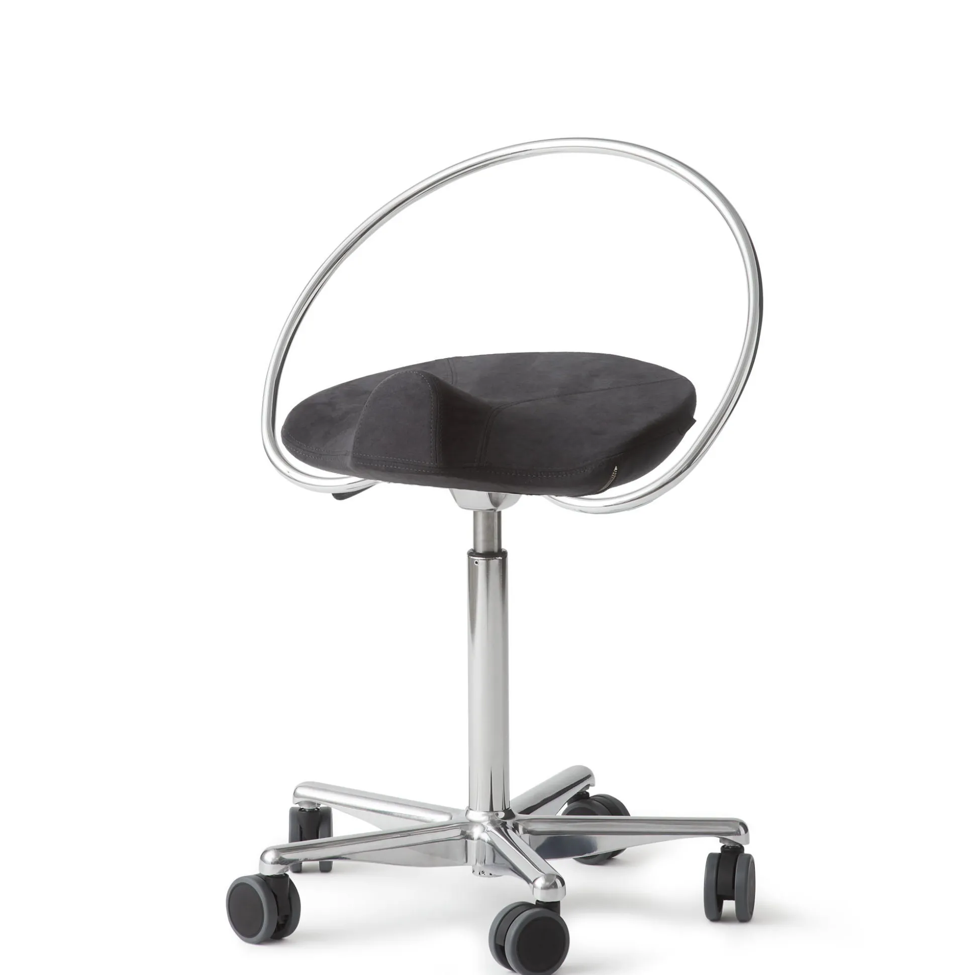 En afrundet metalbøjle som gør det meget nemt at få fat i stolen. For at trække sadelstolen til sig, flytte den væk igen og for at justere retningen på sædet. Bøjlen bruges ikke som ryglæn. Stolen kan bestilles uden bøjlen – kontakt os på mail eller tlf. 70101013.