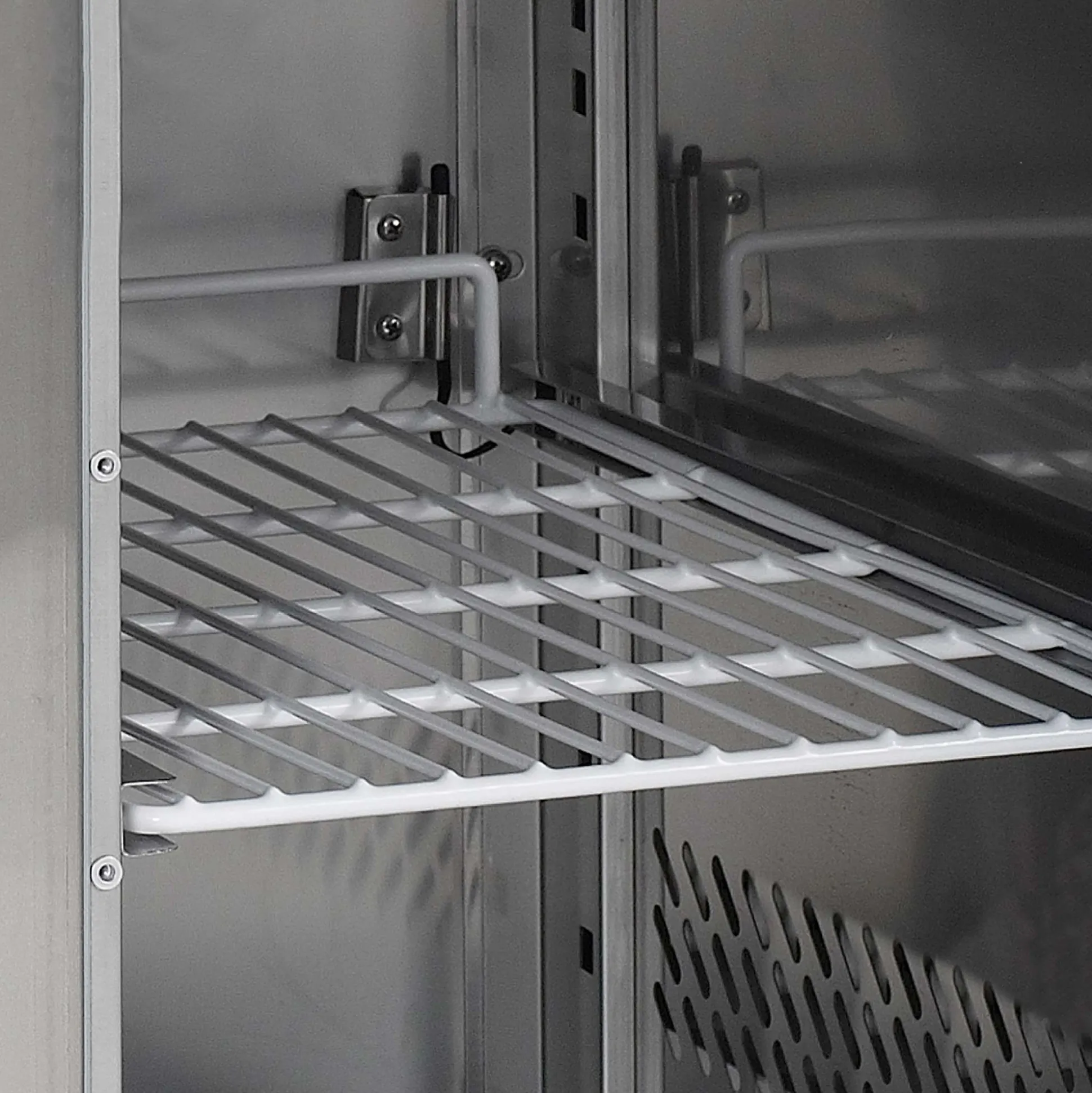 SA1365 saladette er bygget i høj kvalitets SS304 rustfrit stål både indvendigt og udvendigt, hvilket sikrer lang holdbarhed og god hygiejne. Med en åben top designet til GN1/1 kantiner og 3 hængslede, skummede døre, tilbyder denne saladette optimal funktionalitet og nem adgang til indholdet. De fire justerbare fødder gør det muligt at tilpasse højden efter behov, og de 3 medfølgende hvide trådhylder kan bære op til 110 kg/m².