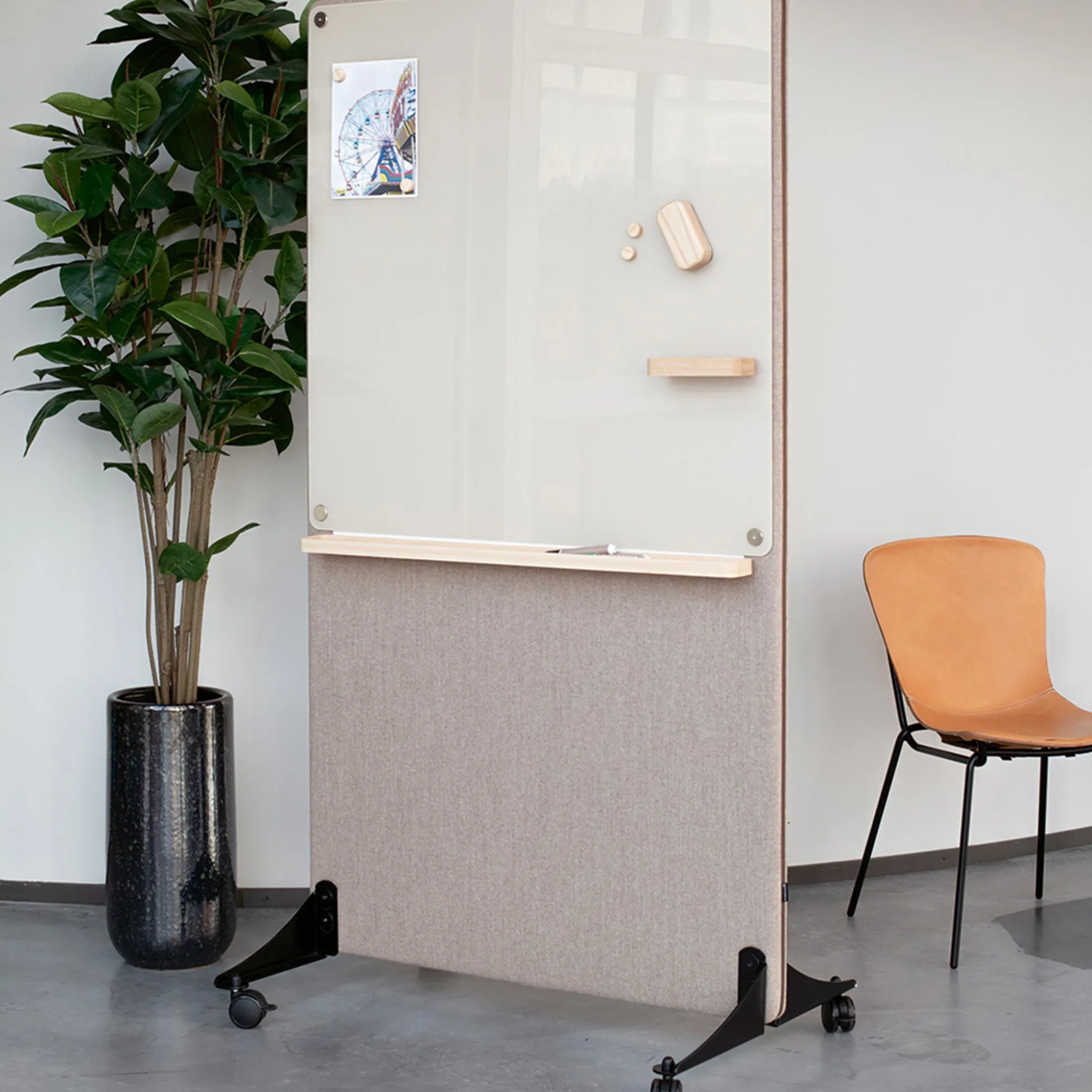 Smart gulvskærm med en integreret glastavle der er med til at skabe et støjsvagt og funktionelt arbejdsmiljø. Den lydabsorberende skærmvæg på hjul er konstrueret med en solid træramme, der er fyldt med 40 mm lydabsorberende materiale og dækket af 5 mm skumlamineret stof på begge sider.